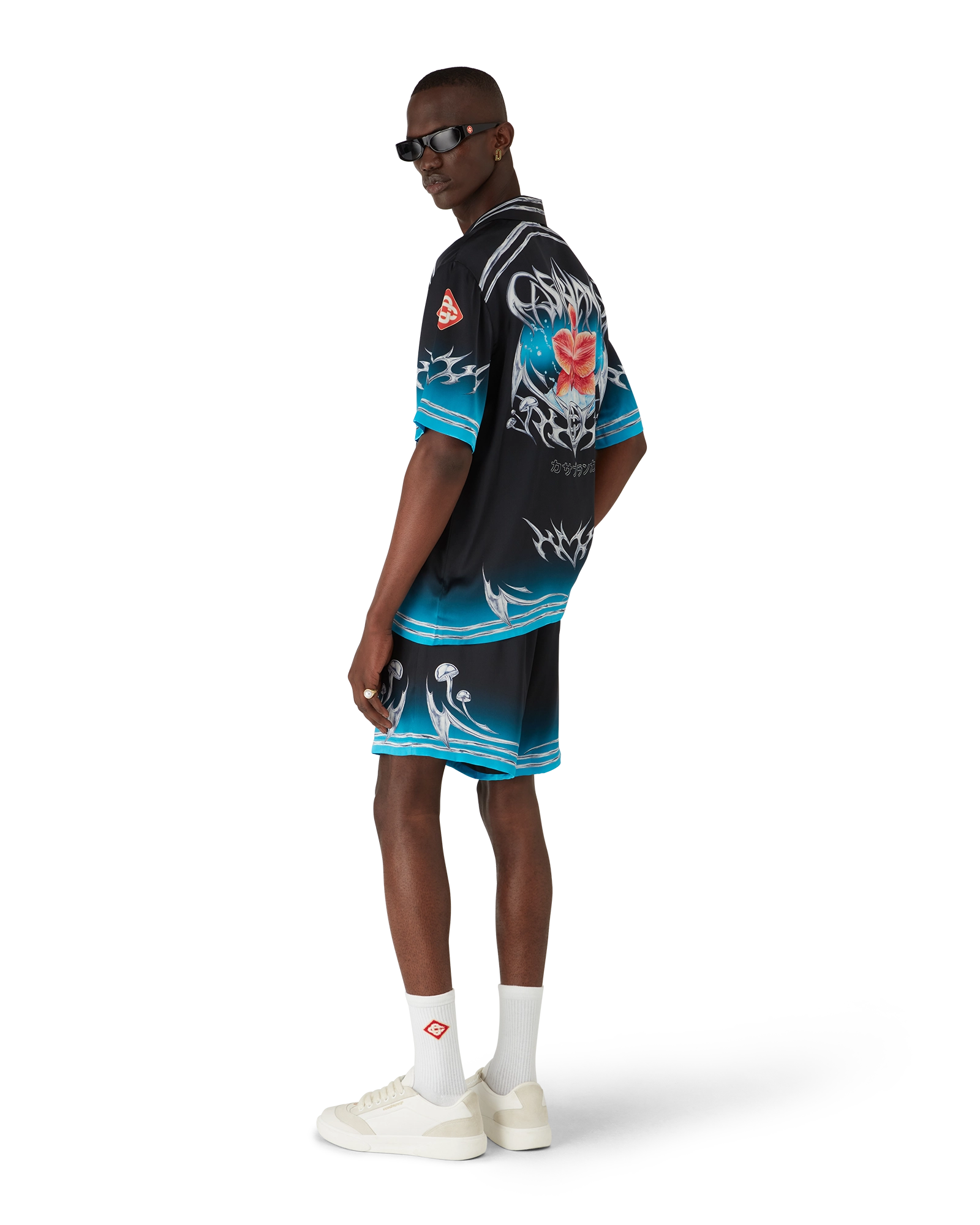The Blades silk satin short sleeve shirt is a printed design featuring artwork that play with the contrast between two opposing feelings – the sharpness of the blade and the cold. silver chrome. contrasted with the warmth of nature. like the bold pink and red tones of an orchid flower. The addition of water brings a fresh. crisp element to the design. Completed with a Cuban collar. a breast pocket. a button closure. and signature interlocking CC corozo buttons.