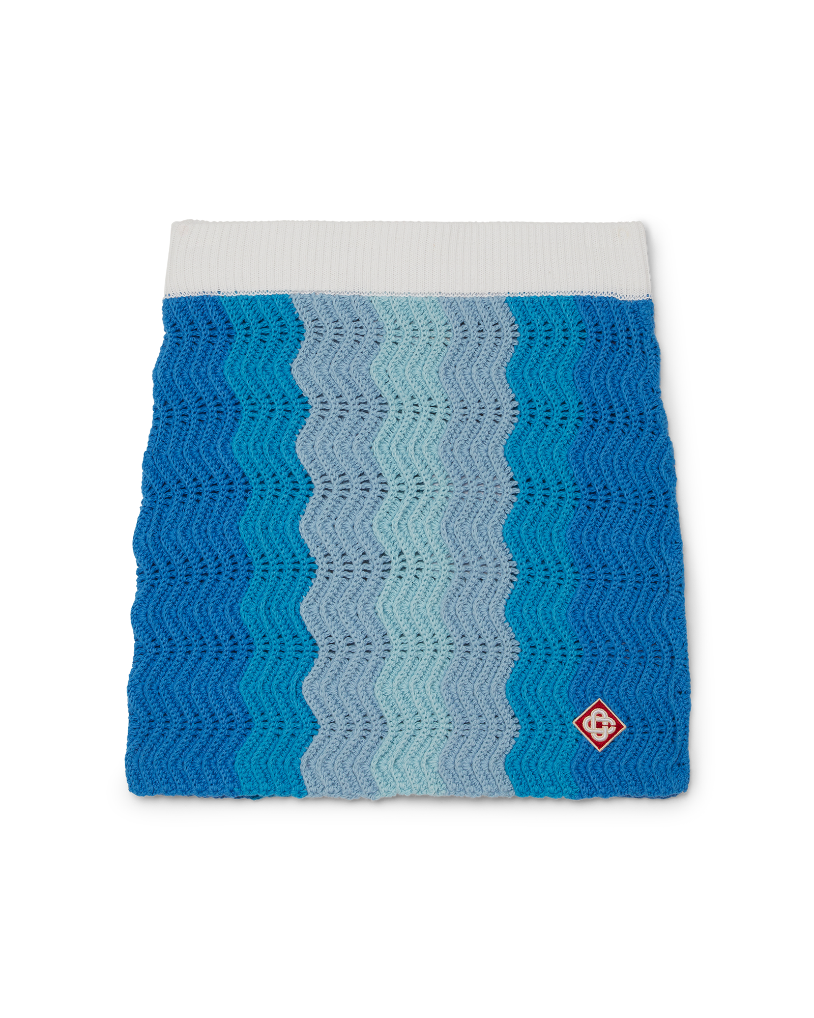 The blue gradient crochet skirt is a mini style crafted from cotton fabric. featuring vertical wave-inspired gradient stripes and designed with a slim fit. Completed with a contrast white rib elasticised waistband and the house’s signature diamond logo.