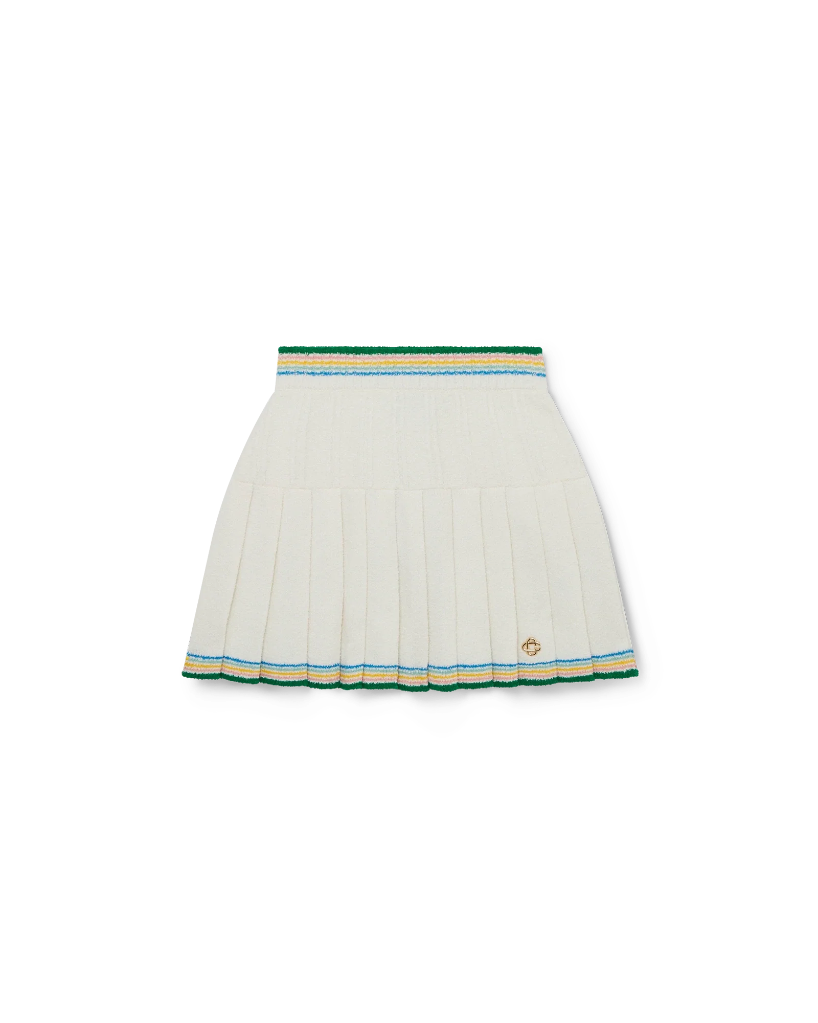 The boucle pleated skirt is a soft texture mini-skirt design with a fixed yoke crafted from a ribbed boucle fabric. Completed with a pleated panel below. a ribbed elasticated waistband. multi-colour stripe details on the hem and waistband. and the house’s gold-plated interlocking CC rivet. The colour palette for this collection is light and idealistic. emphasising ethereal themes core to our brand.