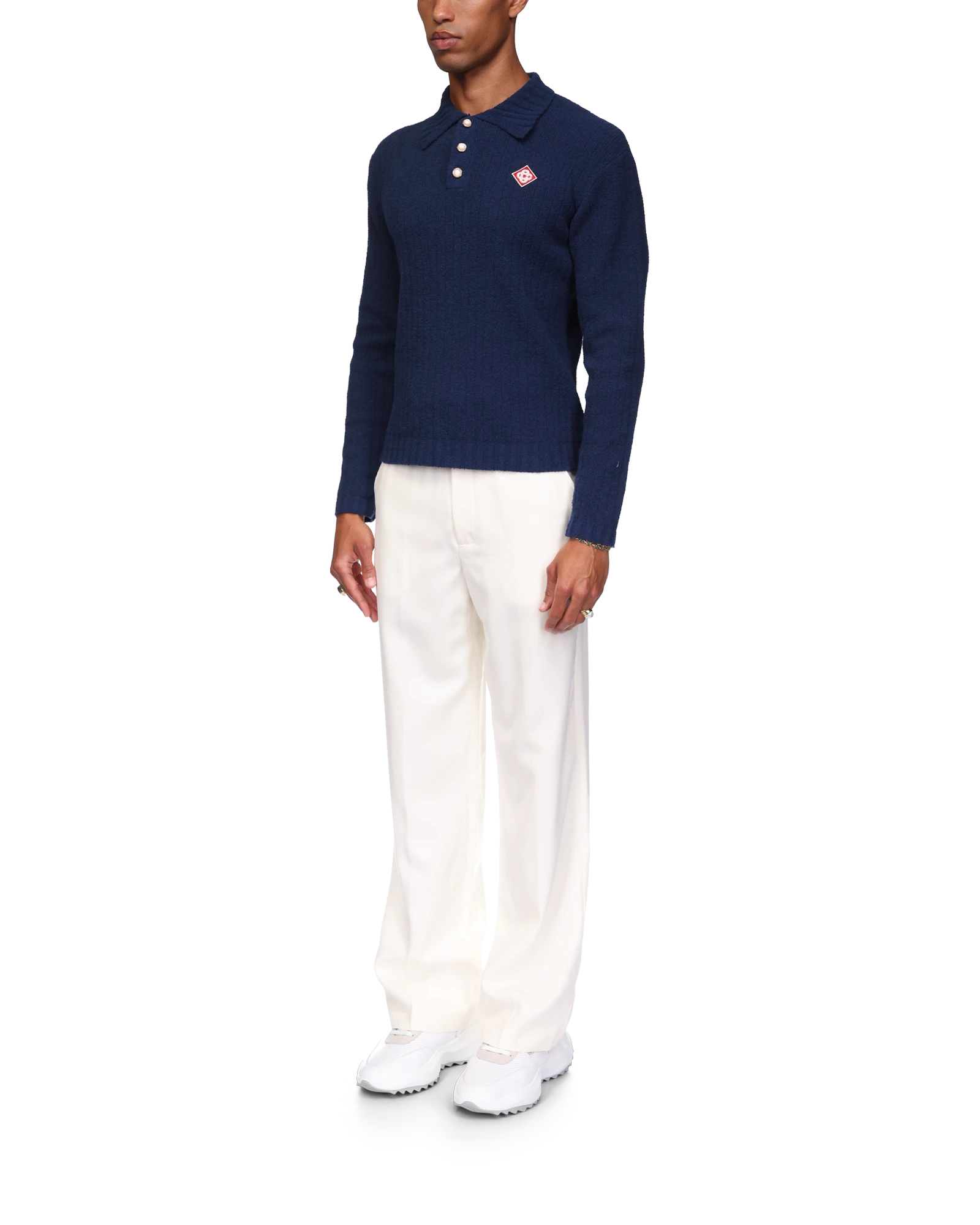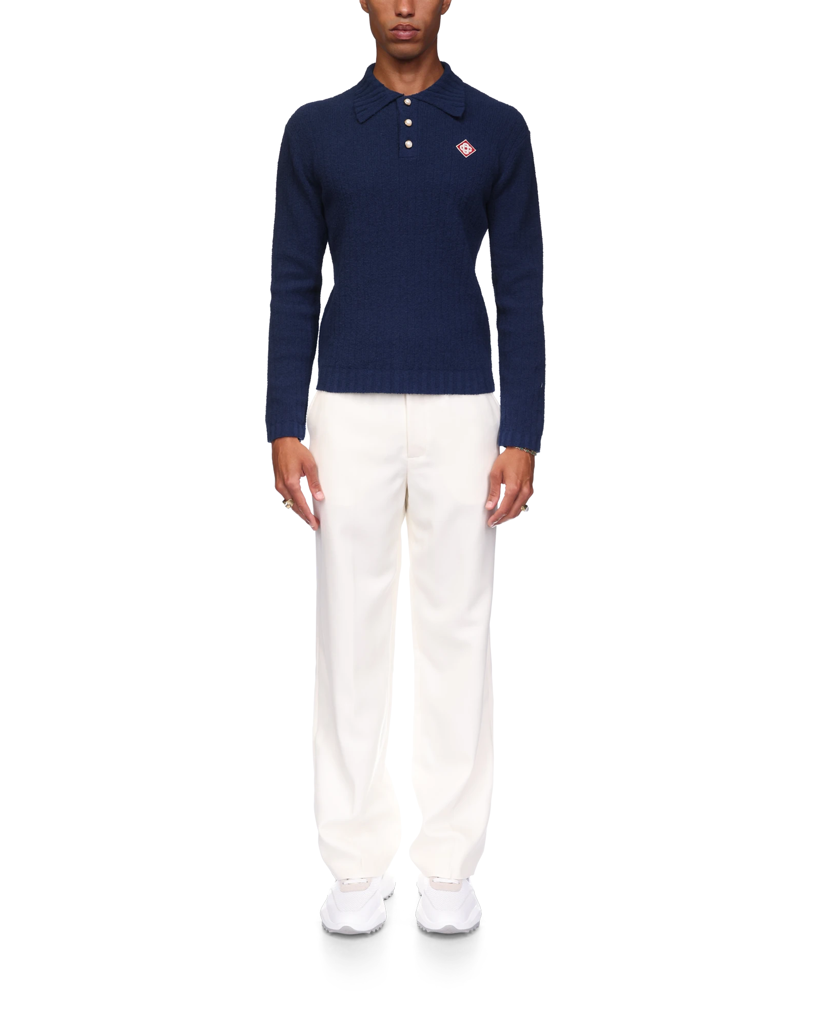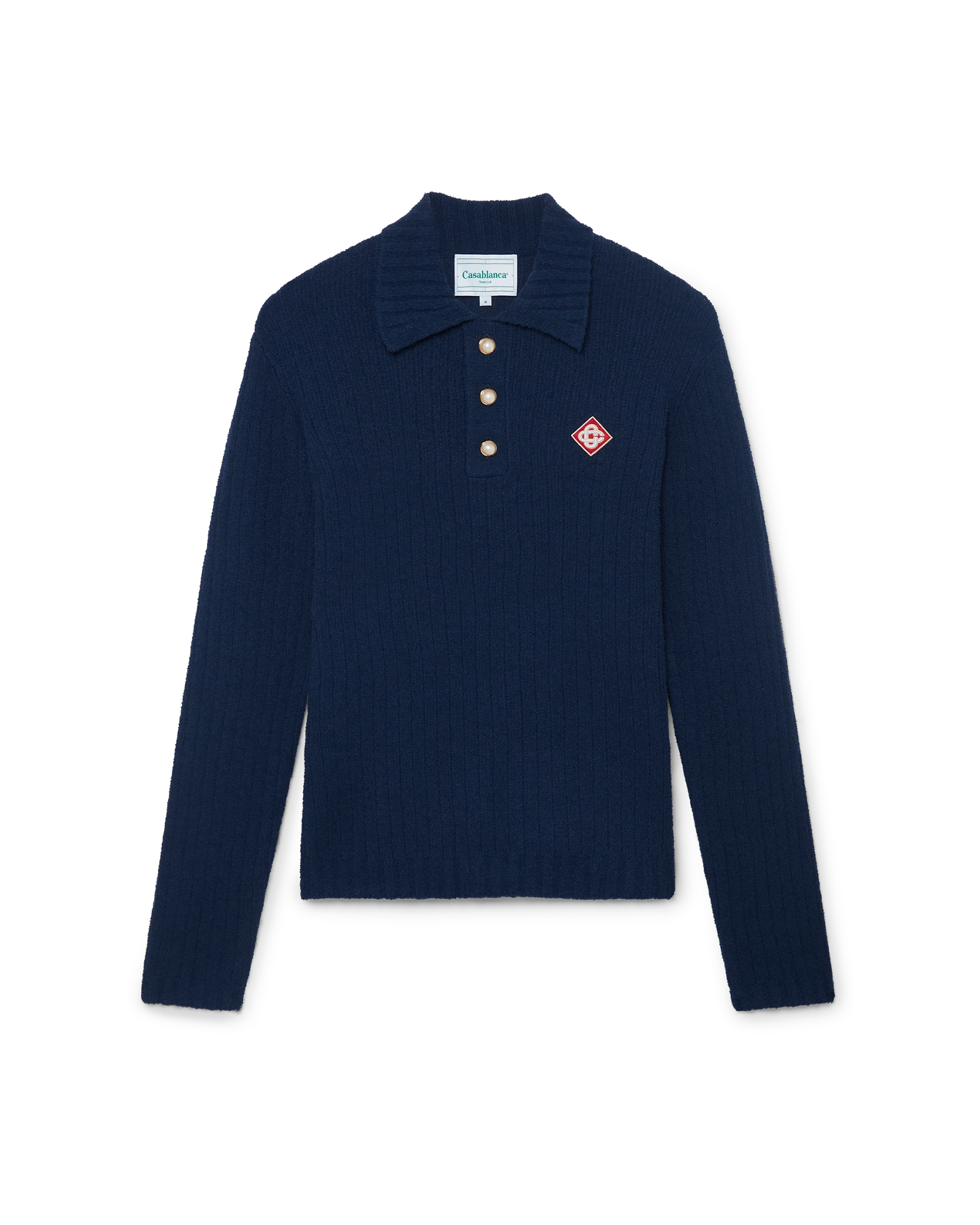 The boucle polo shirt is a long-sleeved design crafted from a cotton blend fabric featuring the house’s signature diamond logo. Completed with signature gold rim pearl buttons. and a rib collar. cuffs. placket. and hem.