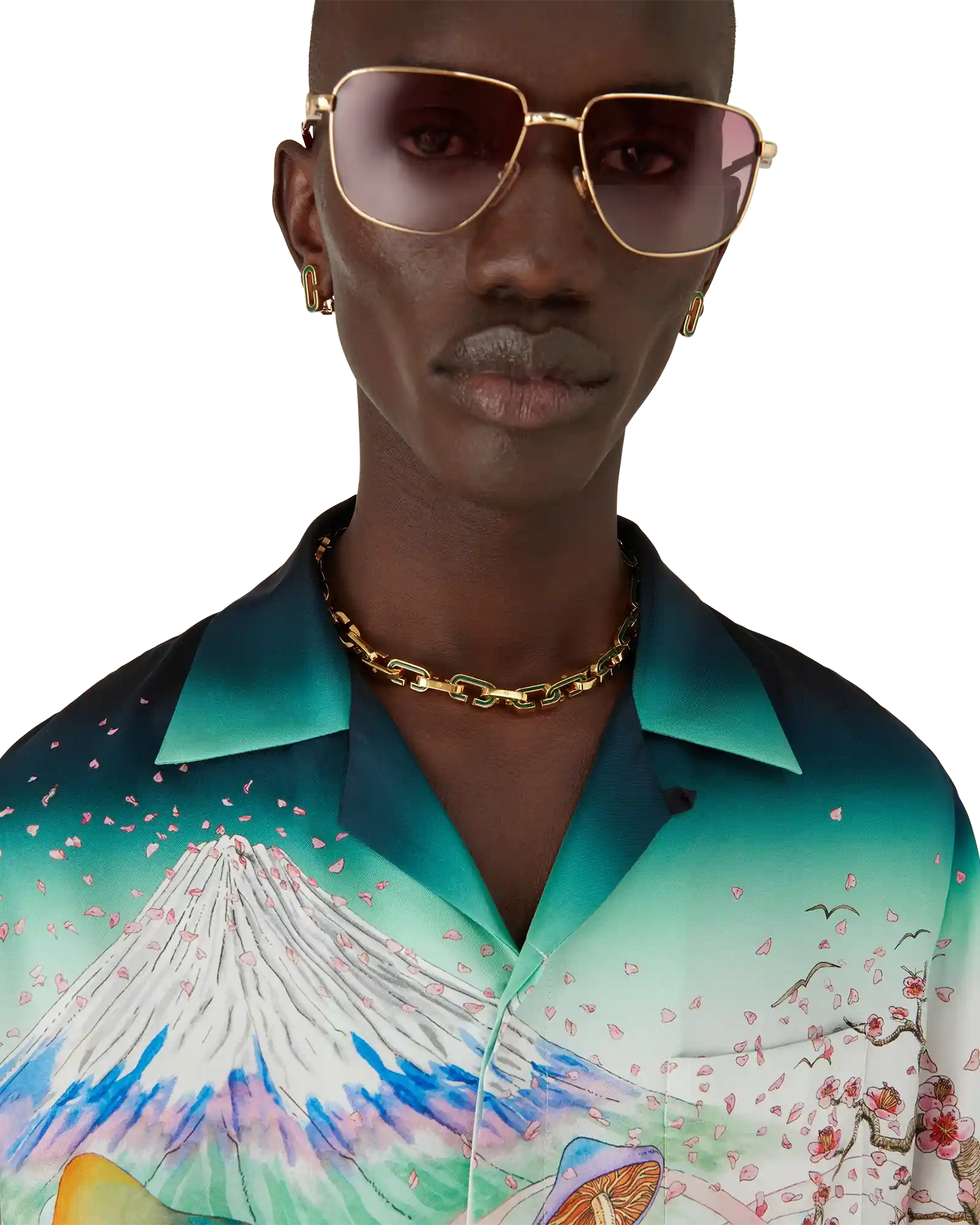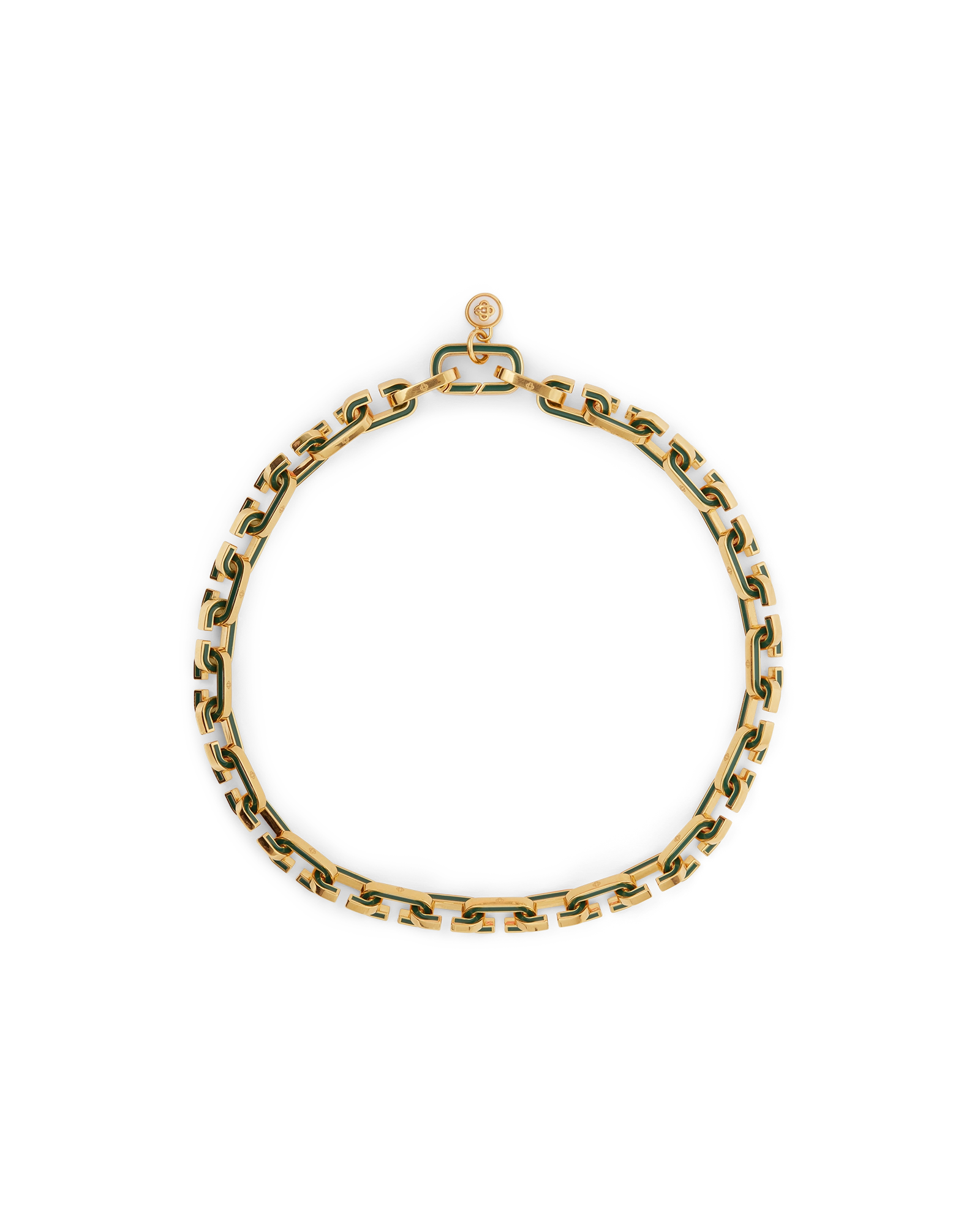 The ‘C’ link necklace is crafted from gold-plated brass and enamel. Completed with a green hand-painted enamel ‘C’ link gold-plated chain.