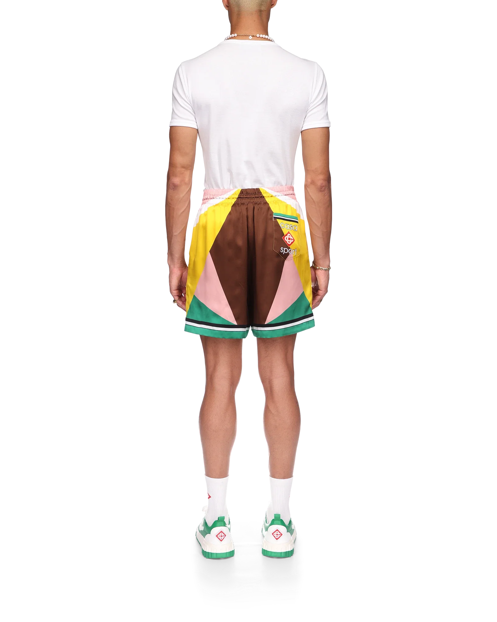 The Casa Sport silk short is a printed design. crafted from a silk satin fabric and features geometric panels of colours and the house’s Casa Sport logo. Completed with side pockets. an elasticated waistband and drawstring fastening.