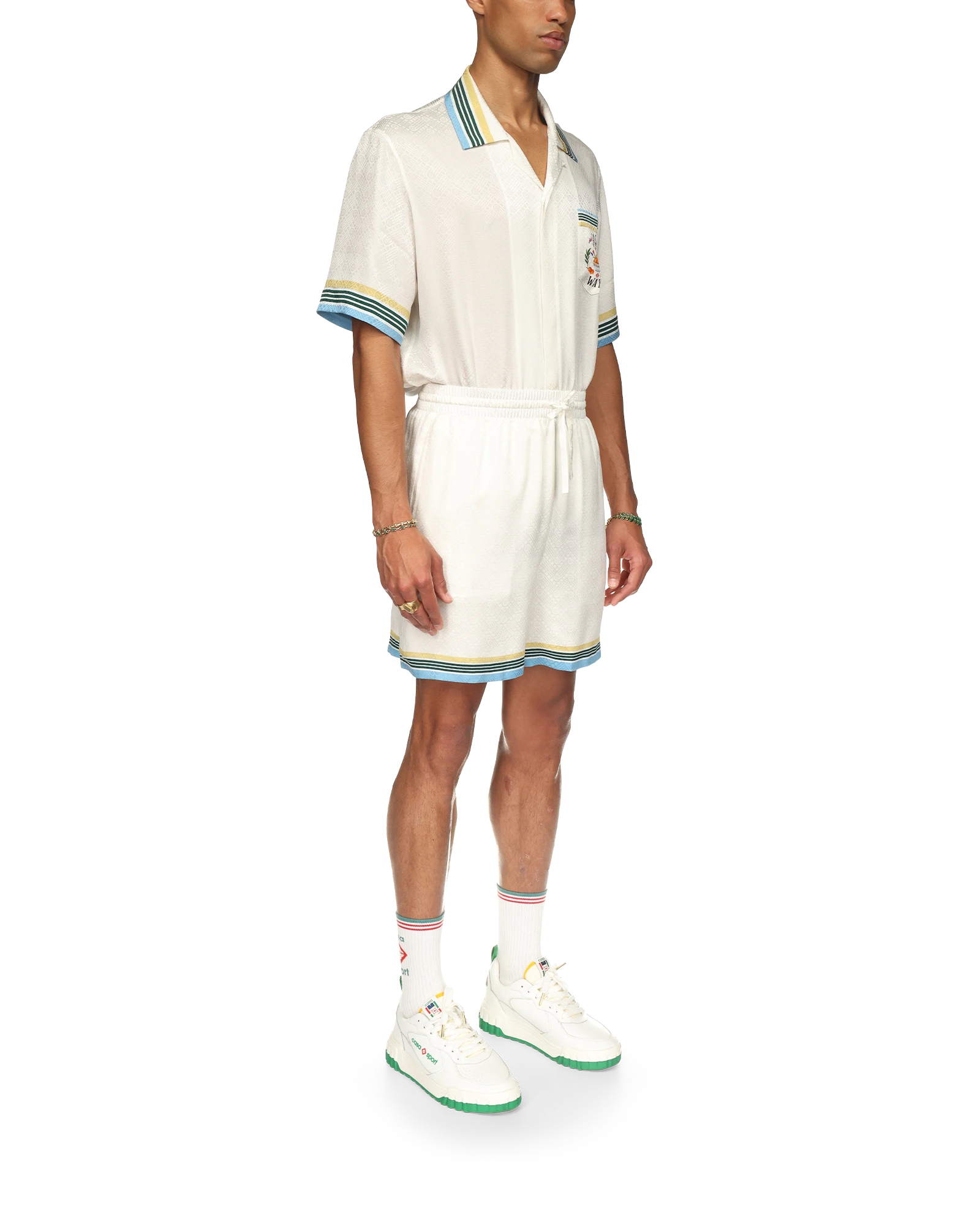 The Casa Way silk shorts are crafted from a silk fabric and feature the house’s iconographic artwork on the back pocket. Finished with in-seam pockets. an elasticated waist. drawstring fastening. and striped contrast detail around the hem and back pocket.