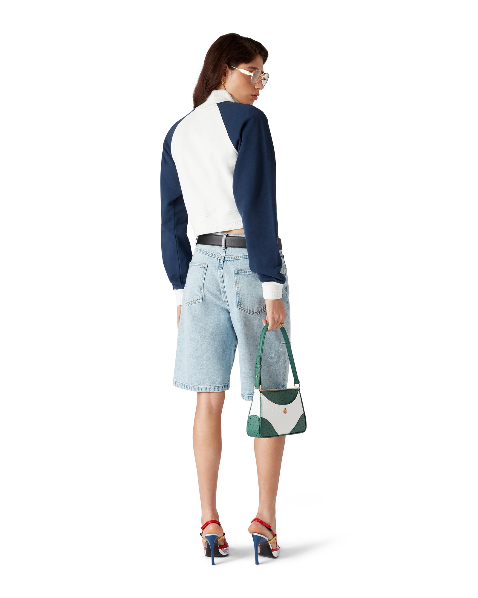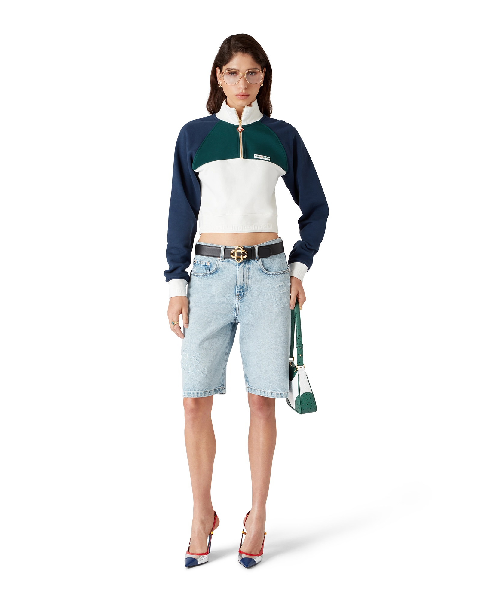 The colourblock quarter zip cropped sweatshirt is a long-sleeve sportswear design crafted from organic cotton fabric. Completed with the house’s Casablanca logo. colourblock panels. rib collar. cuffs and hem with stripe details.