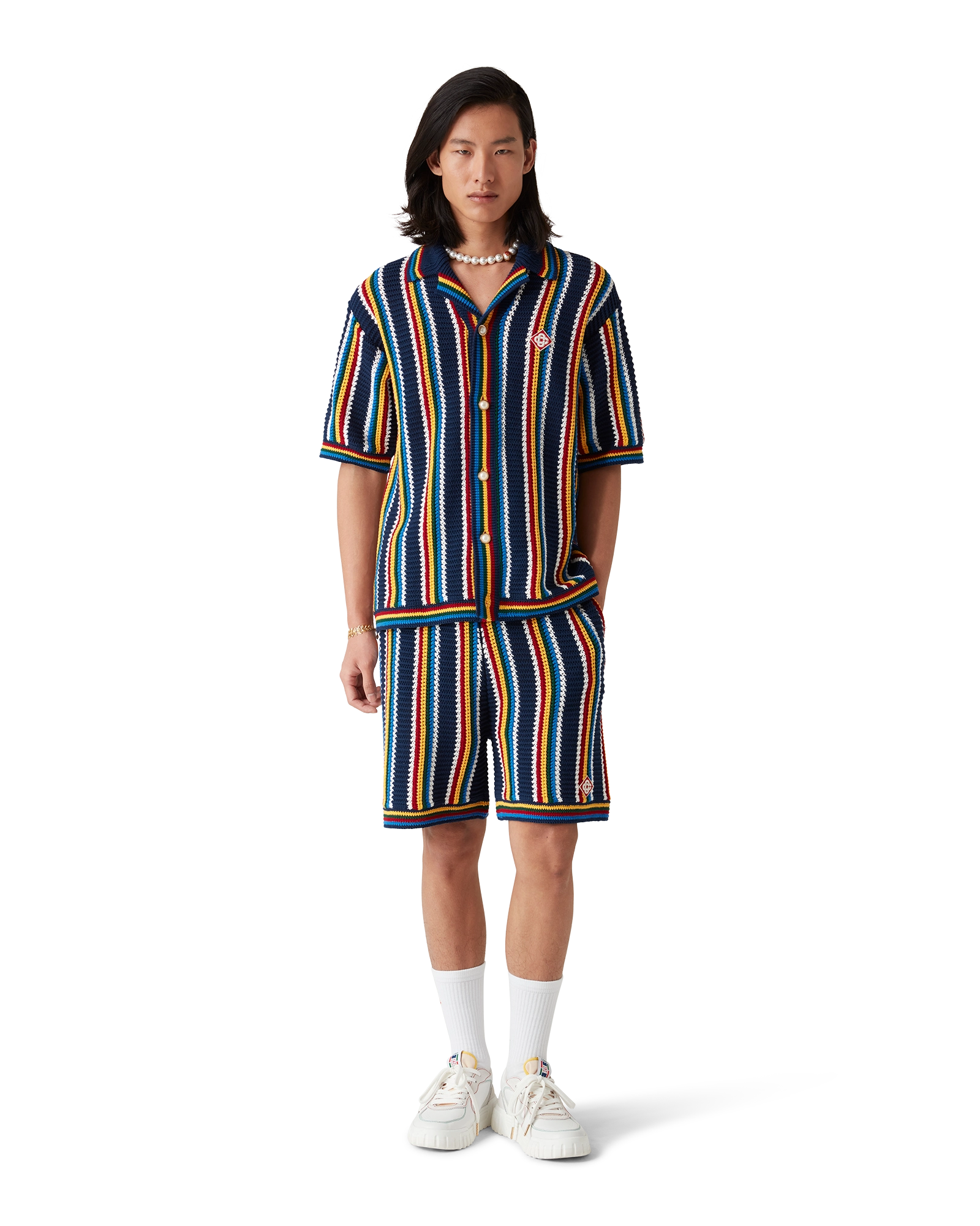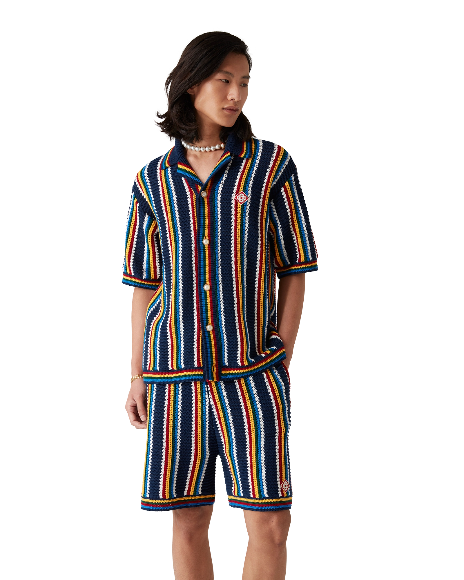The crochet stripe shirt is a short-sleeve design crafted from cotton-blend crochet fabric featuring the house’s signature diamond logo. Completed with a rib collar. cuffs. hem and placket. signature gold rim pearl buttons. and front button closure.