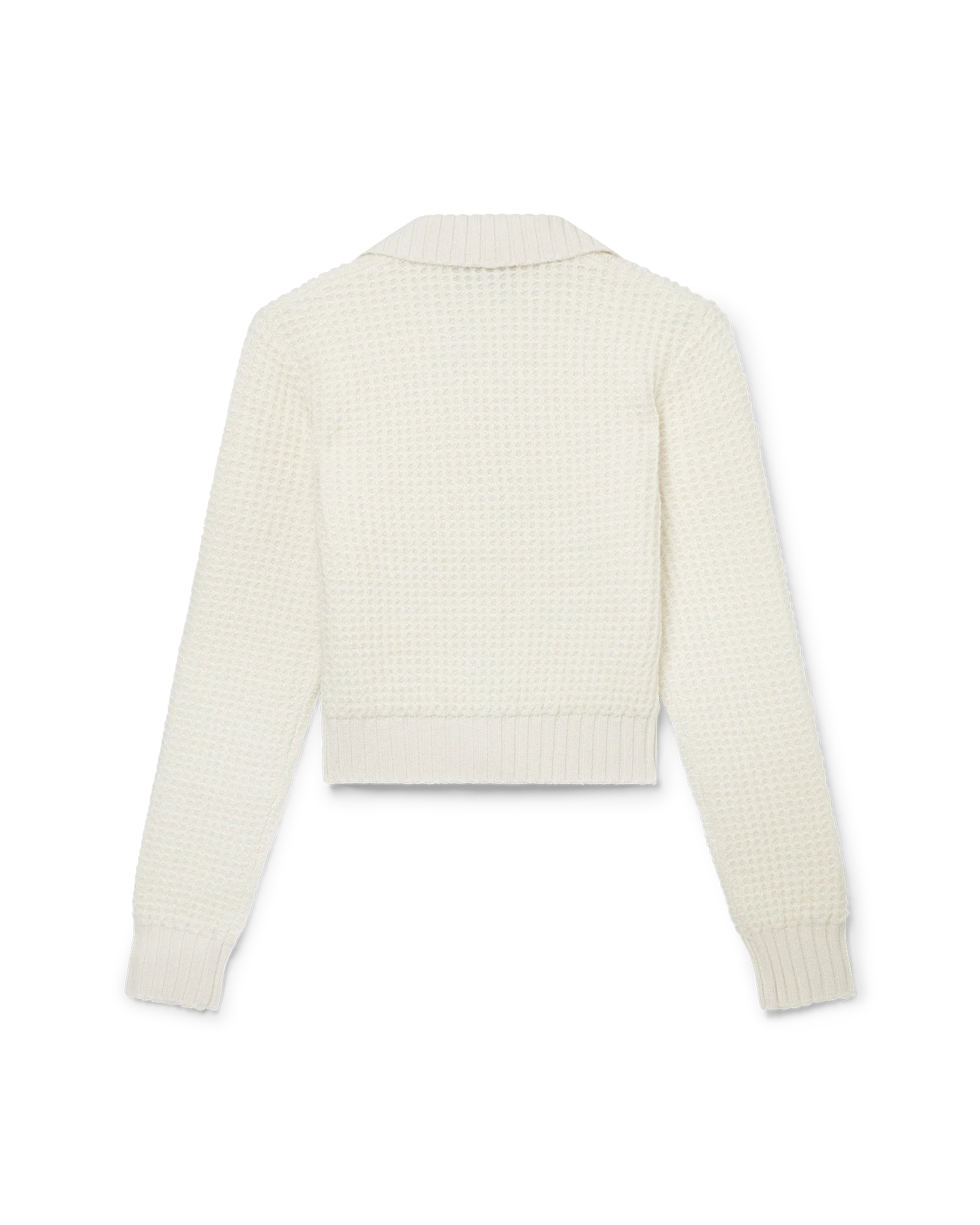 The cropped waffle knit cardigan is a v-neck style crafted from a mohair-blend fabric with a waffle texture featuring the house’s diamond logo and signature gold rim pearl buttons. Finished with a rib collar. cuffs and hem. and button closure.