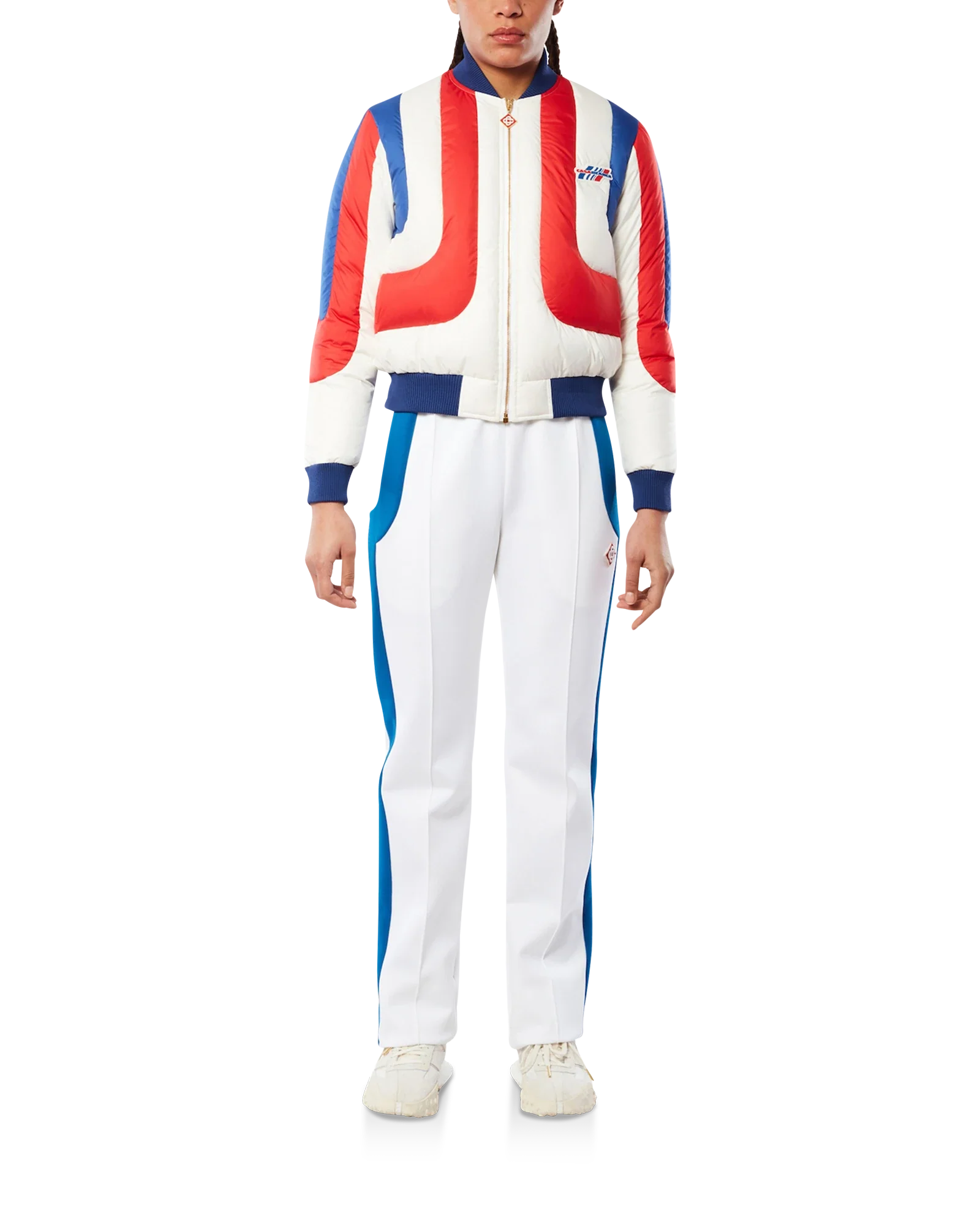 The curve panel puffer bomber jacket features a zipper closure with the house’s diamond logo and embodies the palette of France’s Tricolore. Completed with zip pockets. and a contrast rib collar. cuffs and hem.