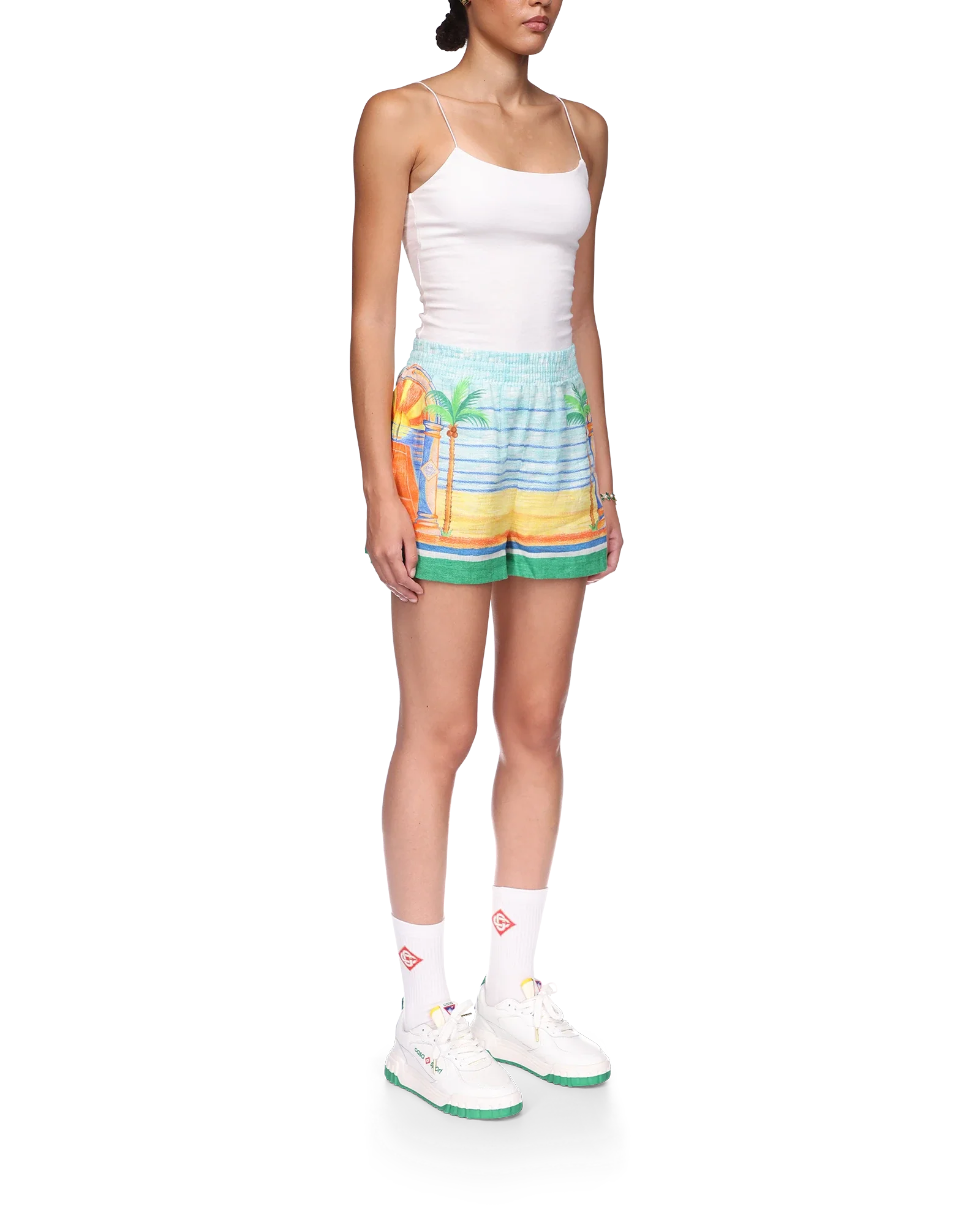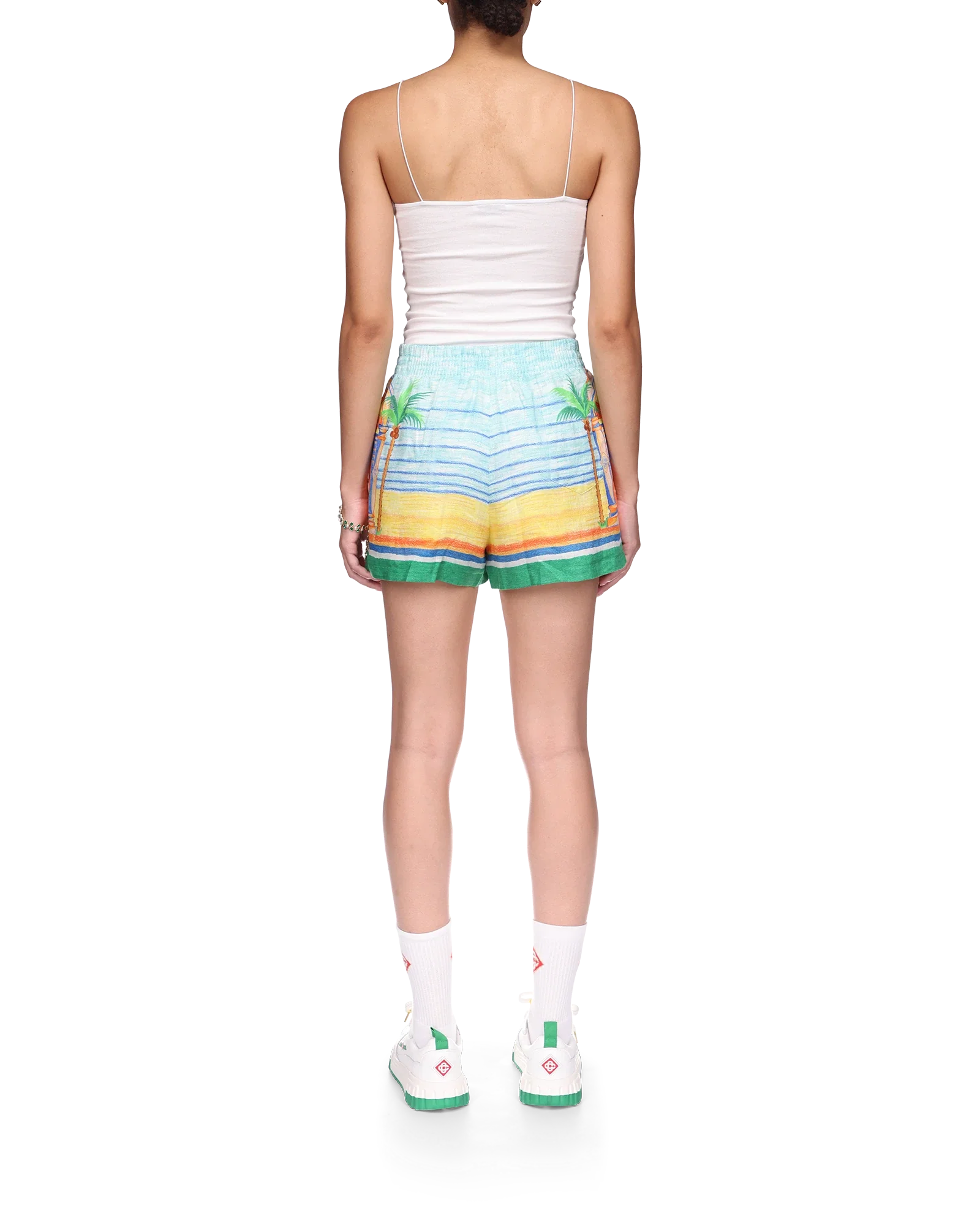 The Day of Victory linen shorts are an all-over printed short style crafted featuring the house’s seasonal artwork incorporating surrealist tennis with geometric curvature loosely inspired by the work of Nigerian painter Uzo Egonu. Crafted from a printed silk satin fabric. complete with an elasticated waistband. side pockets. and hem detail.