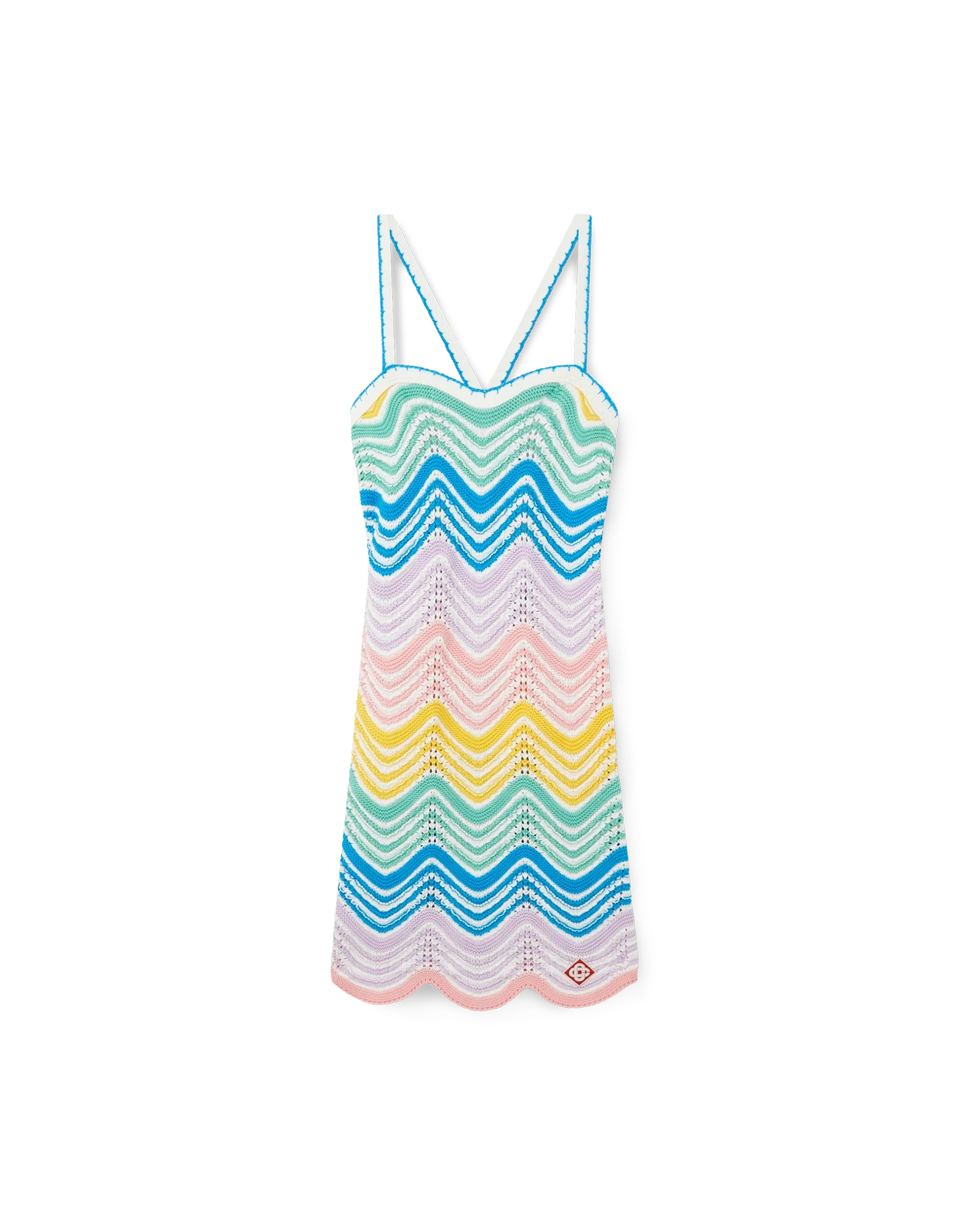 The Gradient Wave crochet dress is a cross-back mini style crafted from a crochet cotton fabric. featuring the house’s wave pattern inspired by the Memphis movement serving as a foundational design element. The colour palette for this collection is light and idealistic. emphasising ethereal themes core to our brand. Completed with the house’s signature diamond logo. and string fastening at the back.