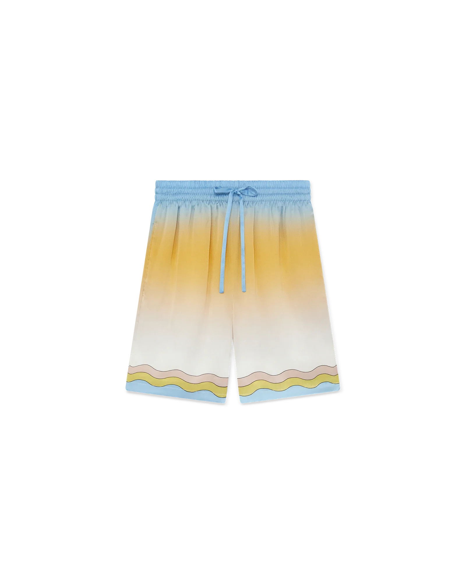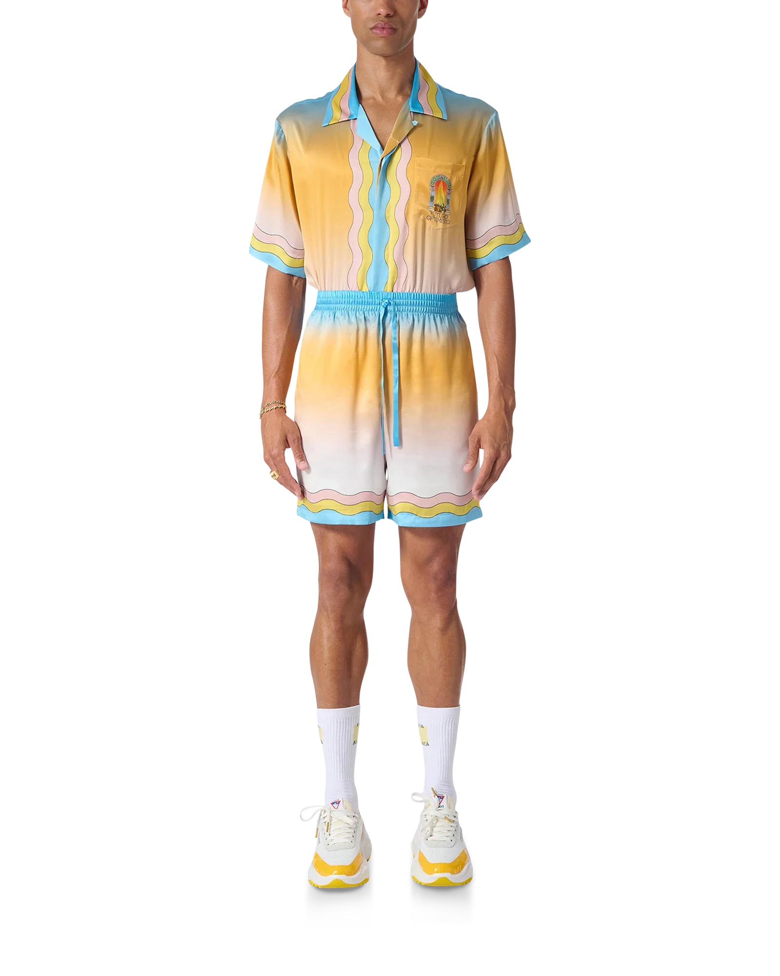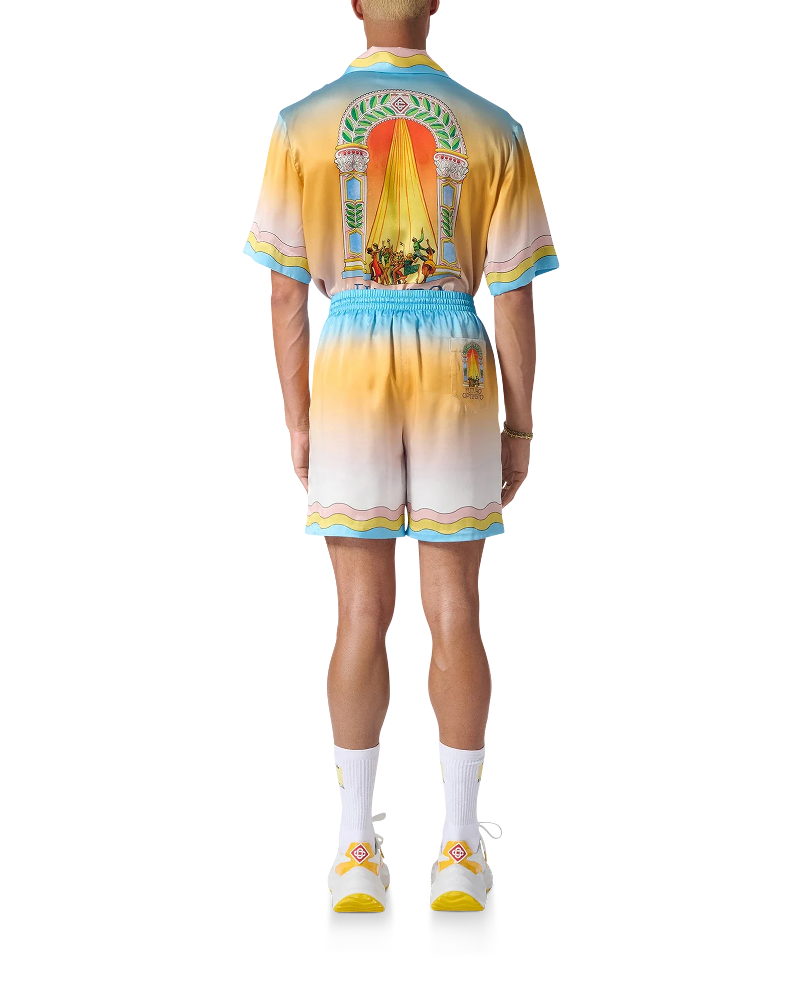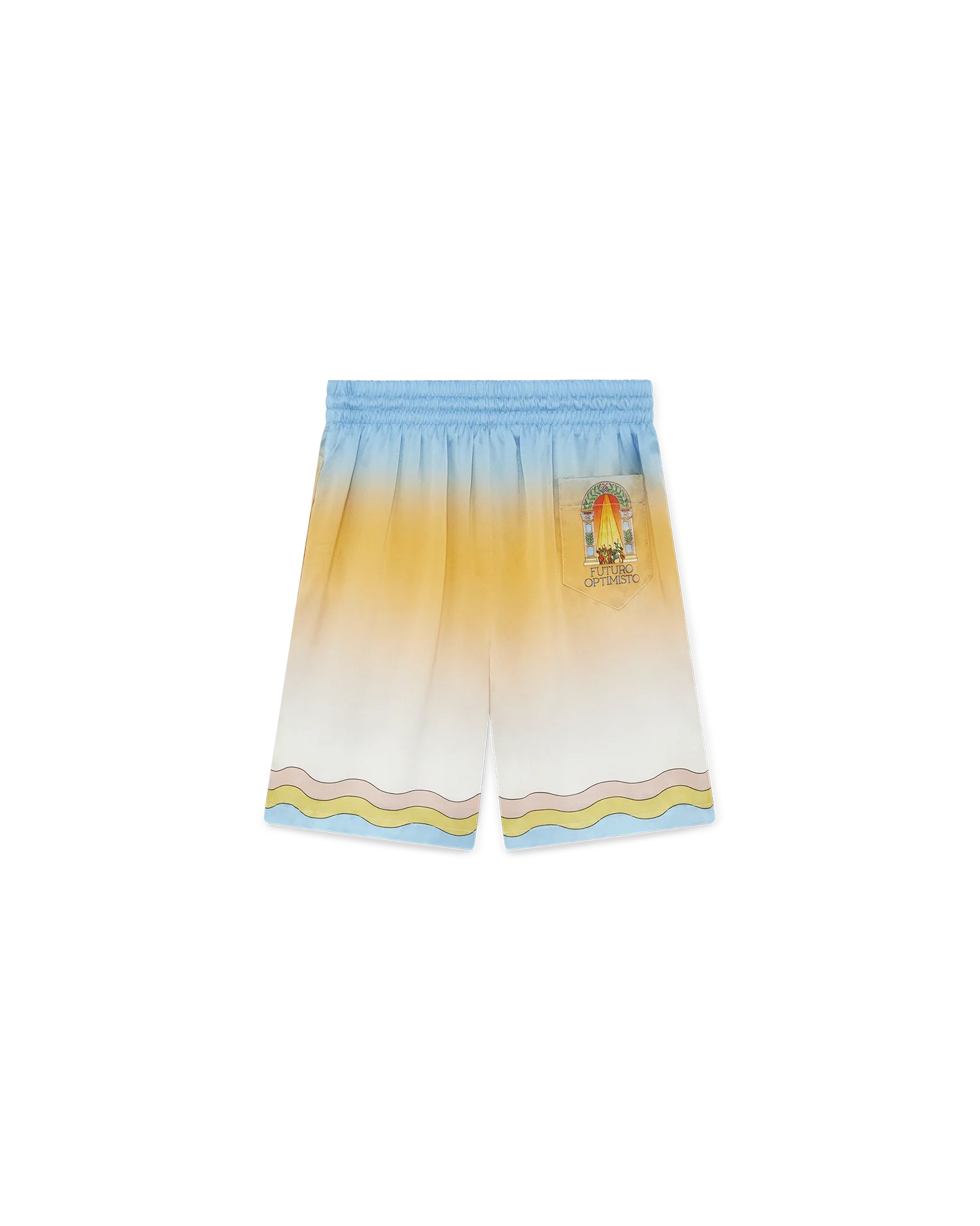 The La Danse silk shorts feature a key seasonal artwork featuring Futuro Optimisto at the back pocket. Finished with an elastic waistband. drawstring fastening. and side and back packets to fall loose to above the knee.
