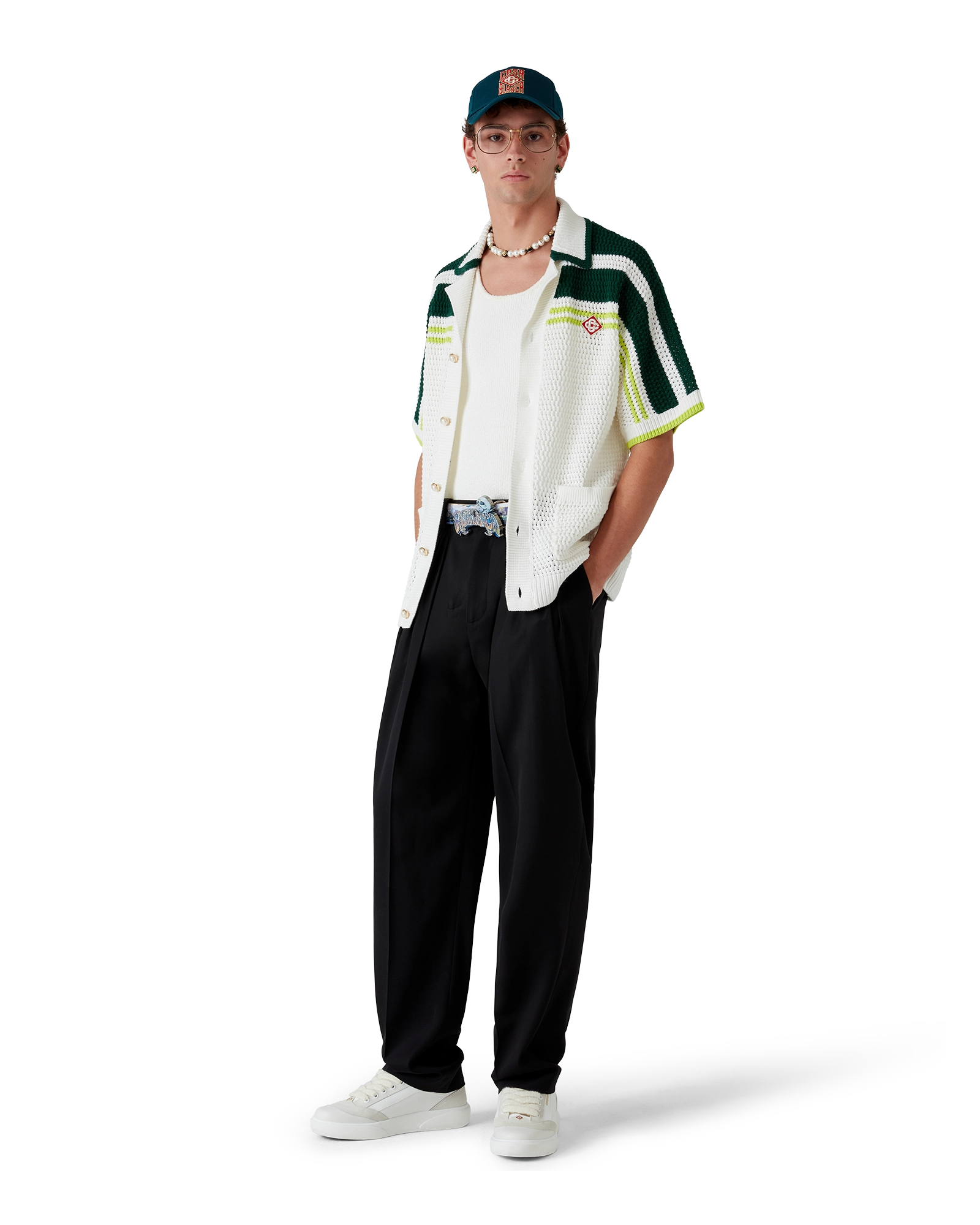 The La Premonition belt is a design featuring the house’s seasonal artwork inspired by an eerie vision of the skyline of LA at night. with UFO elements touching on vintage sci-fi inspiration. crafted from calf leather. Completed with a painted brass buckle featuring hand-drawn typography of the Casablanca logo. inspired by the gothic typeface used in tattoos. in the season’s gradient. and a skull.