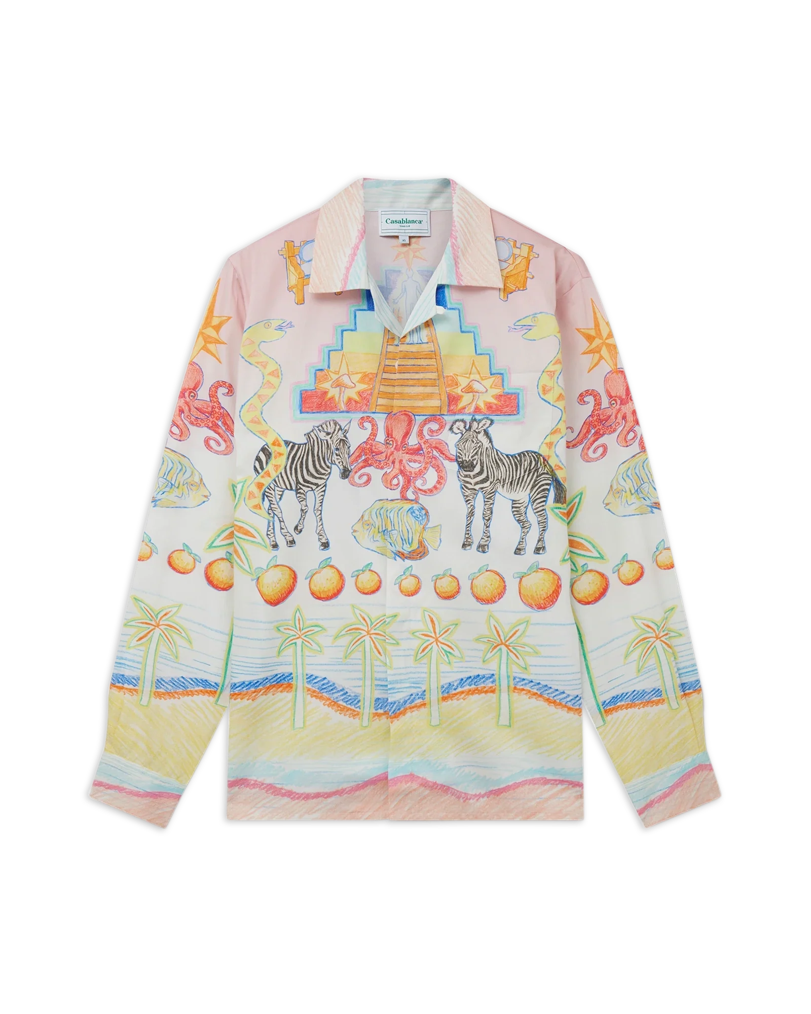 The L’Arbre De Vie cuban collar linen shirt is a printed long-sleeve style featuring an effervescent take on an evocative landscape scene inspired by Mexican artist Pedro Linares. fantasy creatures depicted in kaleidoscopic colours are a form of spirit animals. Finished with an intended open collar. Casablanca Paris branded label. front button closure and signature gold rim pearl buttons. designed for a relaxed fit.
