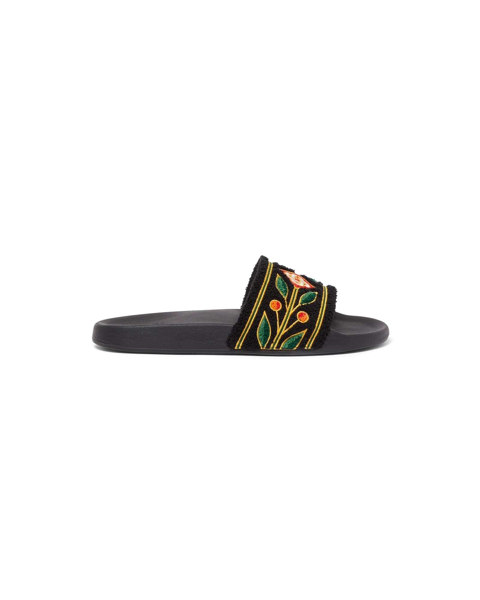 The laurel terry sliders are crafted from an embroidered terry fabric and feature the house’s diamond logo and signature Laurel artwork on its uppers. Completed with padded rubberised soles.