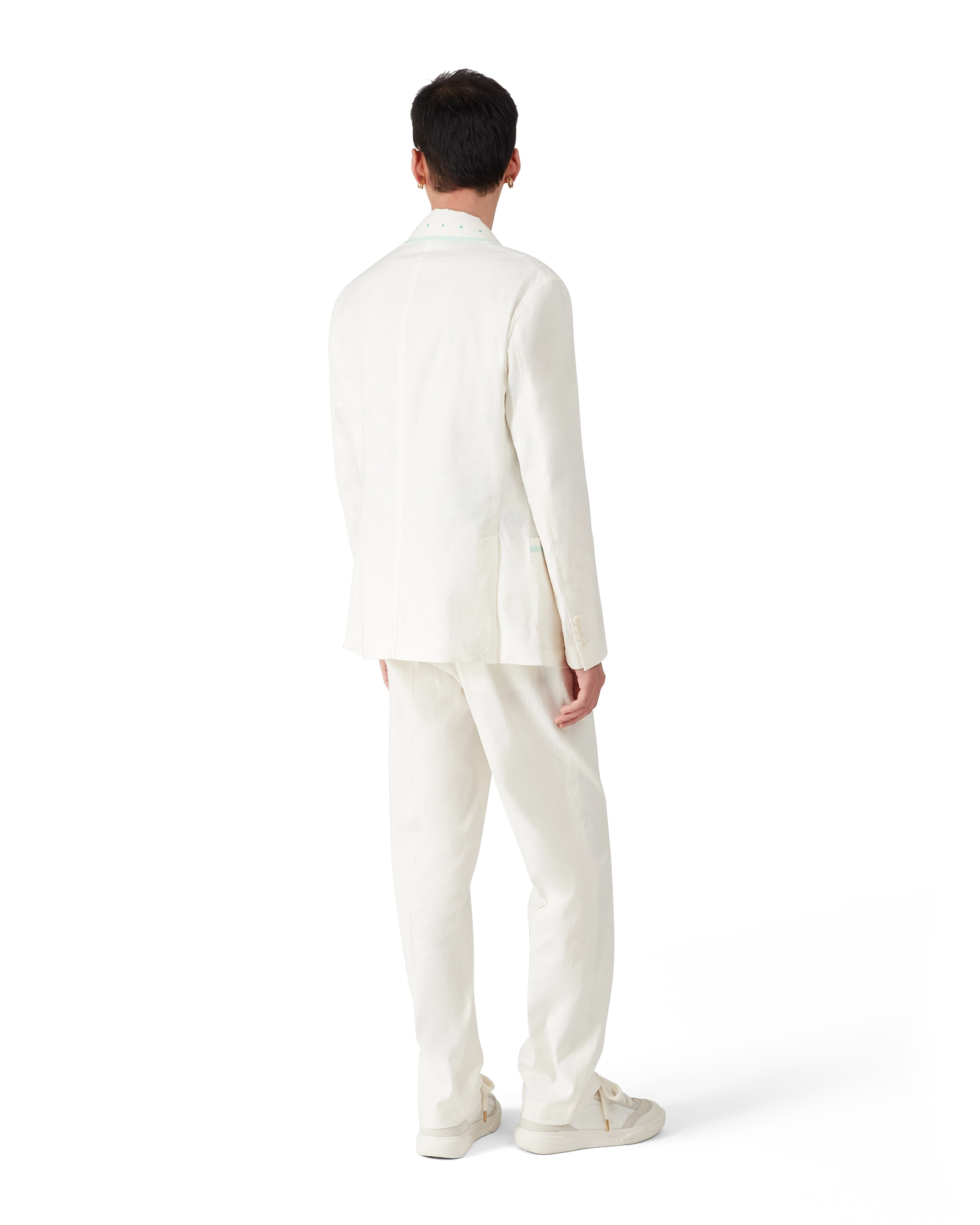 The linen single-breasted jacket is a tailored design crafted from linen and cotton fabric. Completed with button closure. interlocking CC logo corozo buttons. a patch breast pocket. two patch front pockets. and edge detail on the collar. pockets. and lapels.