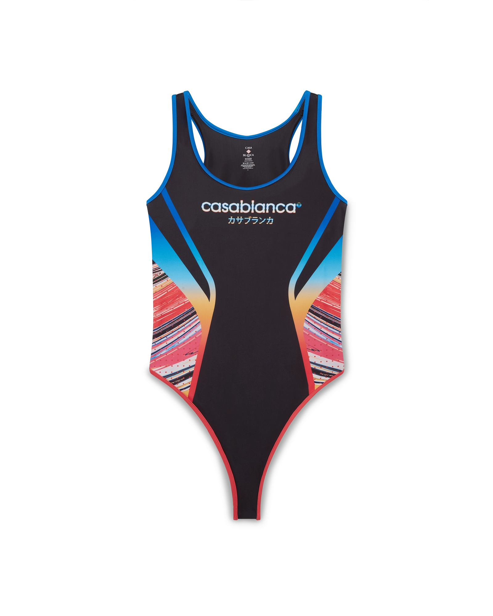 The Marble swimsuit is a printed design crafted from a breathable technical swim fabric. featuring the house’s Casablanca logo across the chest and a multicoloured marble-effect artwork on the side panels. Completed with high-cut legs. a scoop neck. a cut-out back. blue and orange trim details.