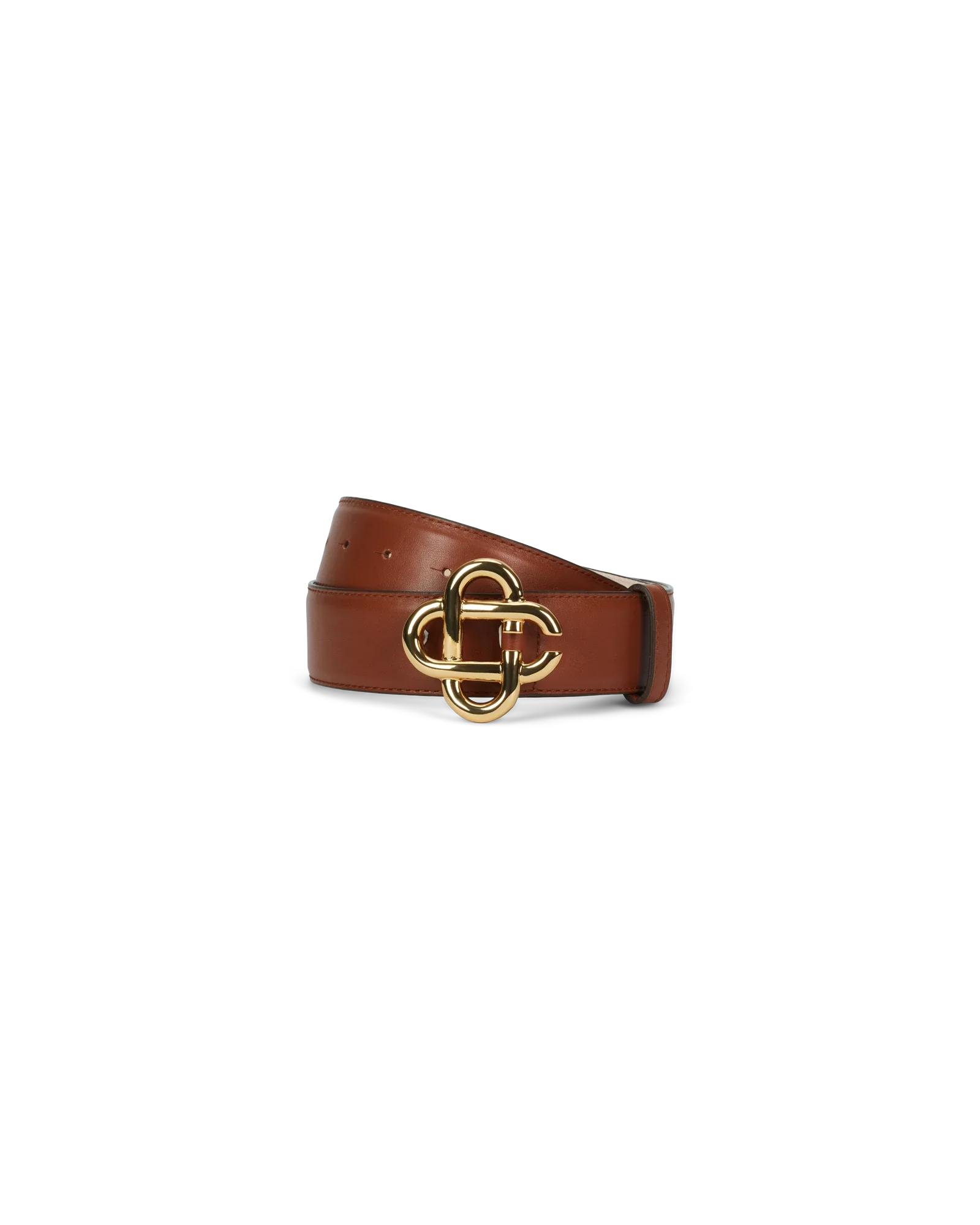 The brown leather belt features the house’s signature interlocking cc logo buckle with a leather strap.