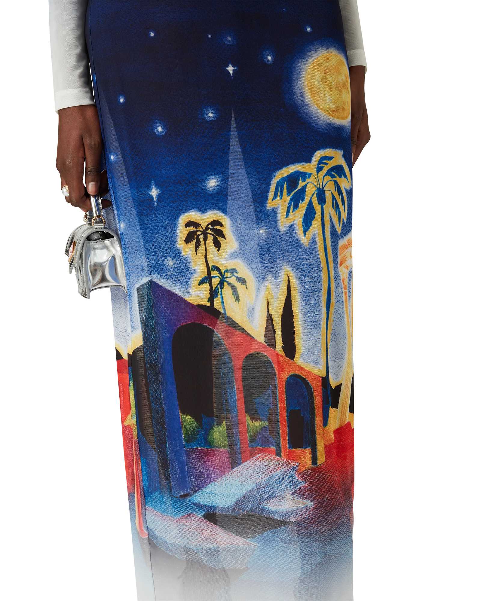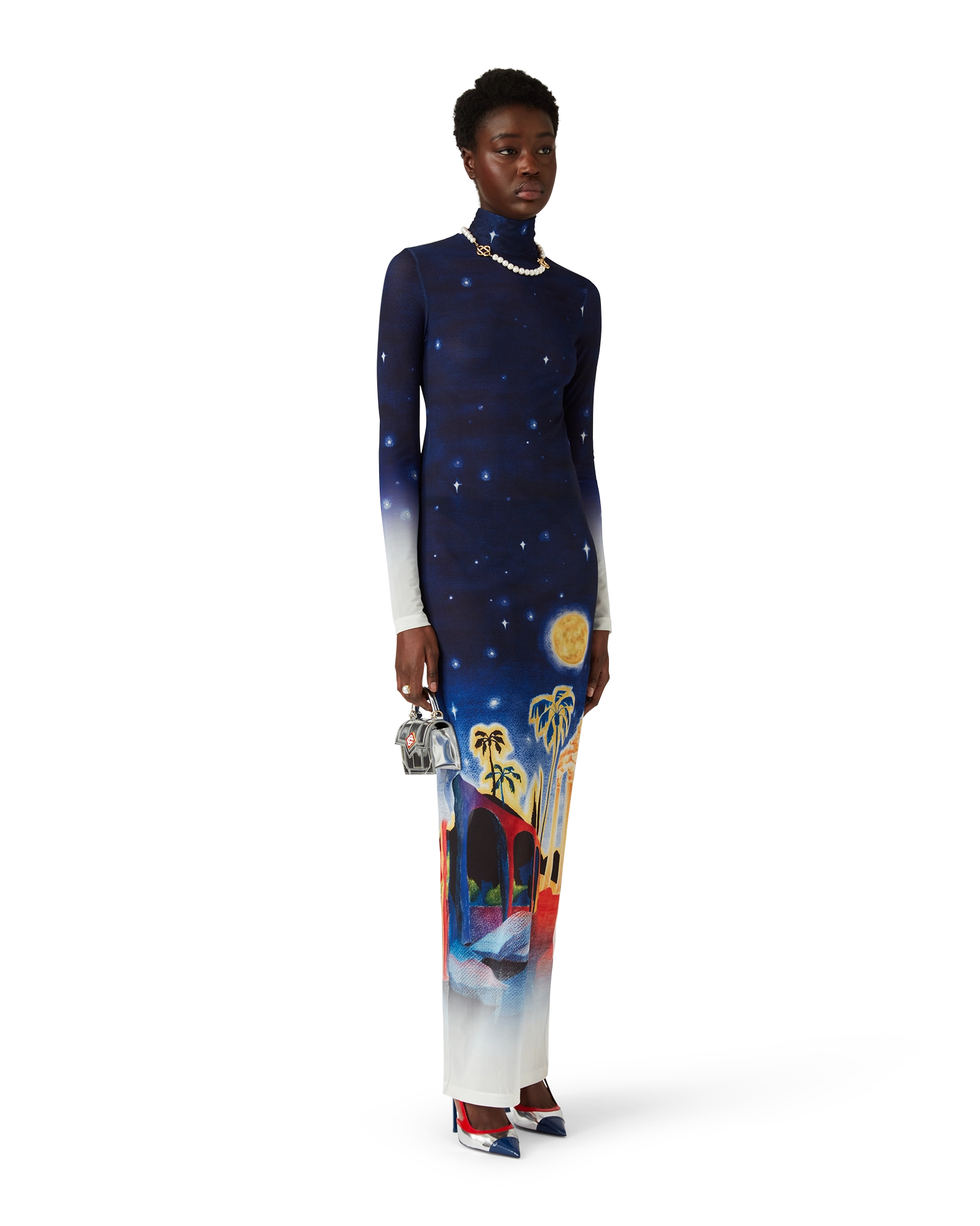 The Midnight Acropolis mesh dress is a long-sleeved all-over printed design crafted from stretch mesh fabric featuring the house’s seasonal print. paying homage to the beautiful night of Ancient Greece with the light from the temple and sky Completed with a classic polo neck.