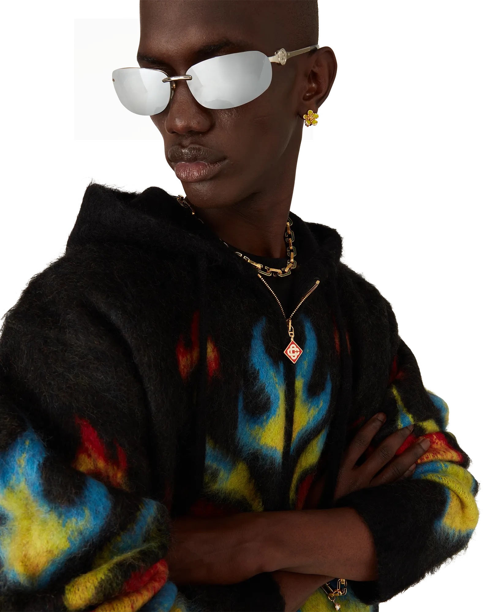 The mohair Flame Laurel zip hoodie is a long-sleeve knitted design featuring an updated take on our Laurel top from the Nigerian collection. drawing inspiration from the bold graphics of football jerseys. Completed with zip closure. a hood with drawstring fastening. rib cuffs and hem.