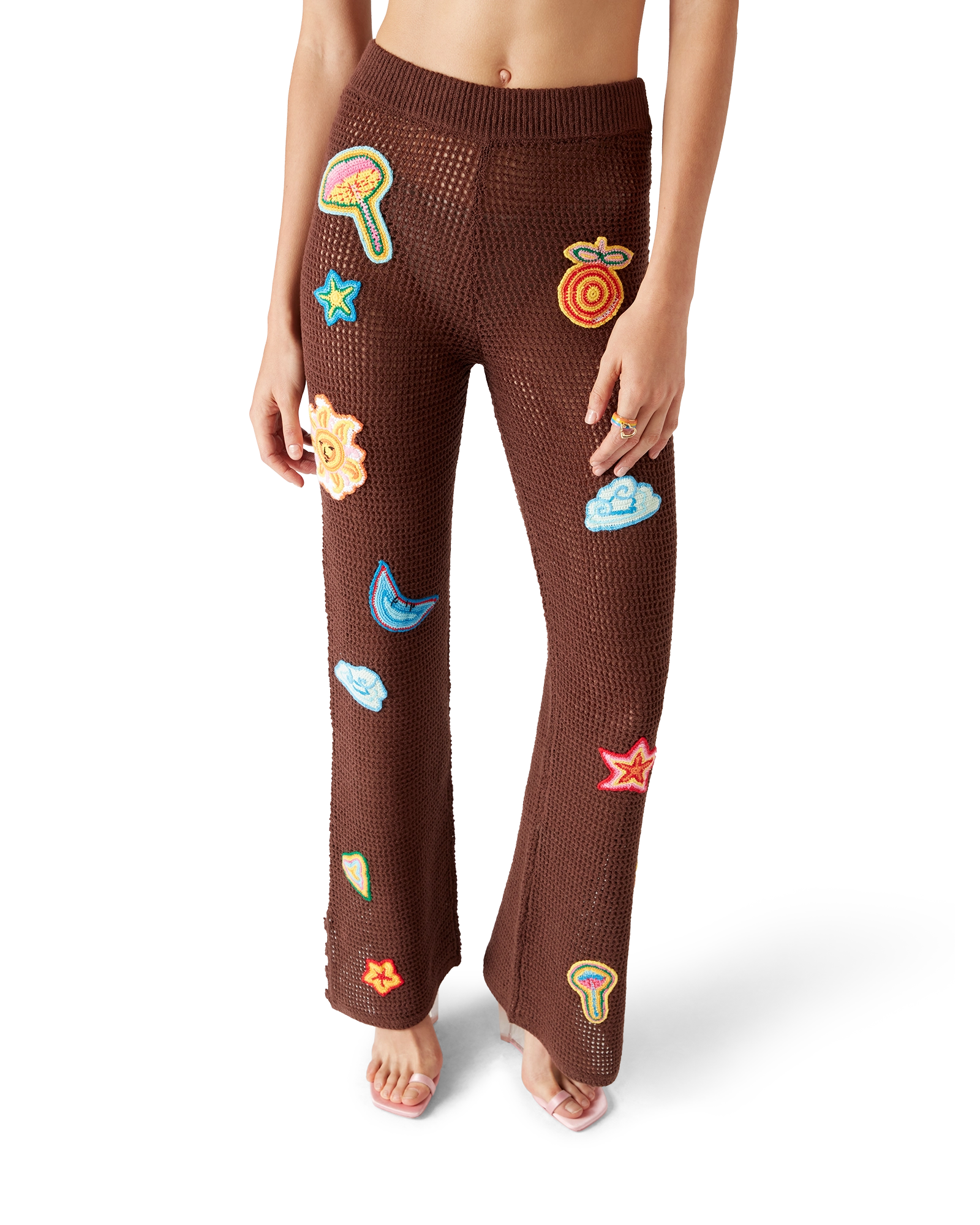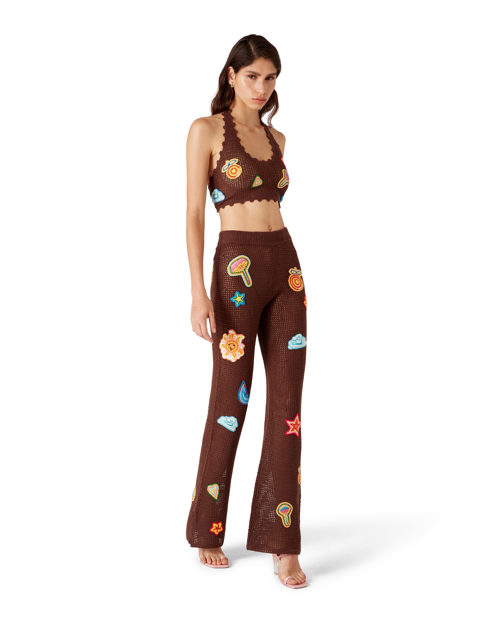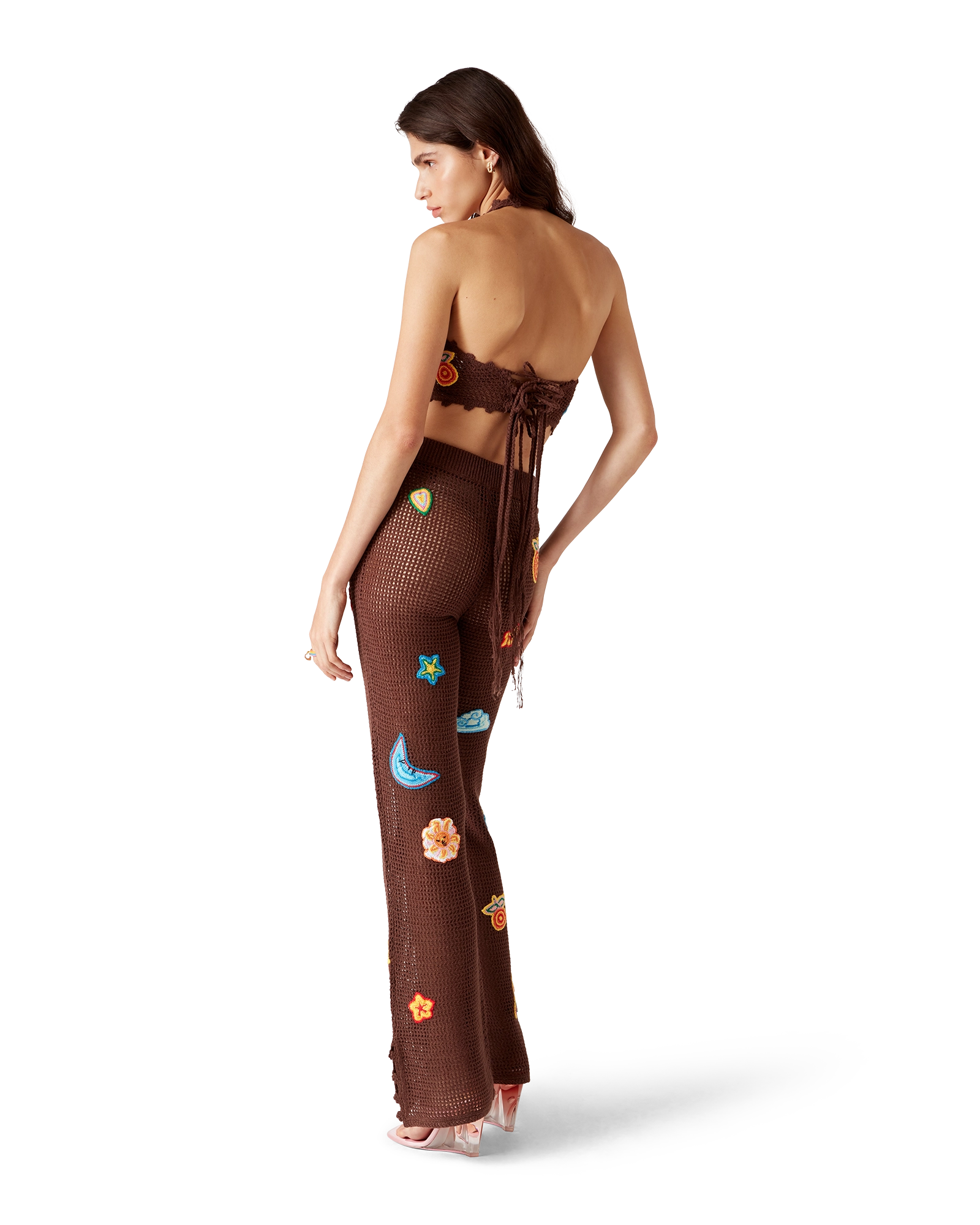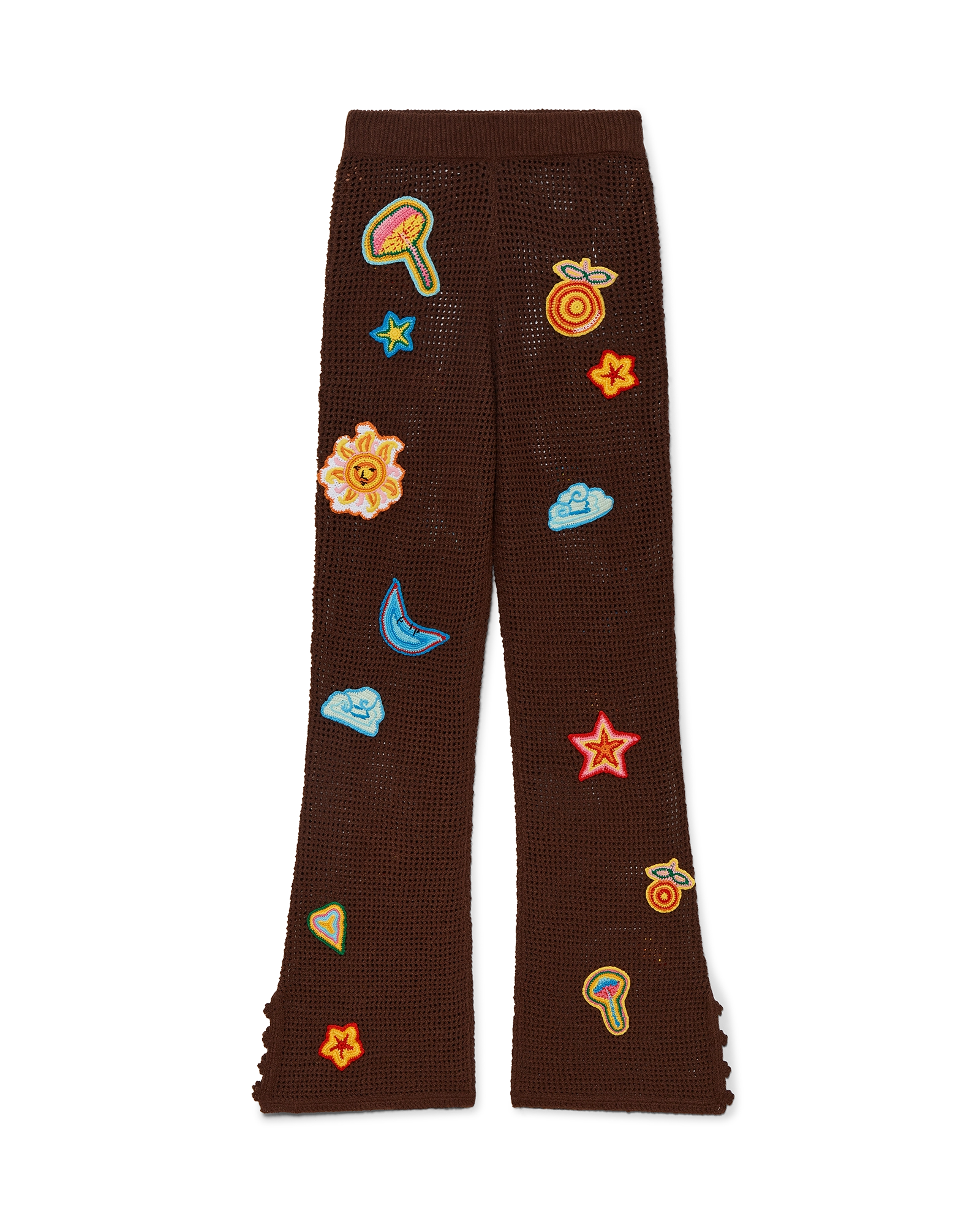 The motif crochet trousers are a knitted design crafted from an open-weave crochet cotton fabric. Completed with an elasticated waistband. motifs of the house’s classic design element. and slit details at the ankles.