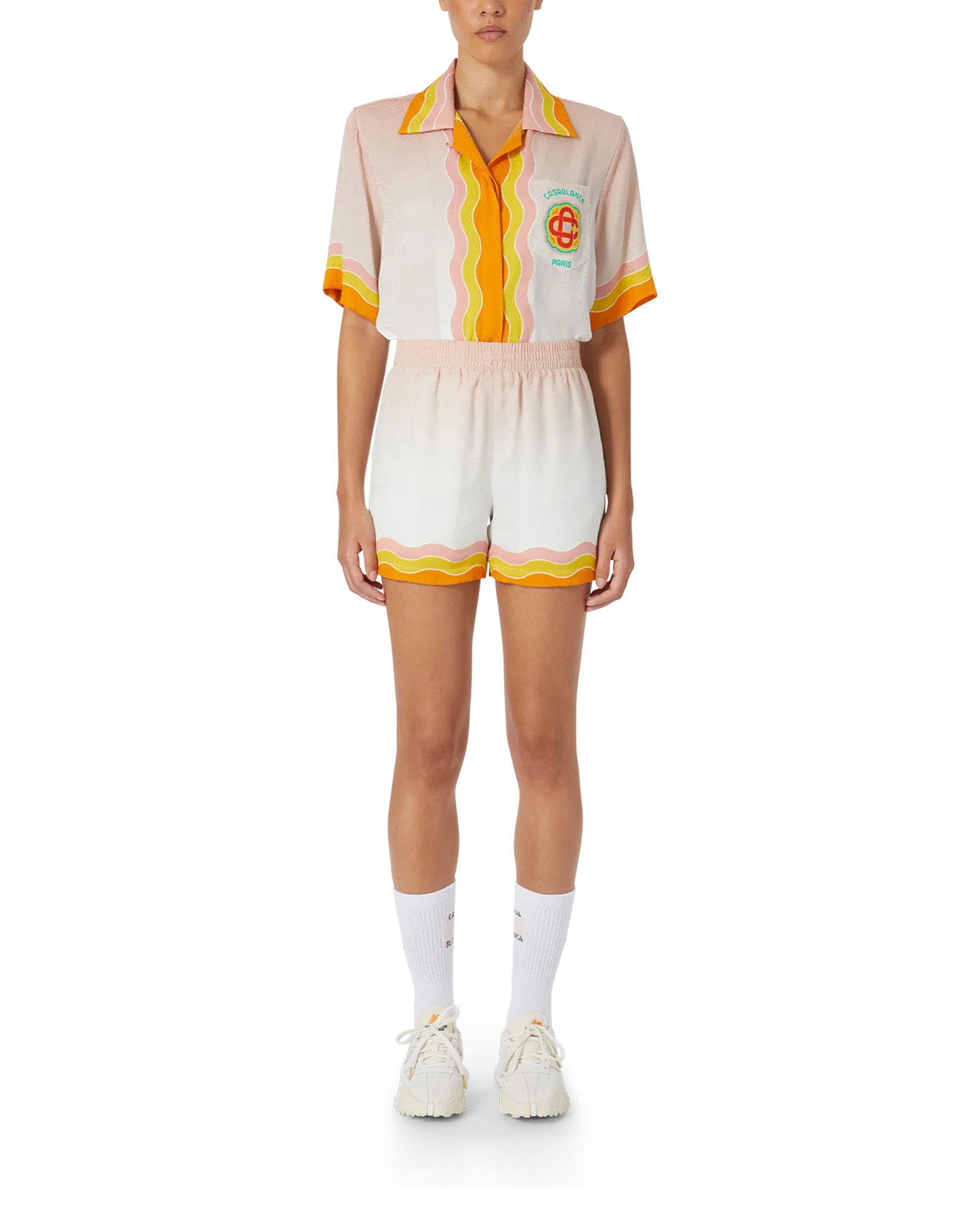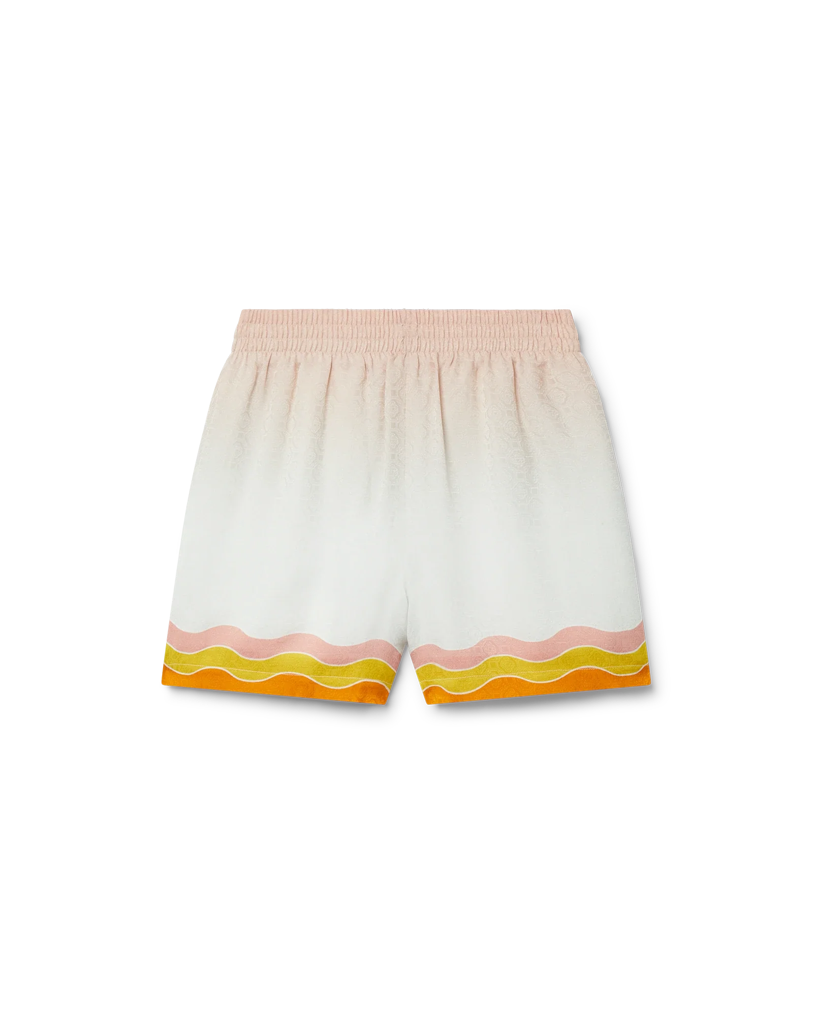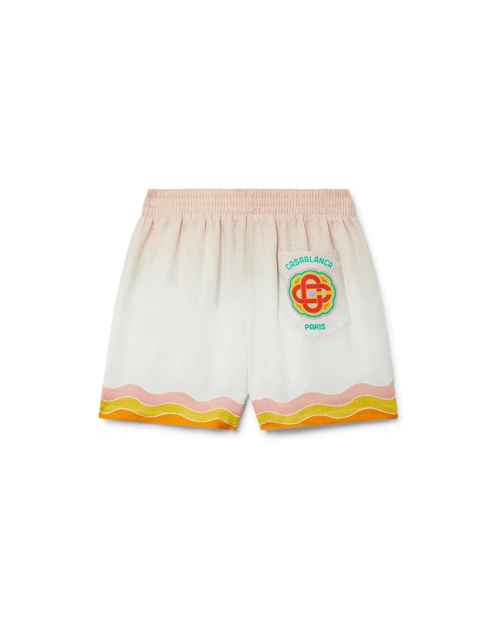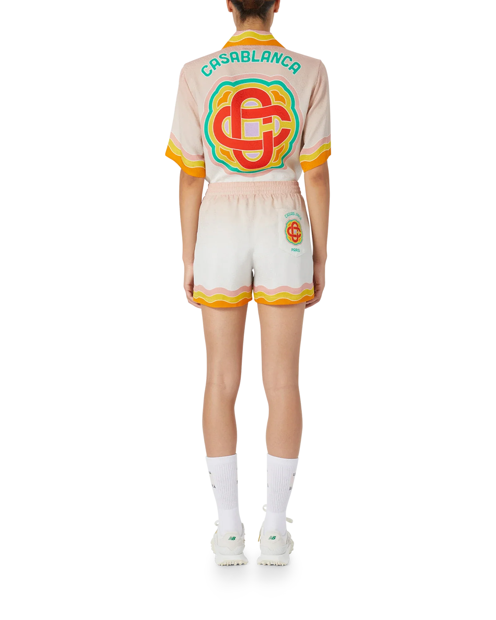 The Rainbow Monogram silk shorts are a printed style featuring a kaleidoscopic interpretation of the Casablanca Paris logo at the back pocket. Crafted from our signature monogram satin silk fabric. Finished with an elastic waistband. side and back pockets to fall loose to above the knee.