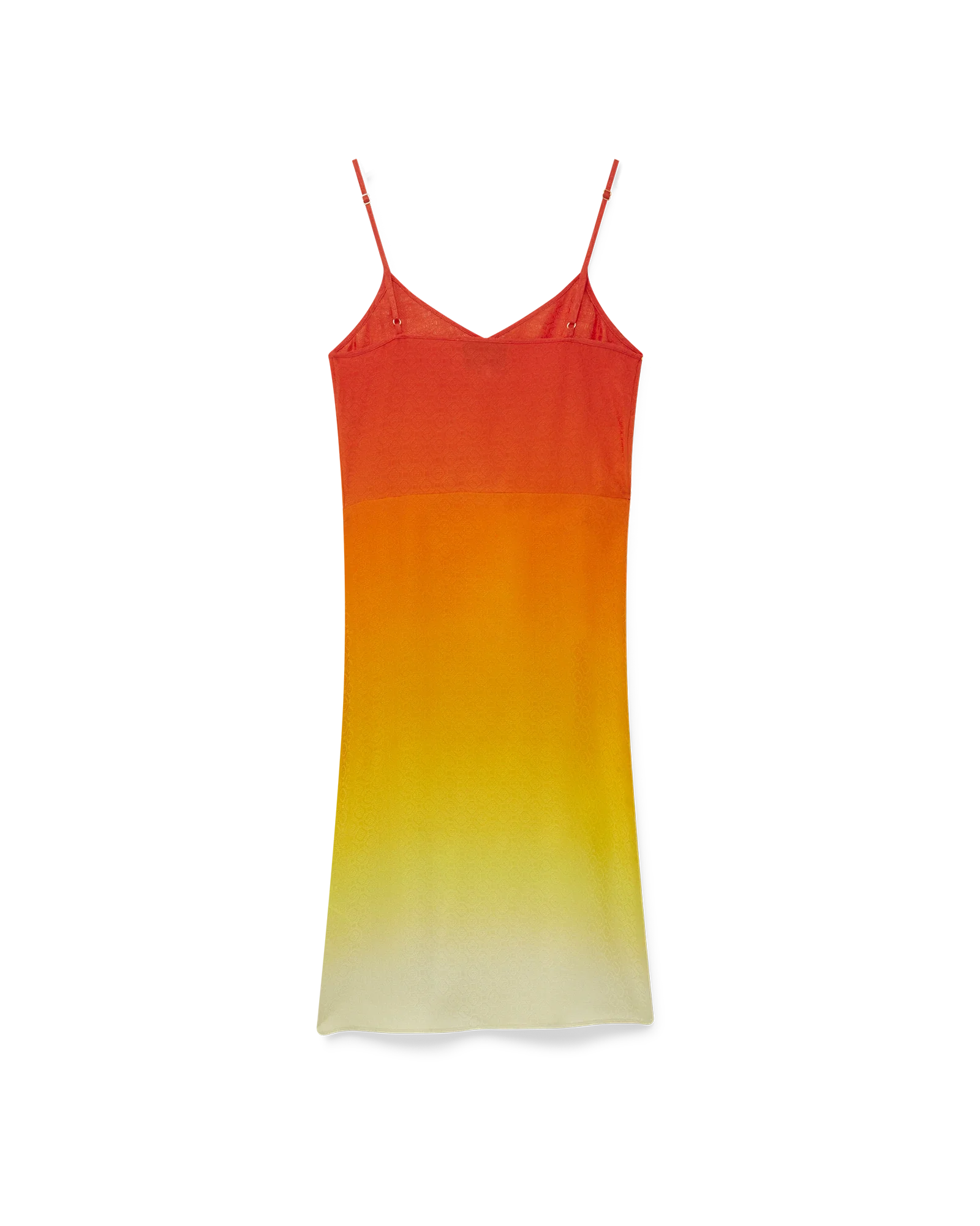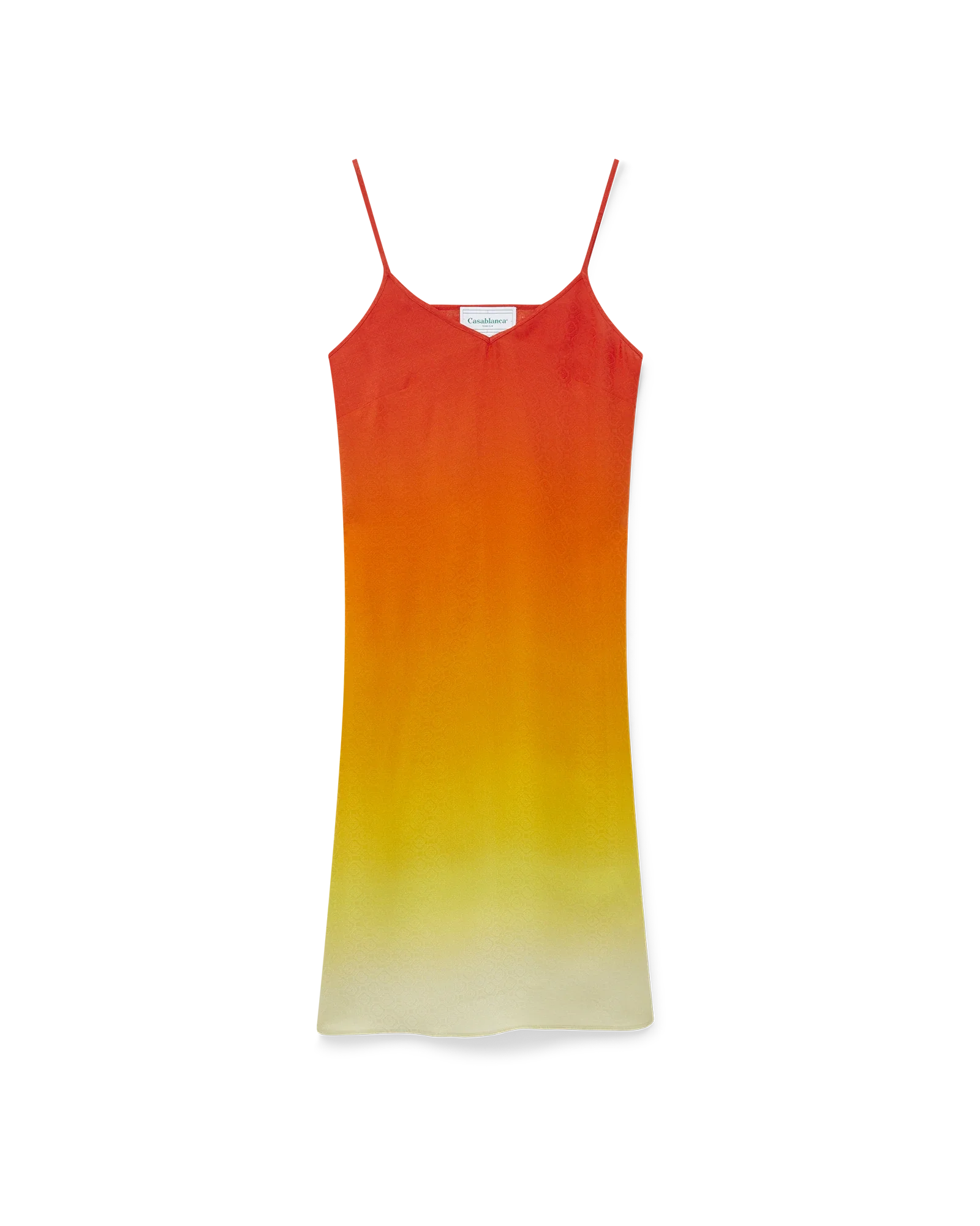 The sunset gradient silk slip midi dress is crafted from the house’s signature monogram satin silk fabric in a sunset-like ombré effect colour palette. Finished with a spaghetti strap and gentle v-neckline. slightly flaring at the mid-length skirt.