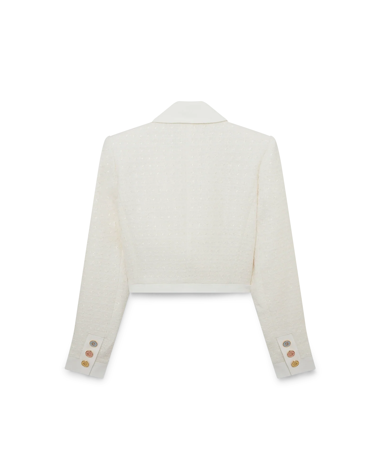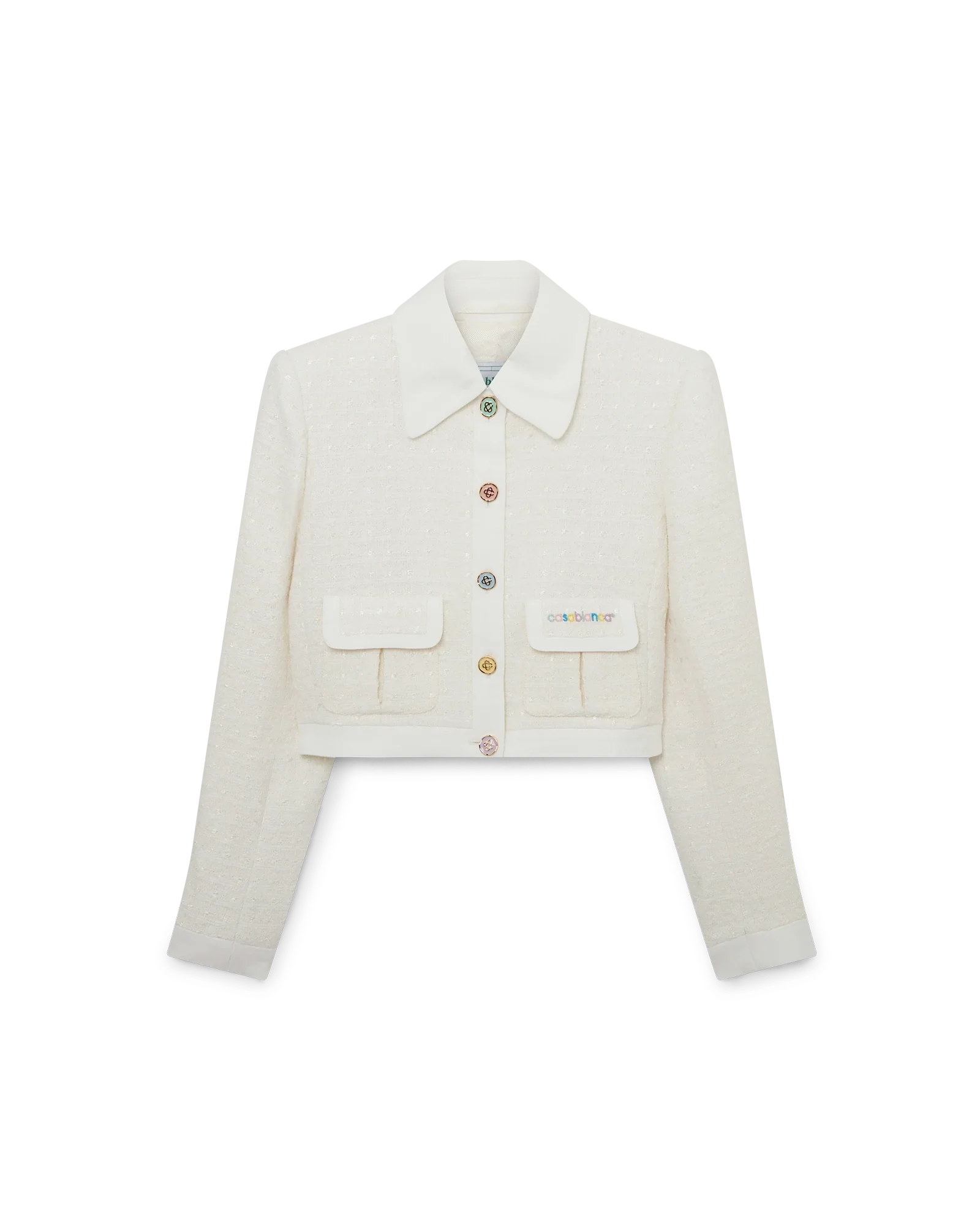 The tweed fitted jacket is a long-sleeved tailored short style crafted from a woven cotton blend fabric. Completed with front bellow pockets featuring the Casablanca logo embroidered in this season’s pastel palette. pointed collar. pastel coloured buttons. and front button closure – designed to be worn with its matching mini skirt.