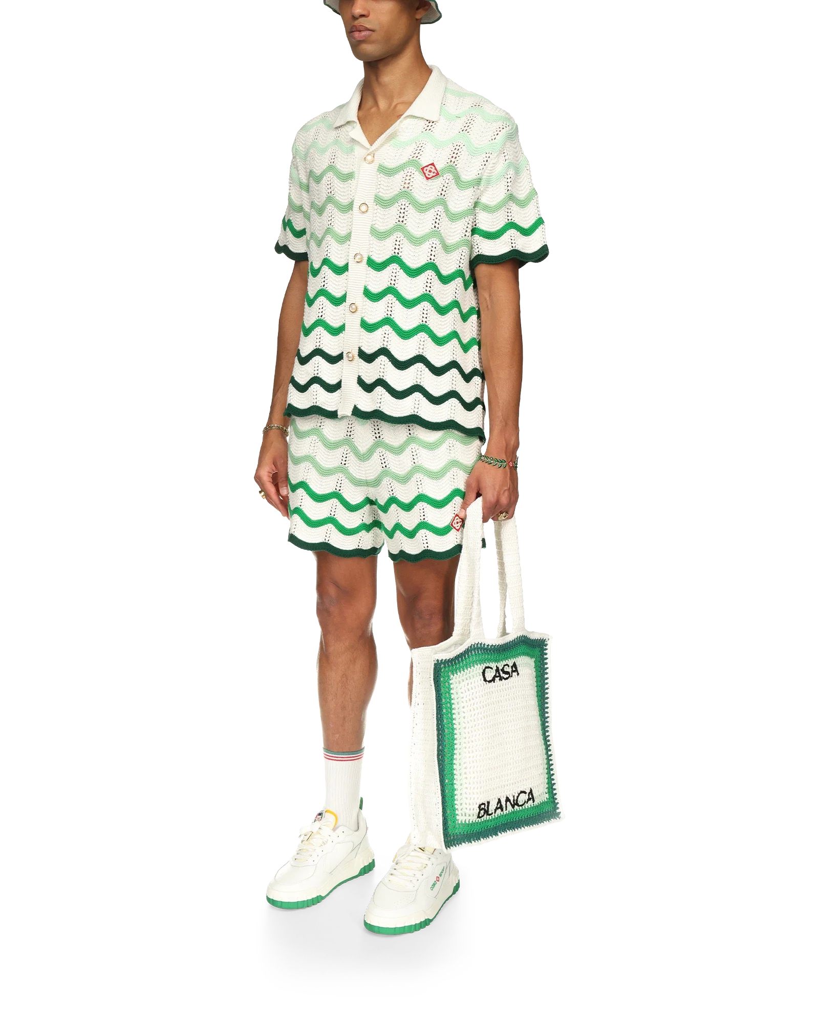The Wavy Gradient Crochet shirt is a classic Casablanca design with a button closure. short sleeves and a Cuban-style collar. Crafted from 100% organic cotton and completed with gold rim signature pearl buttons. the house’s diamond logo and Casablanca branded label.