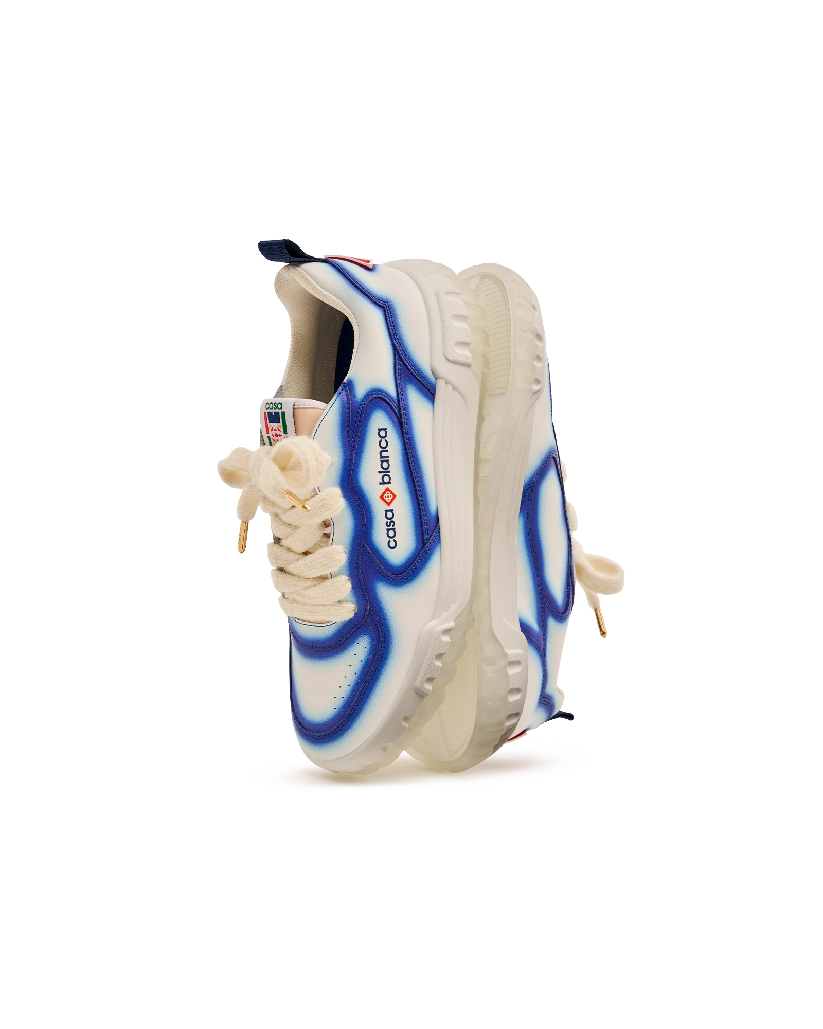 The design language of the Court Sneaker reflects the iconic silhouettes of the 90s. The colours featured throughout the rubber sole are a combination of the refined codes of tennis and classic architecture and create a unified palette throughout the shoe. with the focus on primary colours offset by tennis whites to create a sports focus colour story. The upper of the shoe features integrated. flowing panel lines as a nod to the iconic silhouettes of the 90s. Prominent Casablanca branding throughout is evident. including the brand’s signature diamond motif on the heel. silicone wordmark lateral panelling and the woven tennis court motif tongue label and insole. giving rise to its name. The Court.
