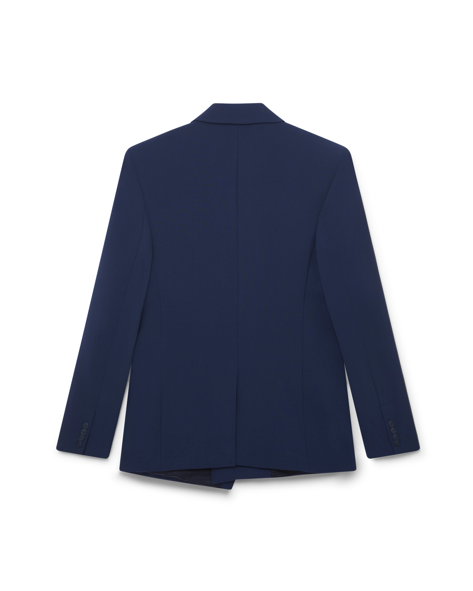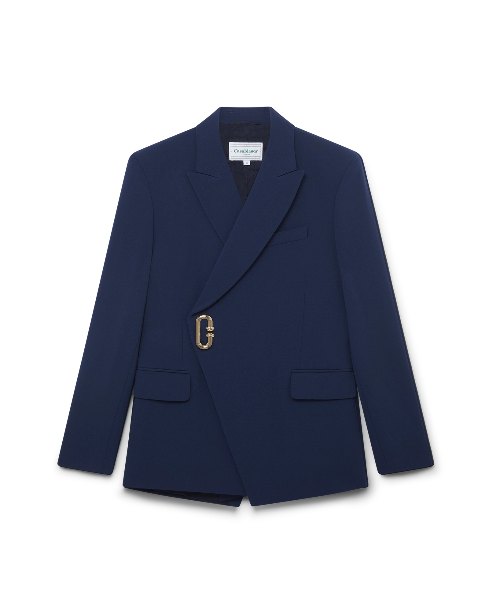 The asymmetric double-breasted jacket is a long-sleeved design crafted from a virgin wool fabric. Completed with this season’s column C fastening inspired by ancient Greece. flap pockets. peak lapels. and an asymmetric hemline.