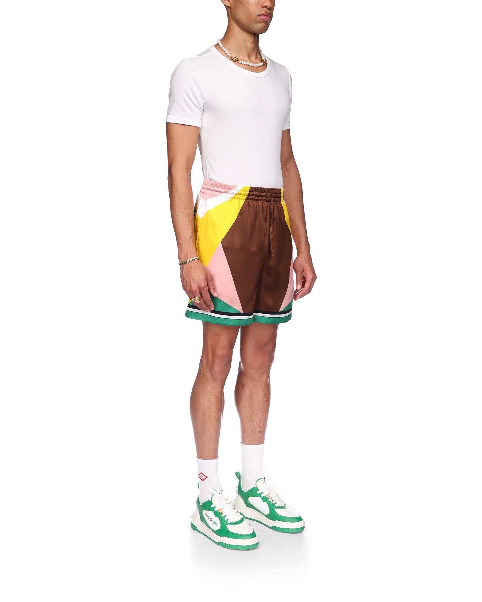The Casa Sport silk short is a printed design. crafted from a silk satin fabric and features geometric panels of colours and the house’s Casa Sport logo. Completed with side pockets. an elasticated waistband and drawstring fastening.