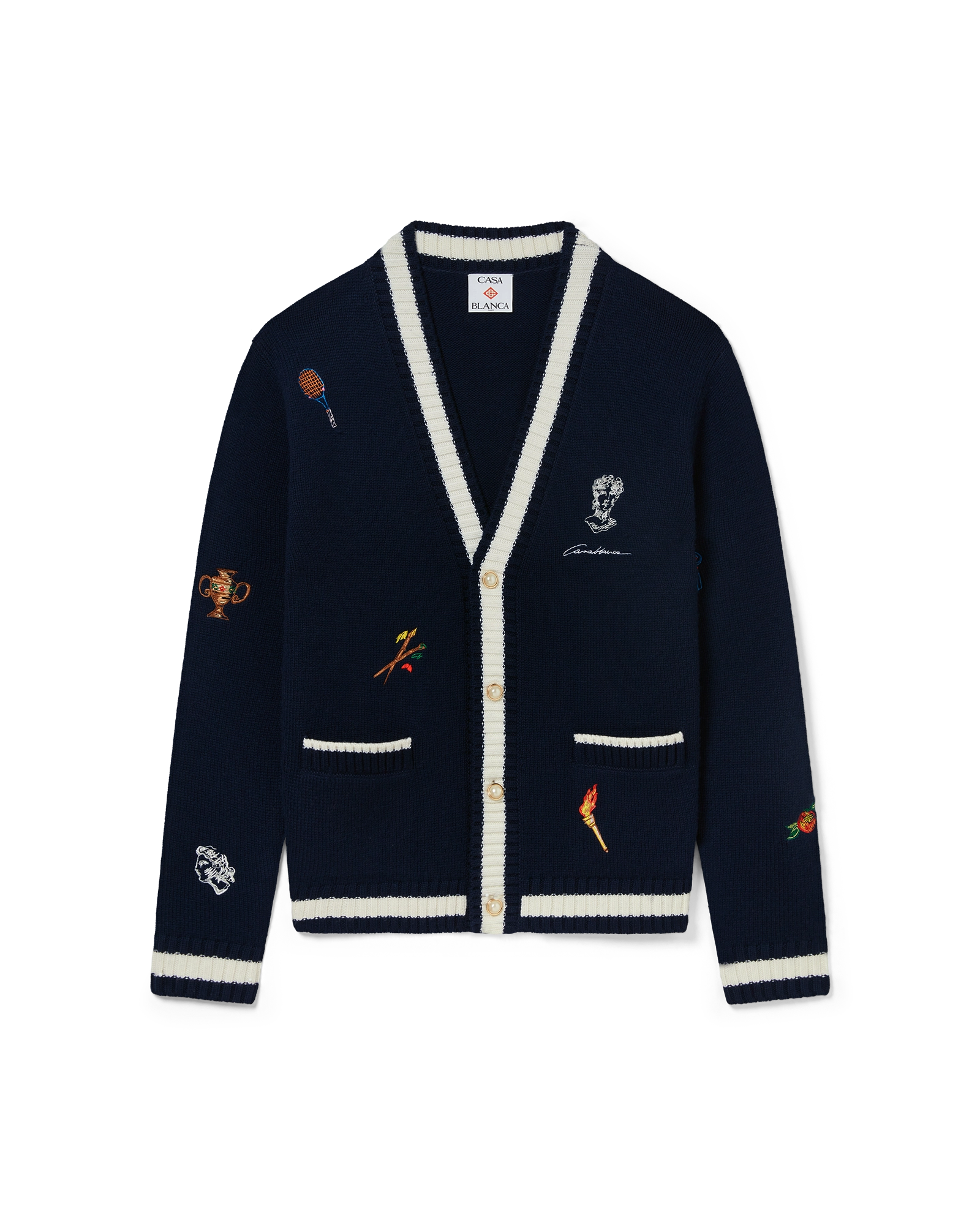 The cashmere cardigan is a v-neck knitted style crafted from a cashmere blended fabric featuring the house’s classic iconographic and seasonal artwork incorporating tennis. architecture and nature. Finished with signature gold rim pearl buttons. and white detailing on the collar. cuffs. hem. placket and pockets.