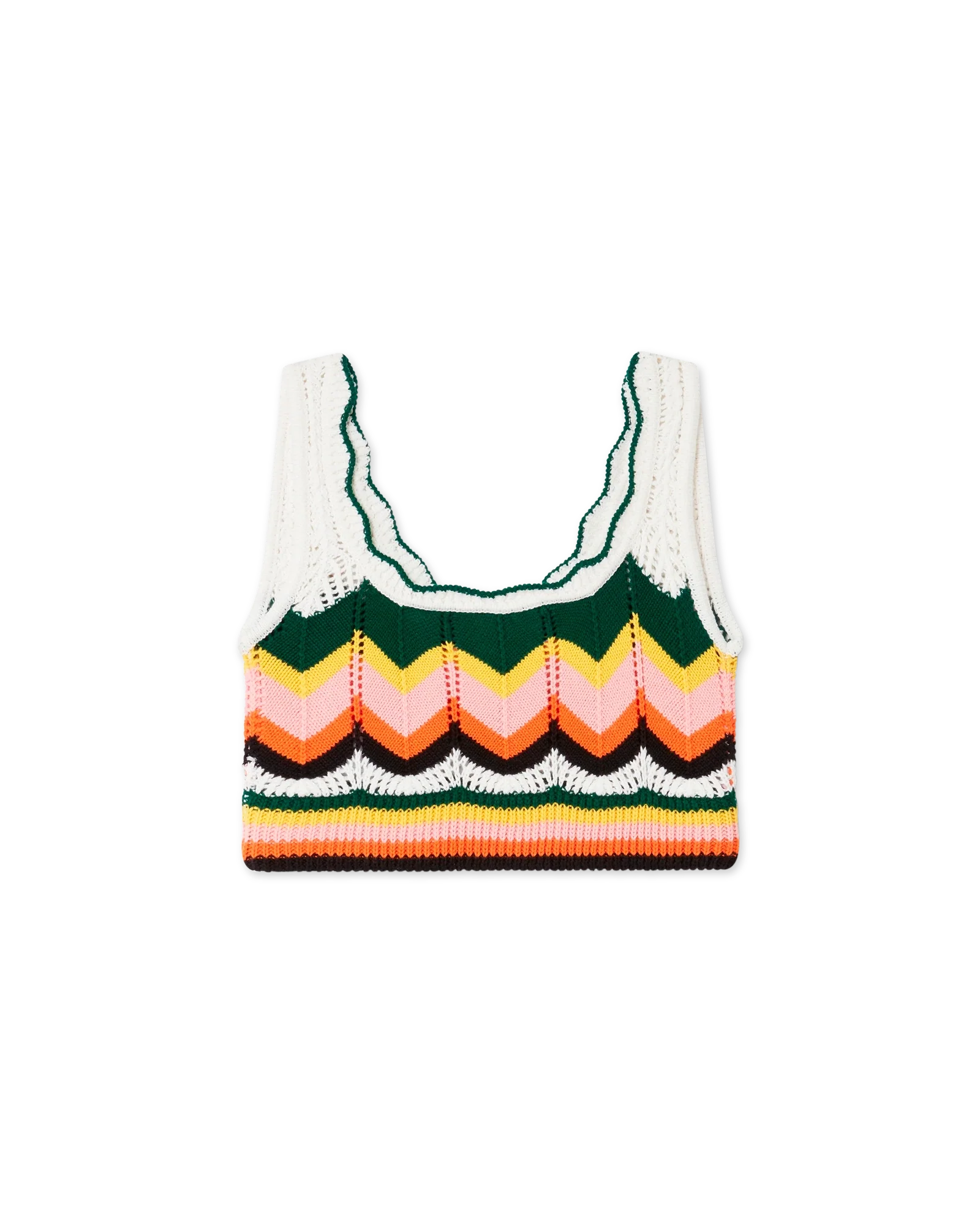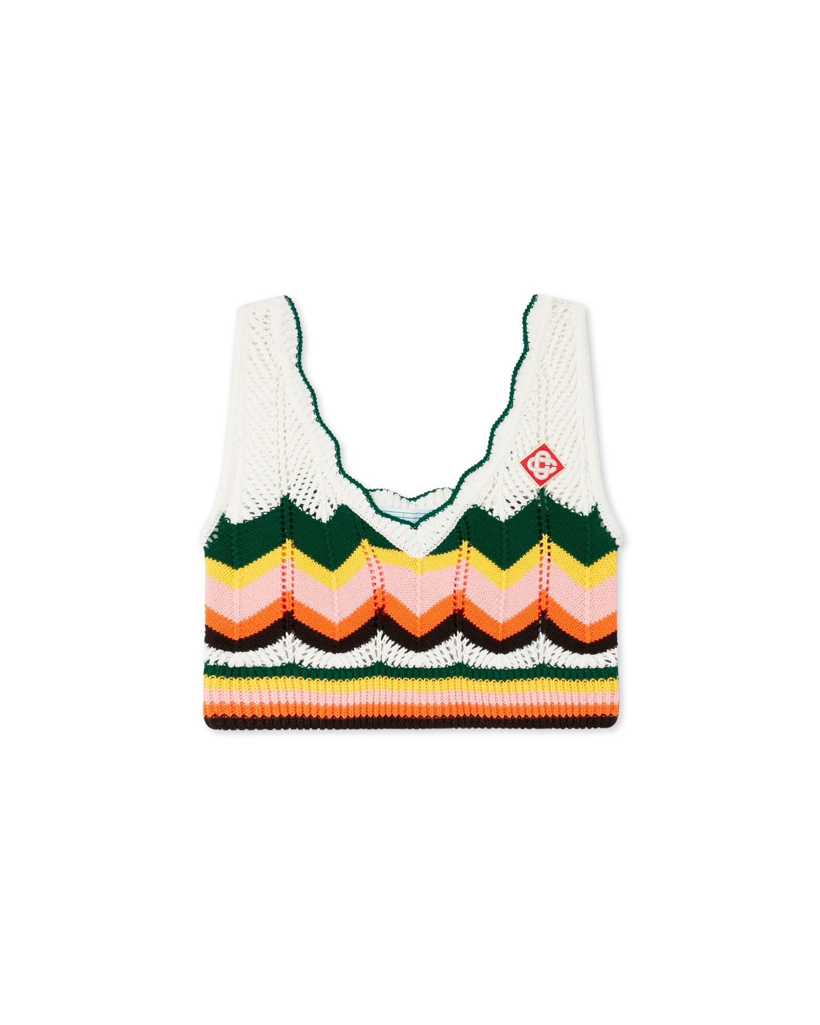 The chevron lace bra is a sleeveless style featuring the house’s signature wave motif turning into a zig-zag with chevrons highlighting the season’s colours. Completed with a deep v-neck. lace detail finishing and a contrast elasticated band.