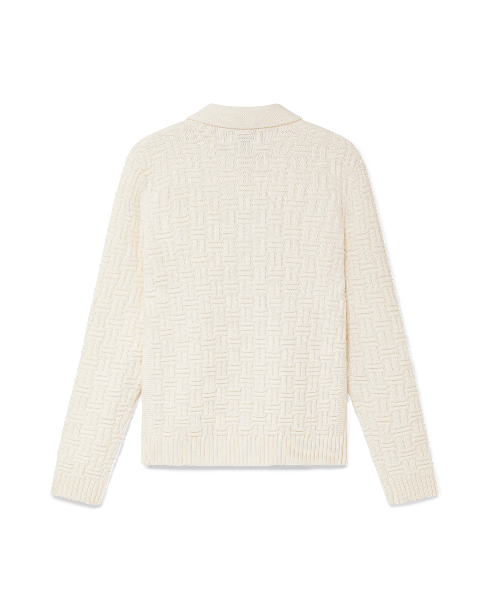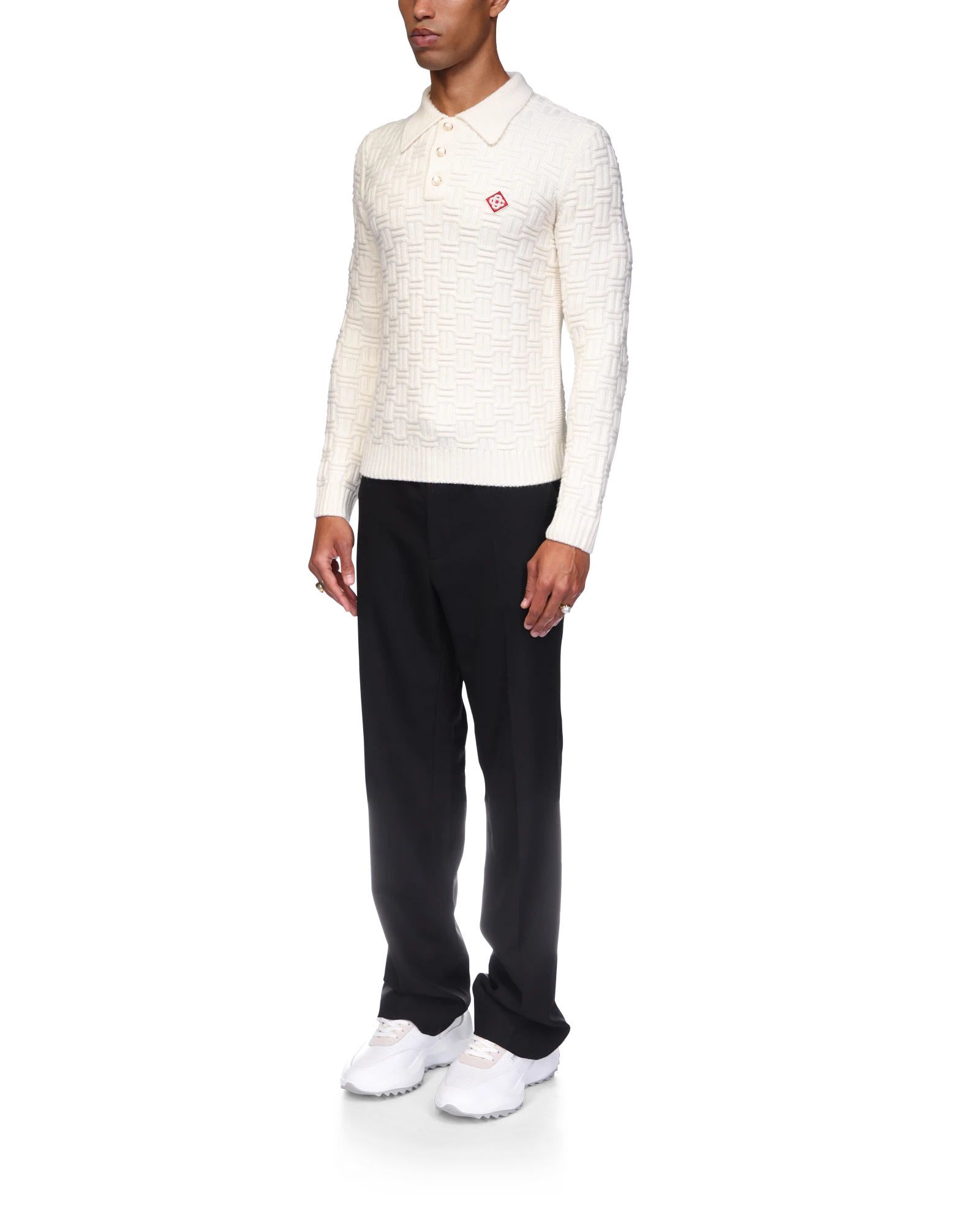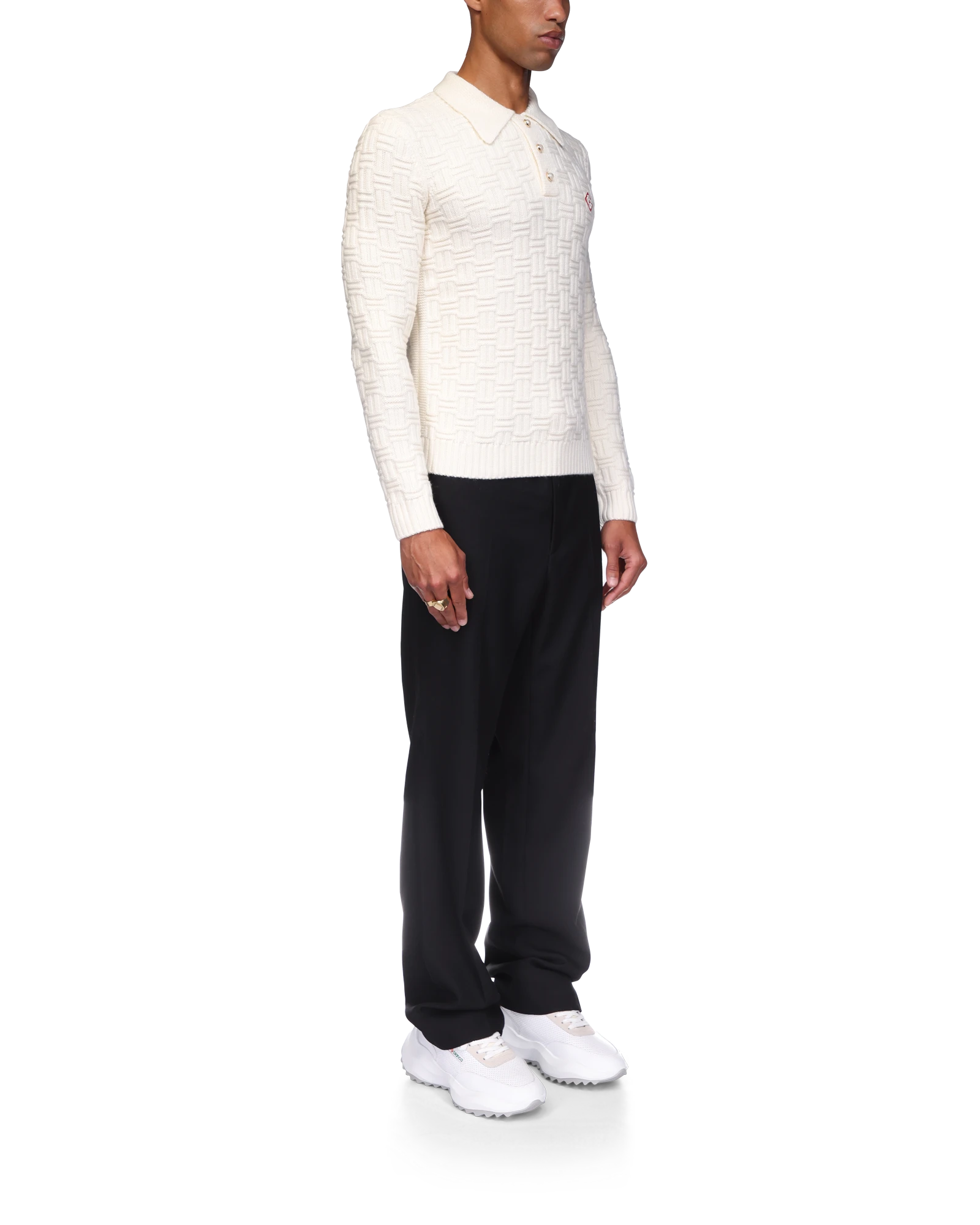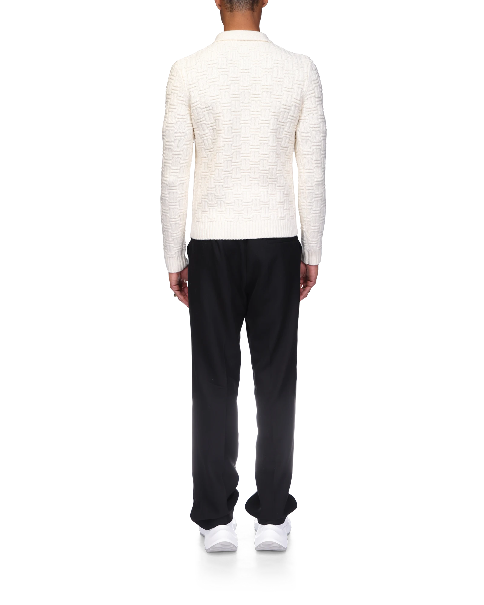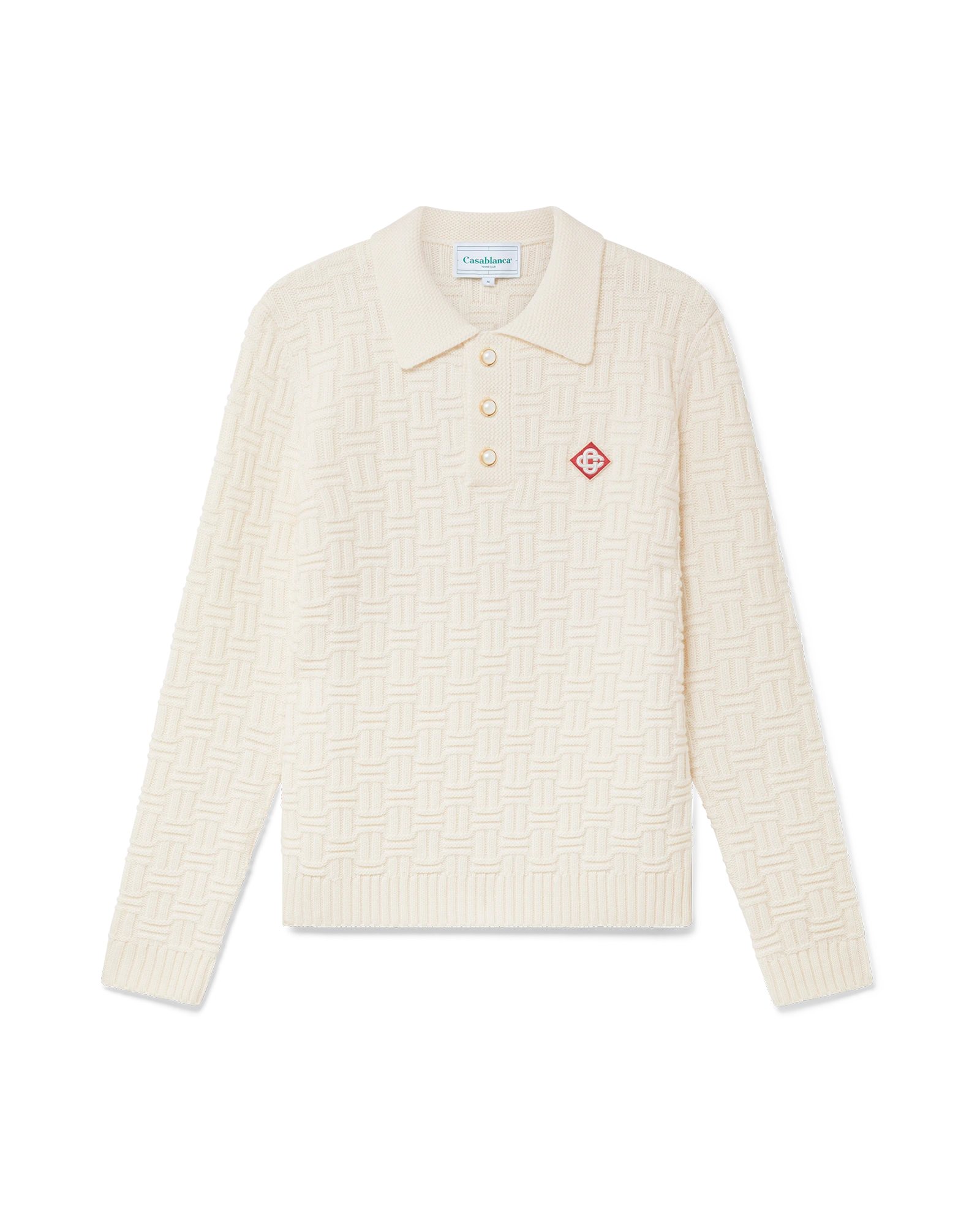 The column knit polo is a long-sleeved woven design crafted from a soft luxurious merino wool. Completed with the house’s diamond logo. signature gold rim pearl buttons. a collar. and rib cuffs and hem detail.