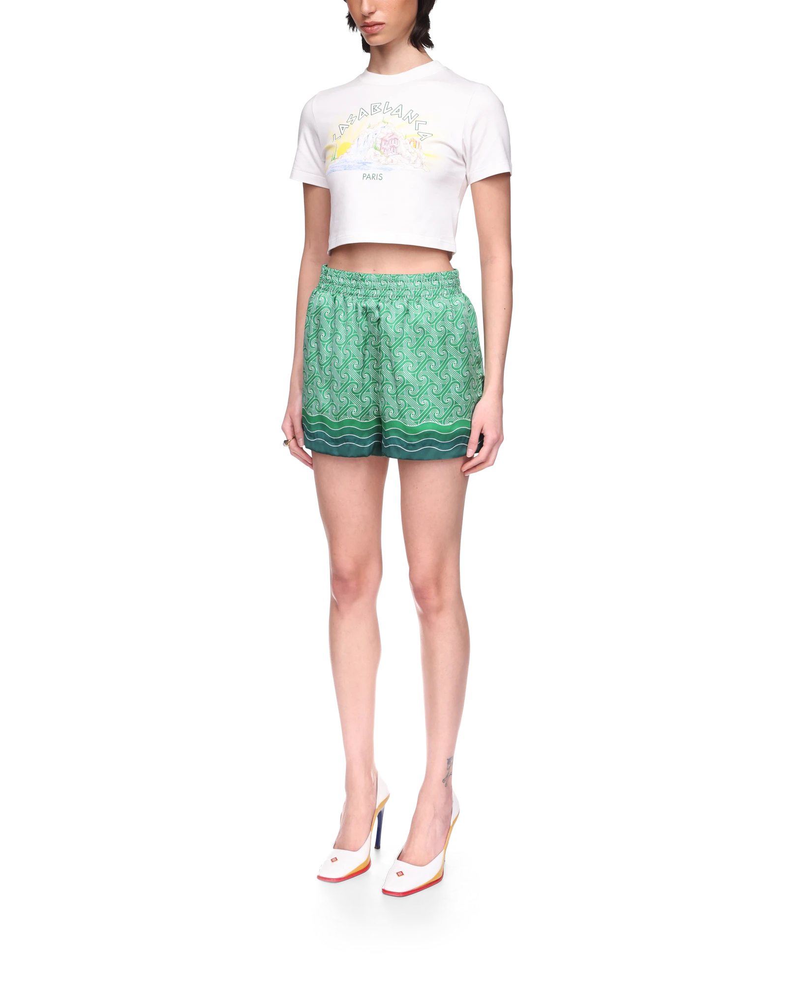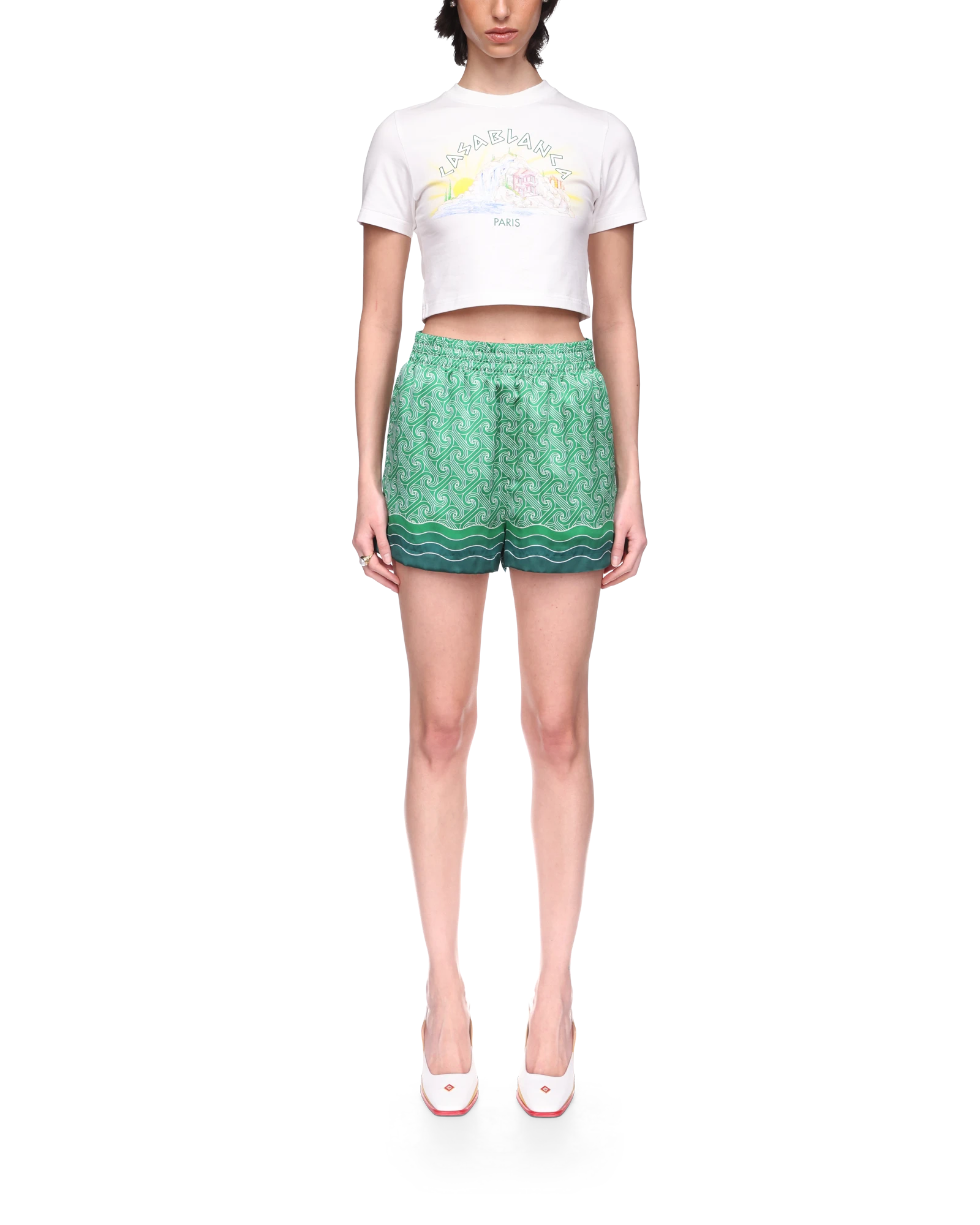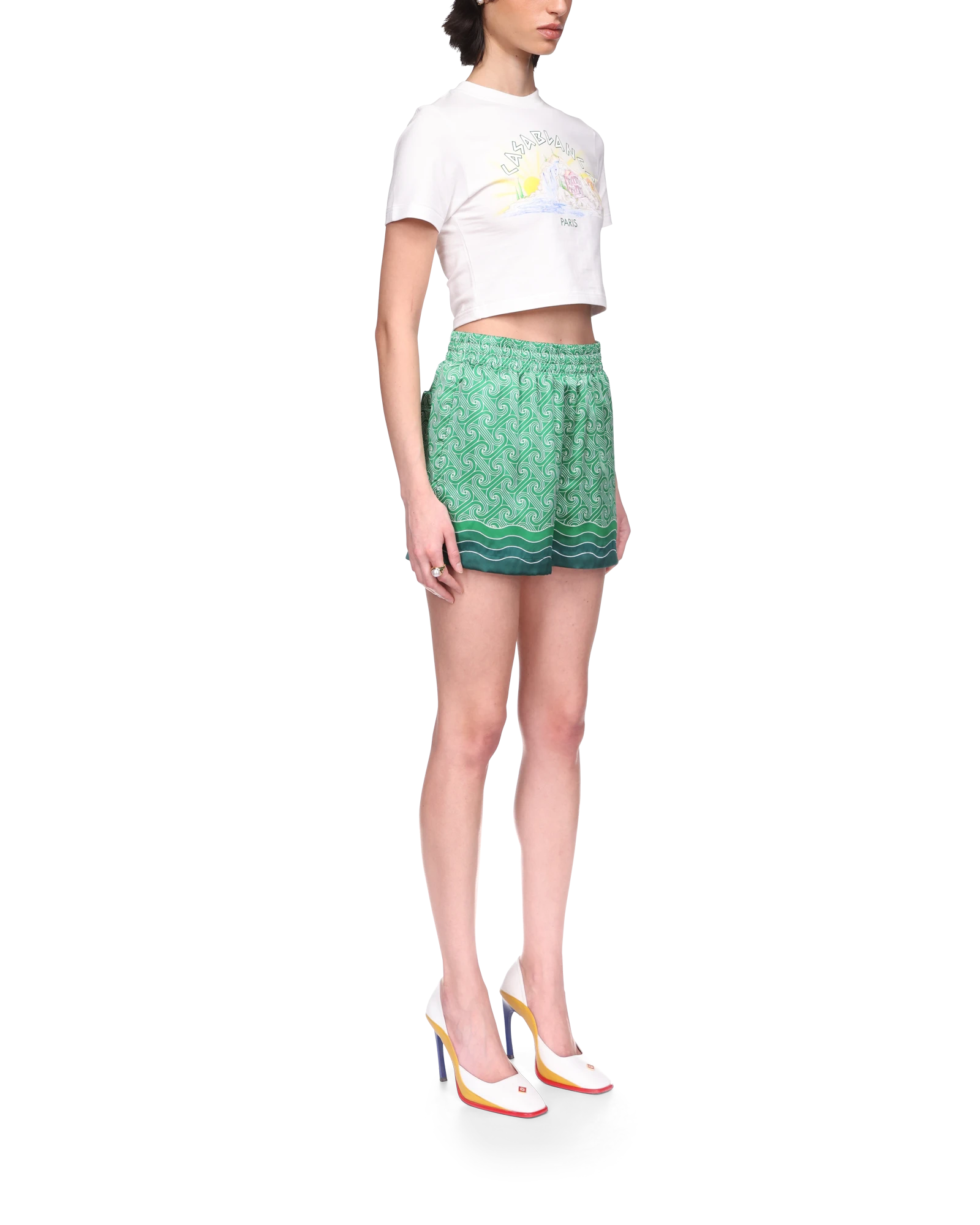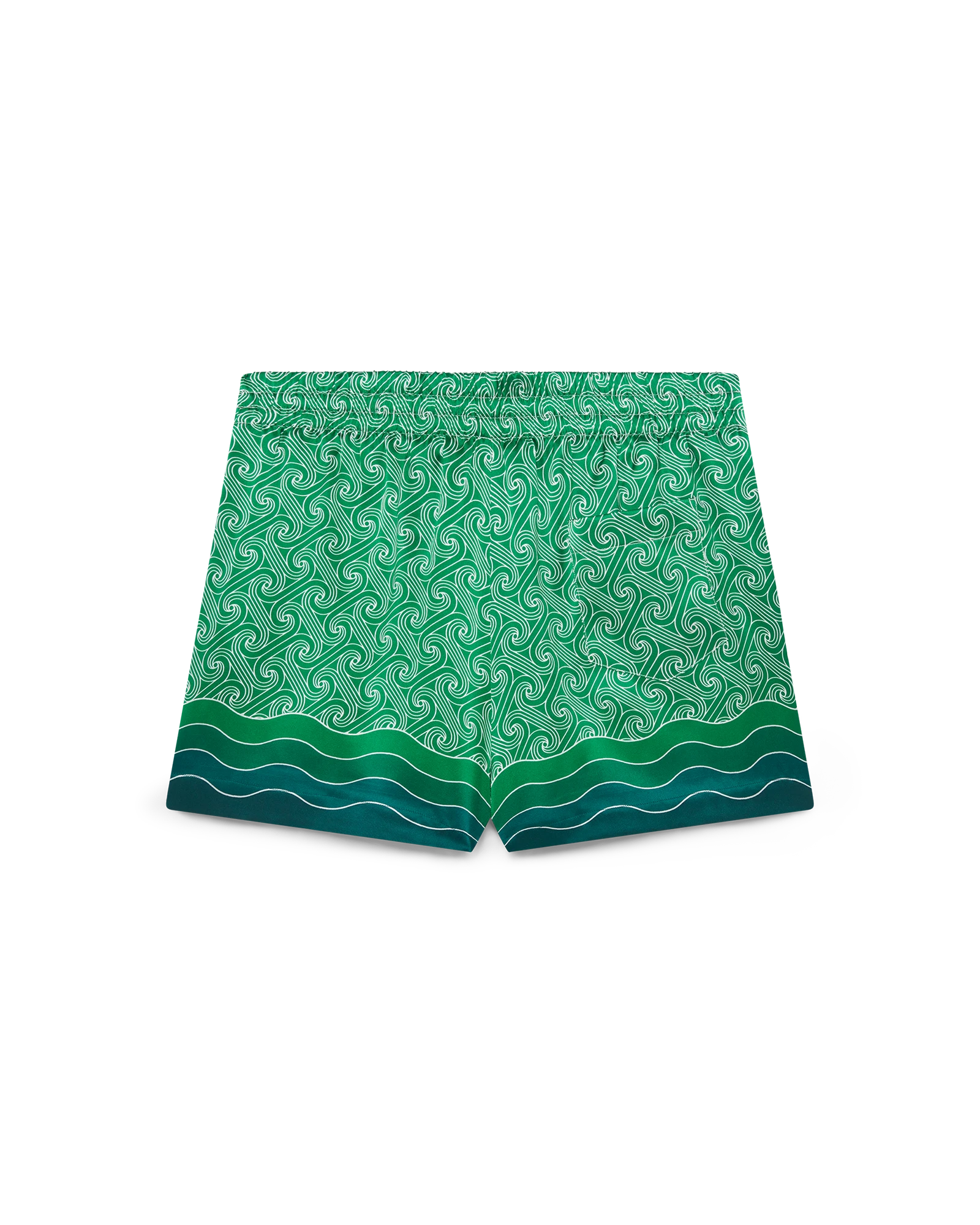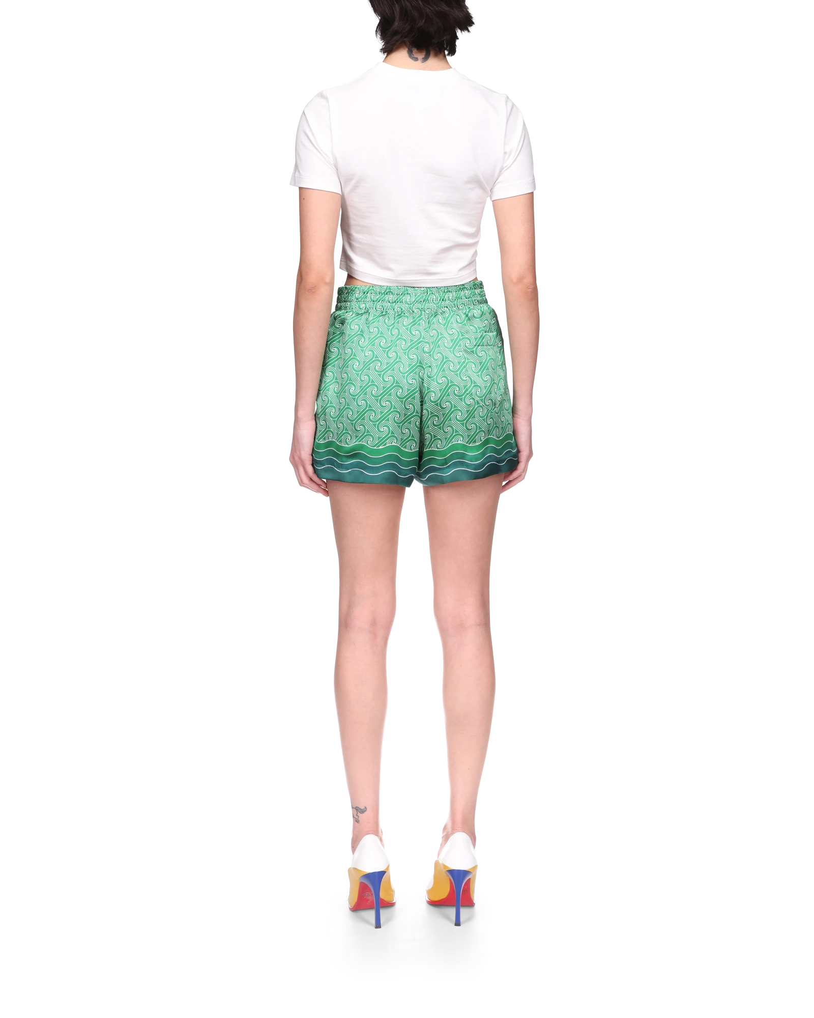 The column monogram silk shorts are an all-over printed design crafted from a silk satin fabric. Completed with an elasticated waistband with drawstring fastening. in-seam side pockets. a back pocket. a lining. and Memphis wave-inspired gradient hem detail.