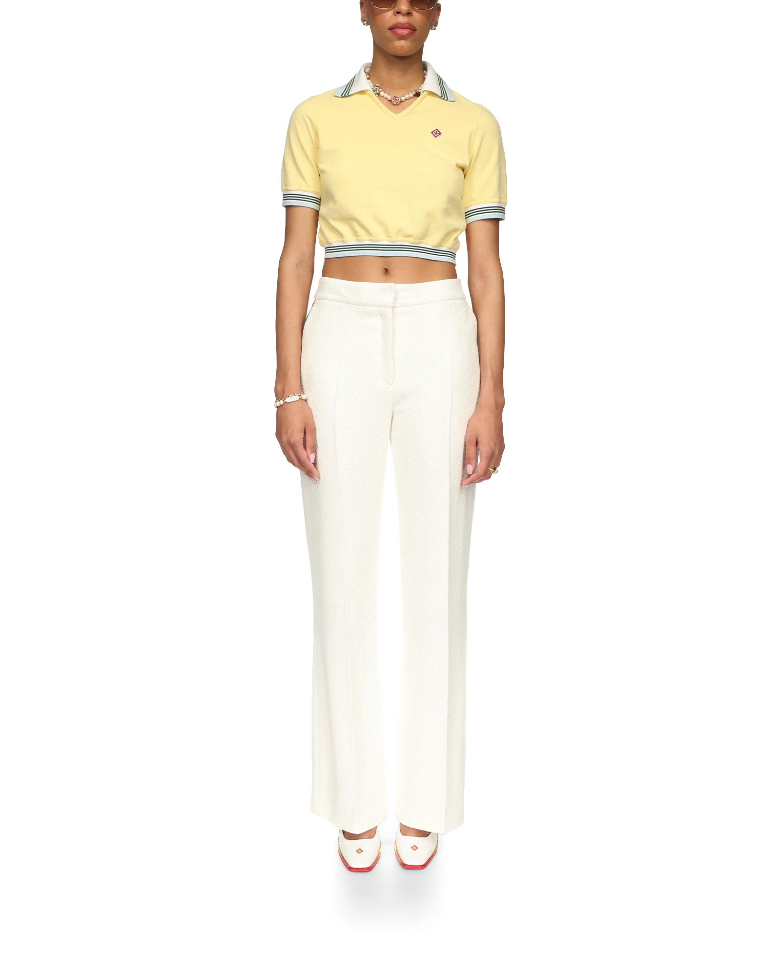 The cropped pique polo is a short-sleeve v-neck design with a slightly gathered hem. Crafted from 100% cotton pique fabric. and complete with stripe detailing ribbed collar and cuffs. Casablanca branded label and the house’s diamond logo.