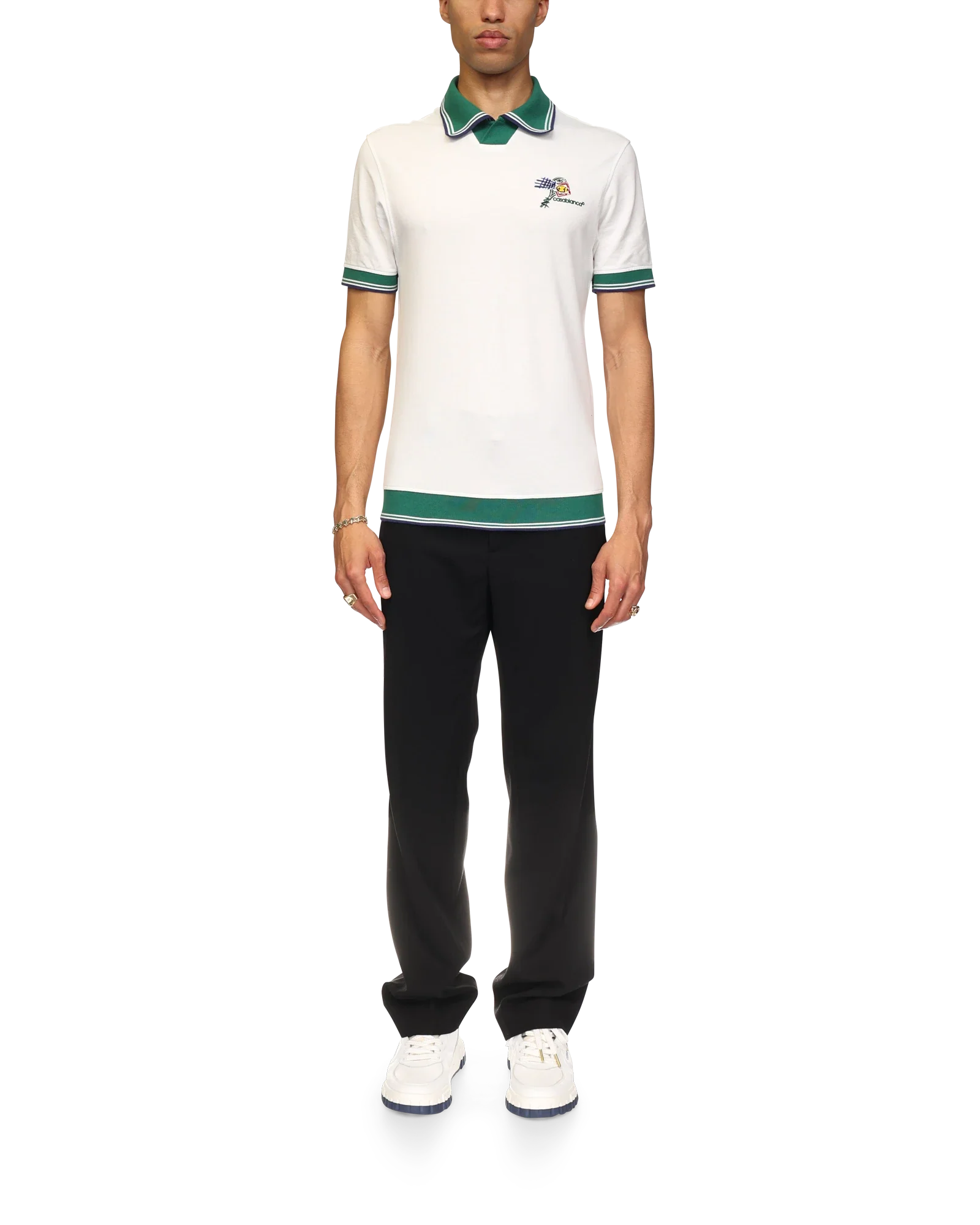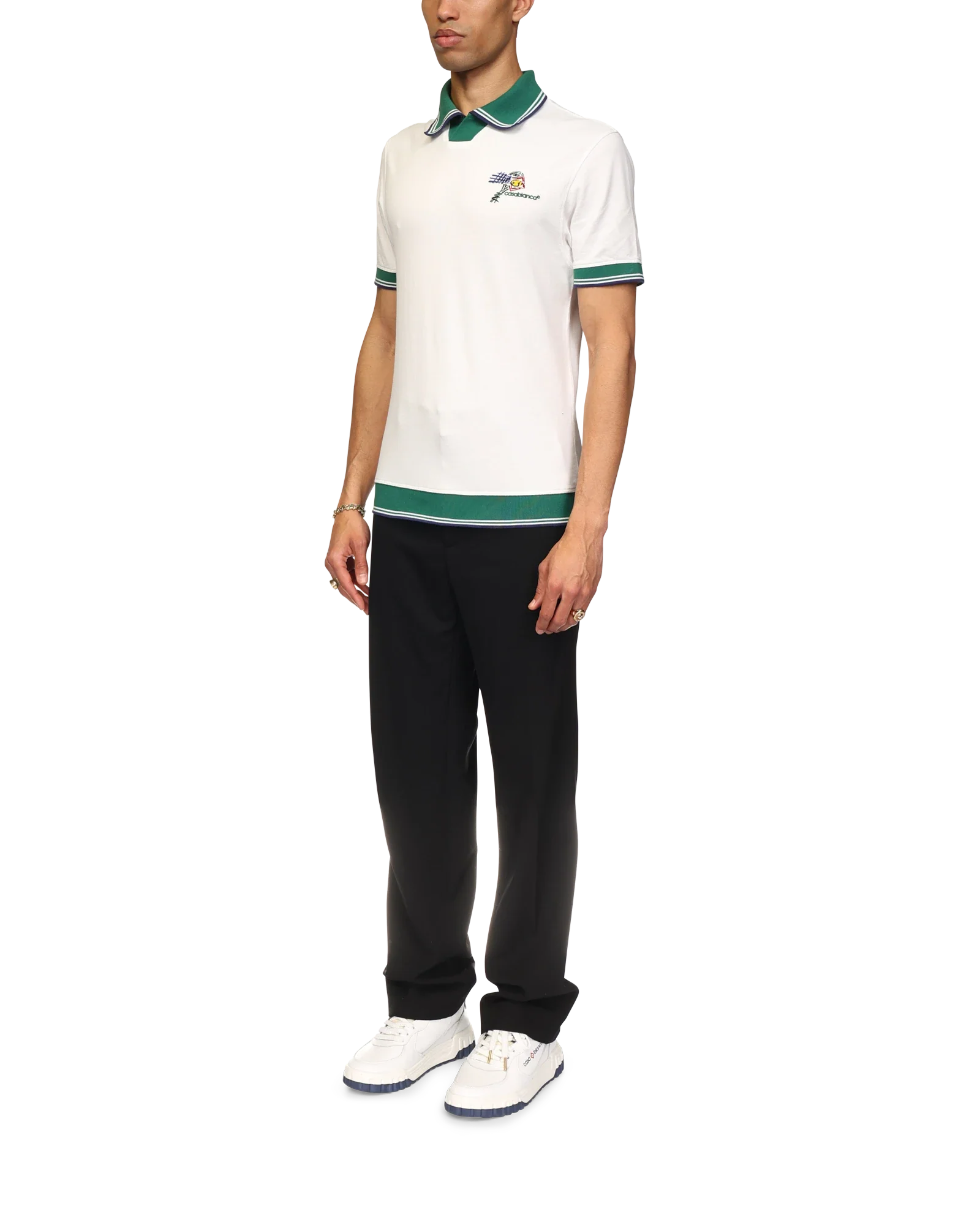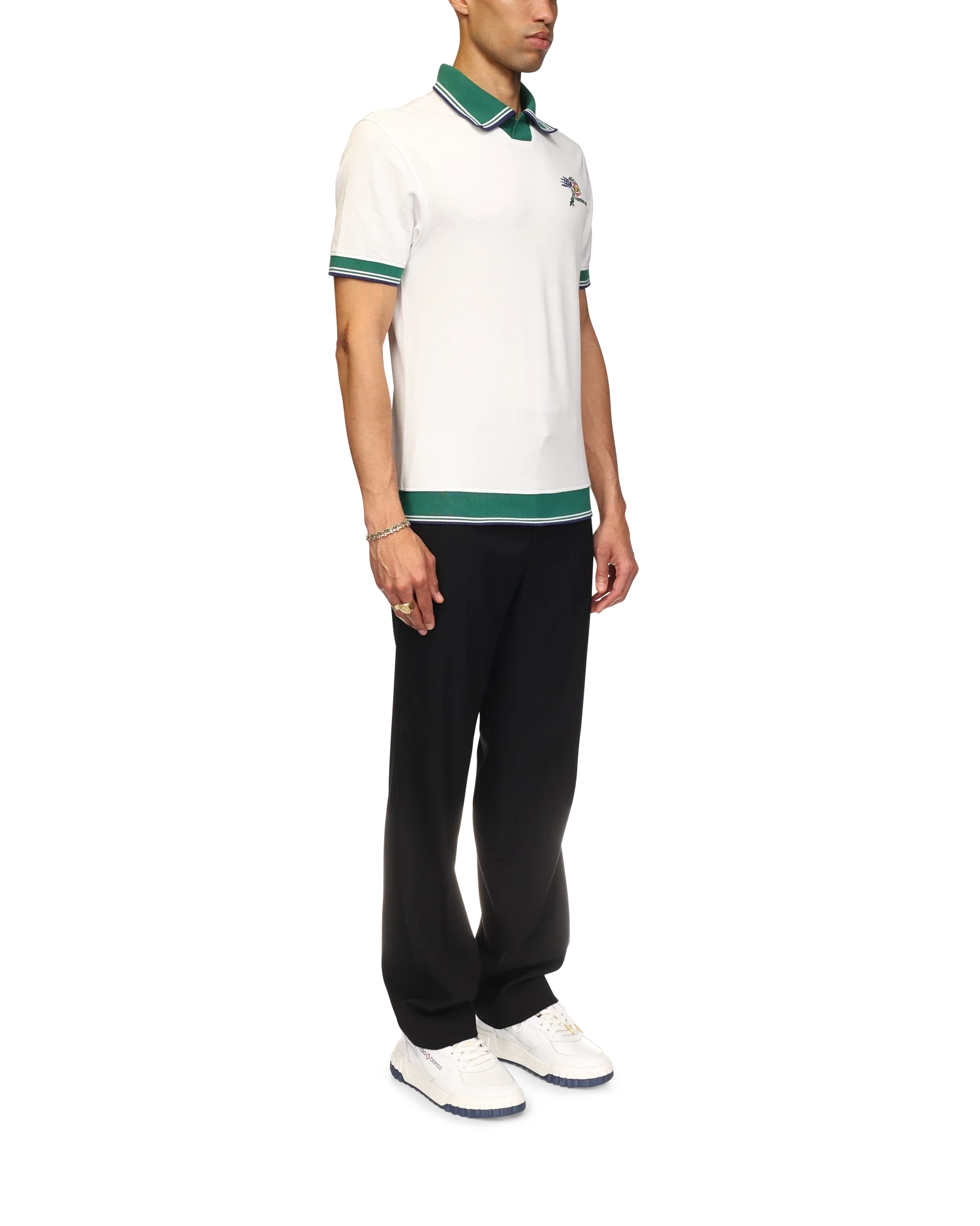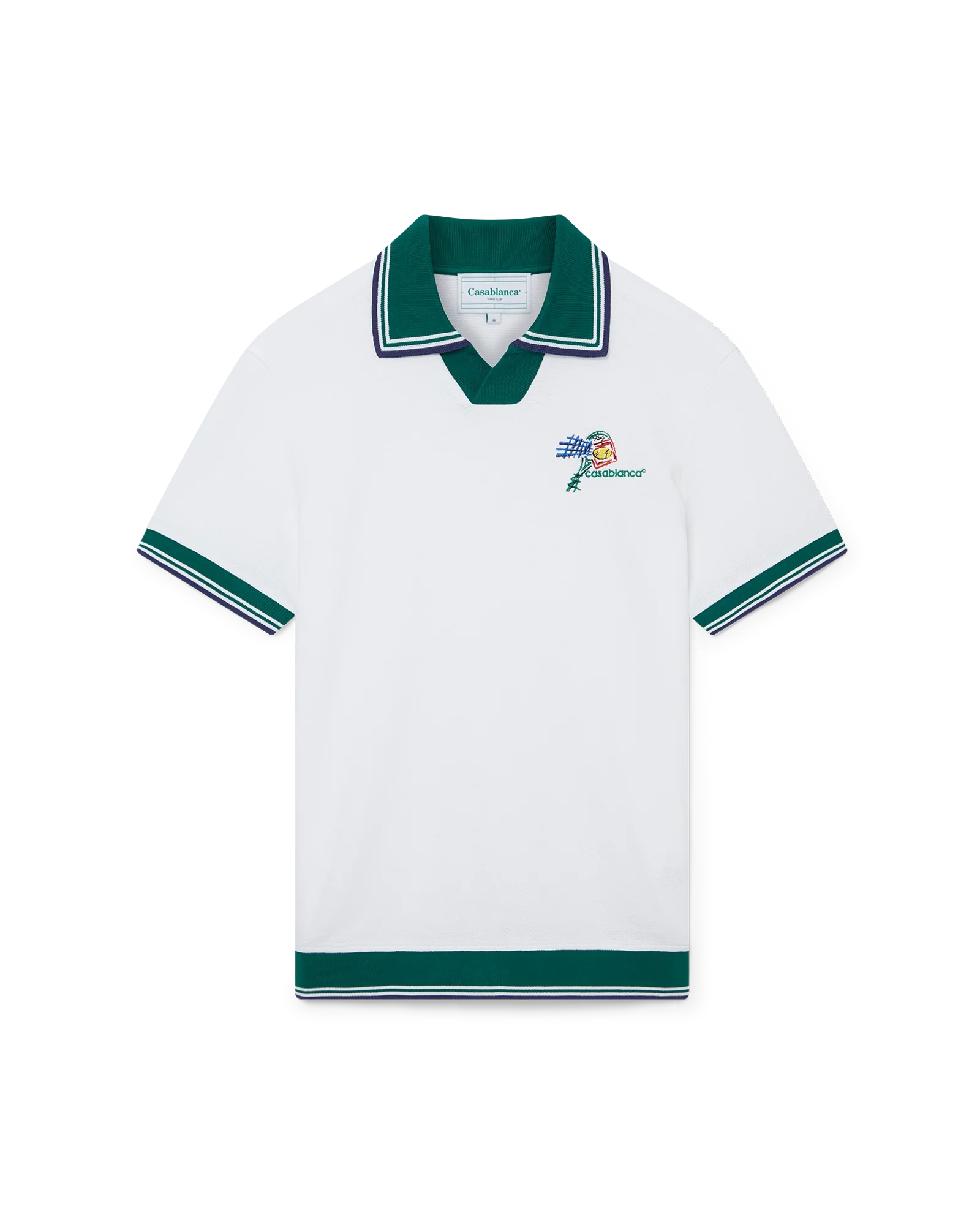 The Croquis De Tennis polo shirt is a short-sleeved design crafted from an organic cotton fabric. featuring the house’s tennis-inspired seasonal artwork and Casablanca logo on the left chest. Completed with a contrast v-neck with a green. navy and white stripe collar. and contrast striped rib detail on the cuffs and hem.