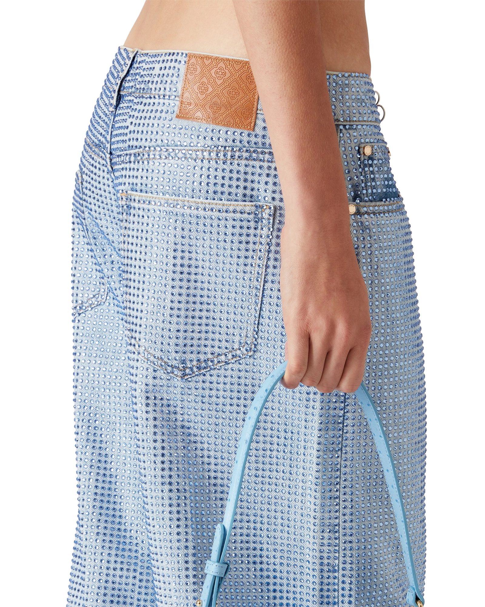 The crystal embellished jeans are a straight-leg design crafted from cotton fabric and feature hotfix crystal in an all-over pattern. Completed with gold-plated hardware. belt loops. front and back pockets. a branded leather patch and zip closure.