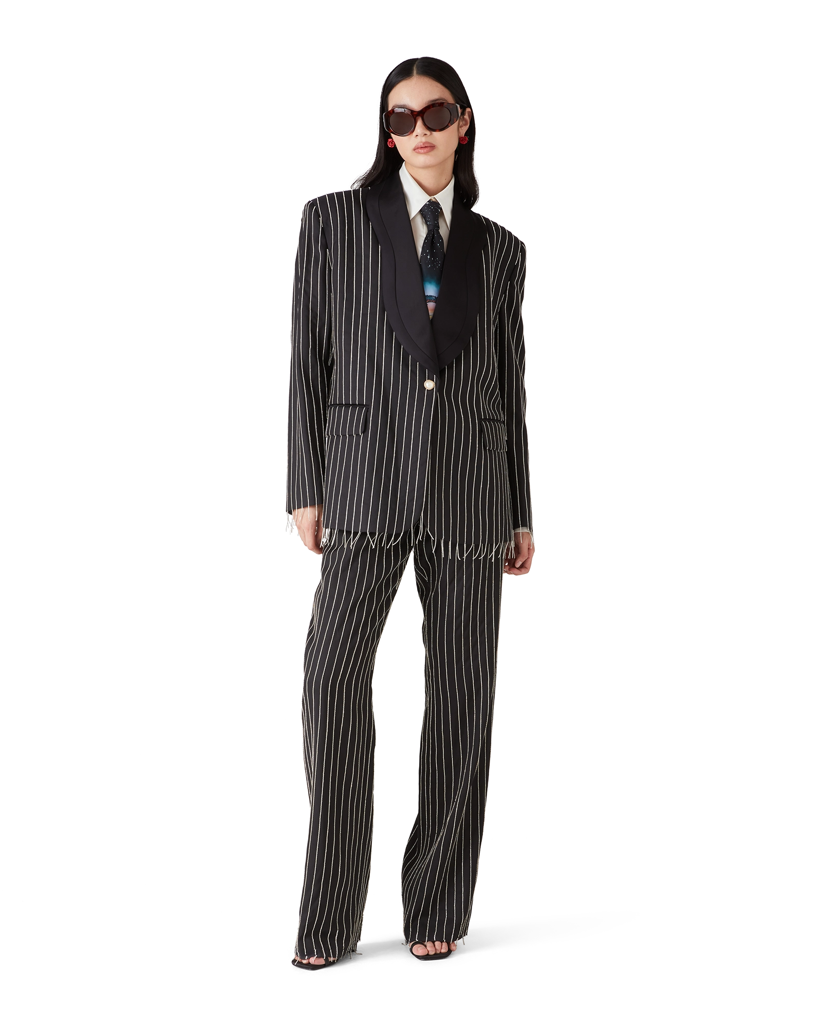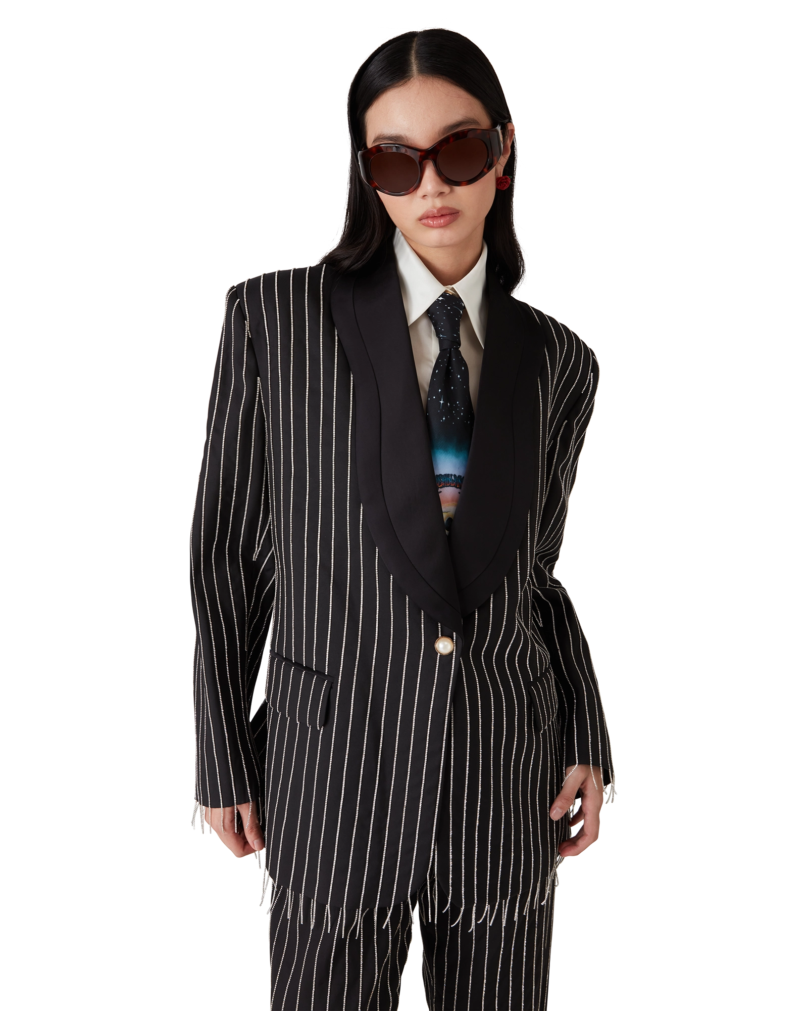 The crystal embellished tailored jacket is a single-breasted design crafted from silk tailoring fabric and crystals. Completed with a button closure. a signature gold rim pearl button. flap front pockets. a back vent. lapels. and a lining.