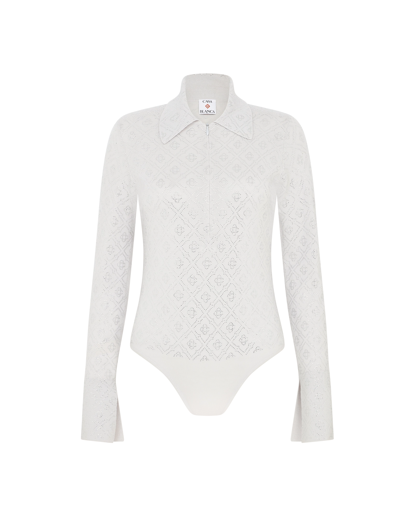 The crystal monogram knit bodysuit is a one-piece form-fitting long-sleeve design crafted from merino wool fabric and features the house’s crystal monogram. Completed with slit flared cuffs. half-placket zip closure. a peak collar. high-cut legs. and snap button closure.