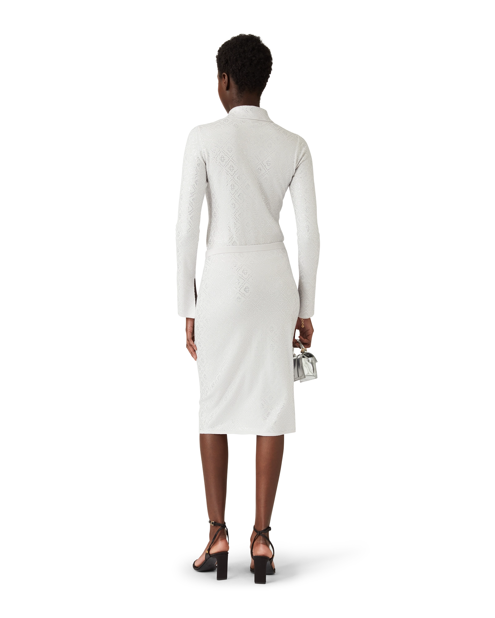 The crystal monogram knit skirt is a mid-length design crafted from merino wool fabric and features the house’s crystal monogram. Completed with an elasticated waistband.