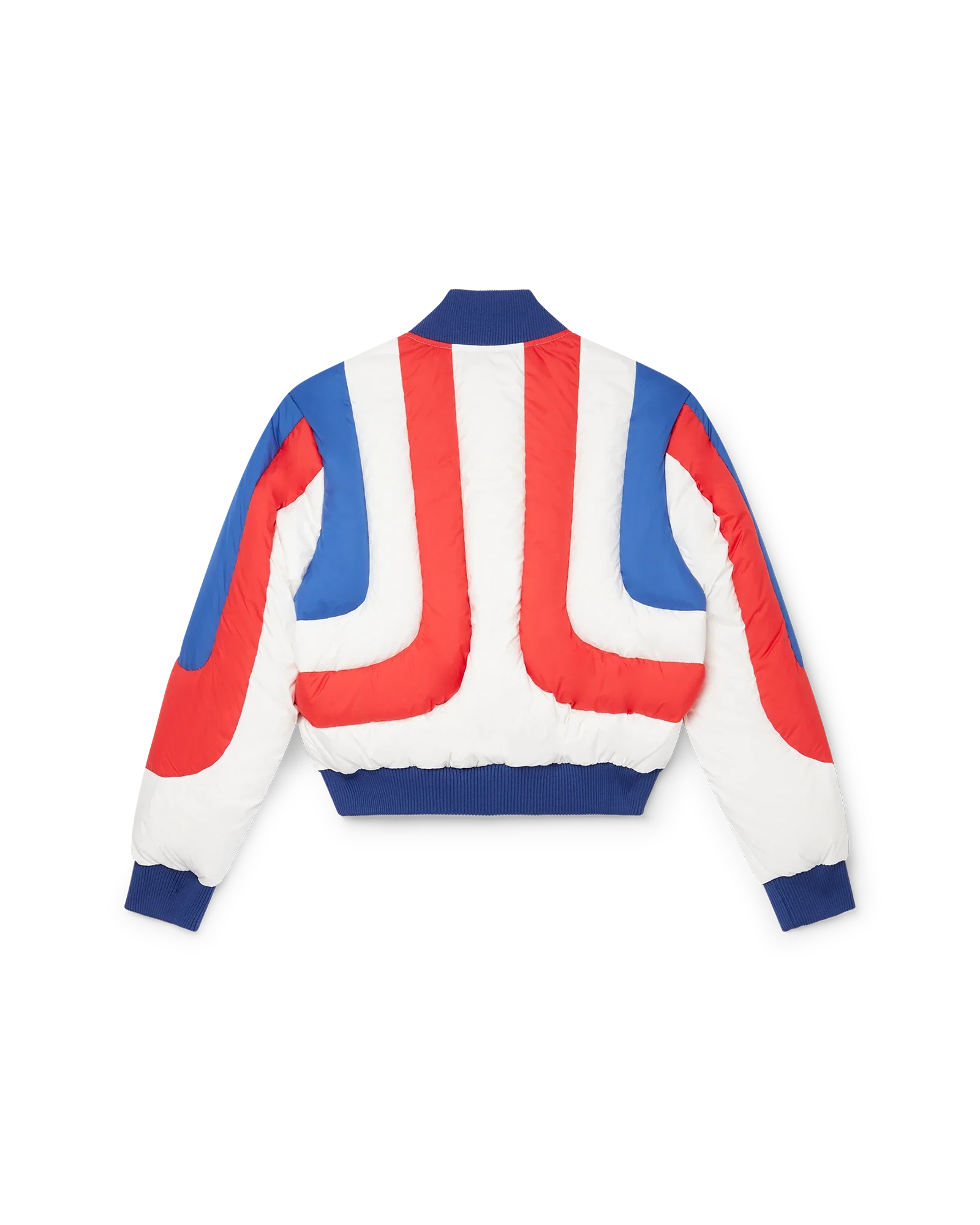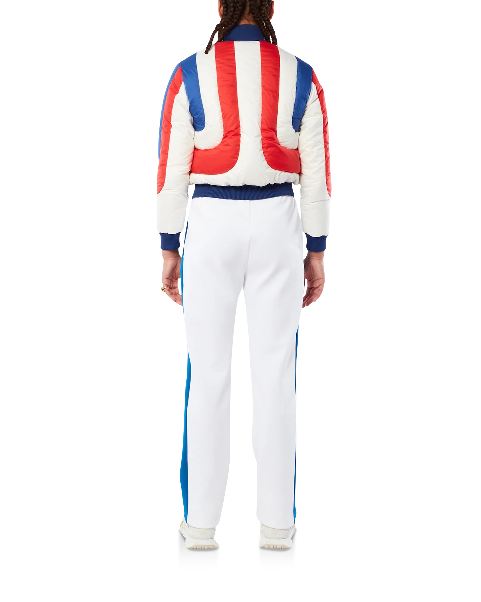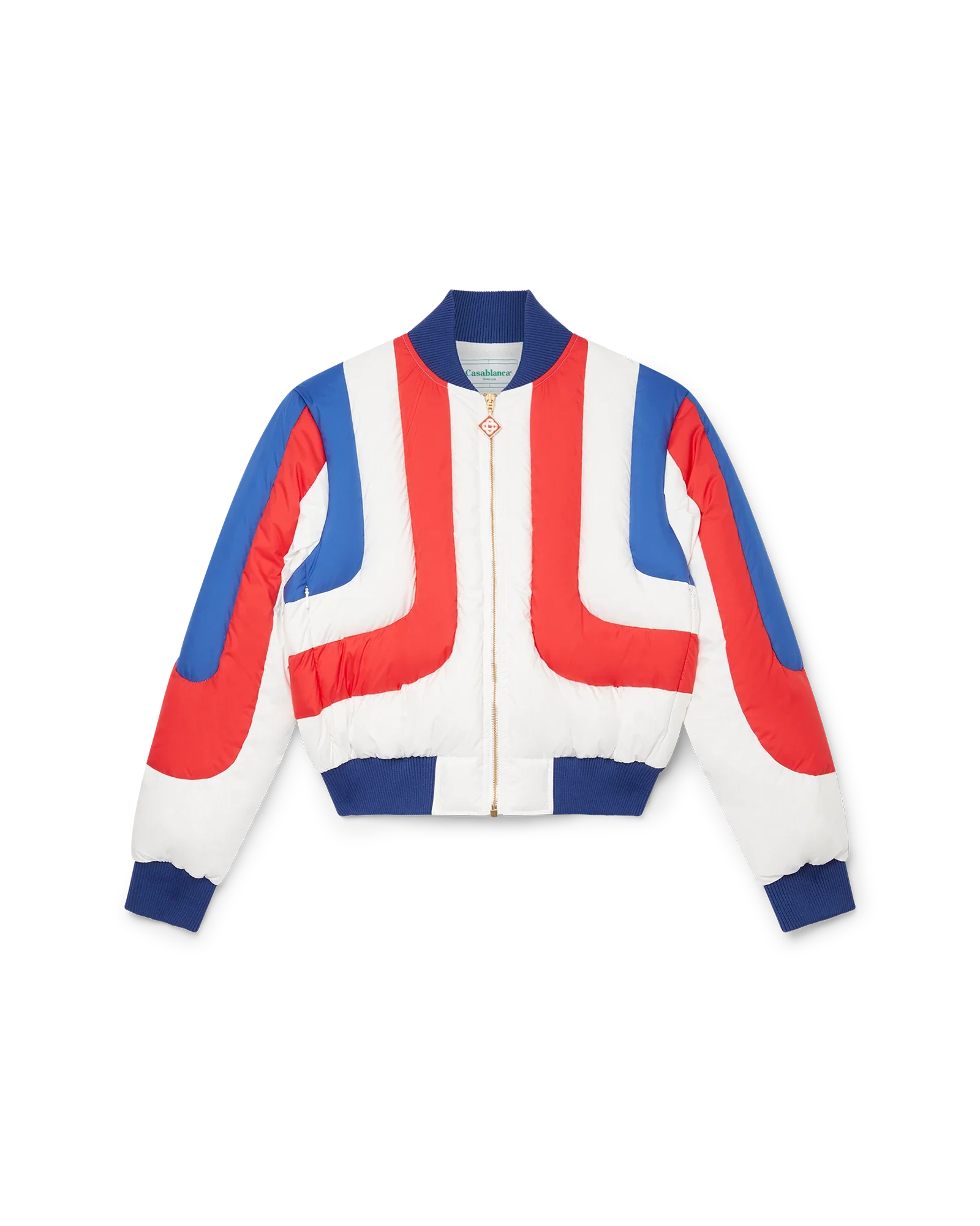 The curve panel puffer bomber jacket features a zipper closure with the house’s diamond logo and embodies the palette of France’s Tricolore. Completed with zip pockets. and a contrast rib collar. cuffs and hem.