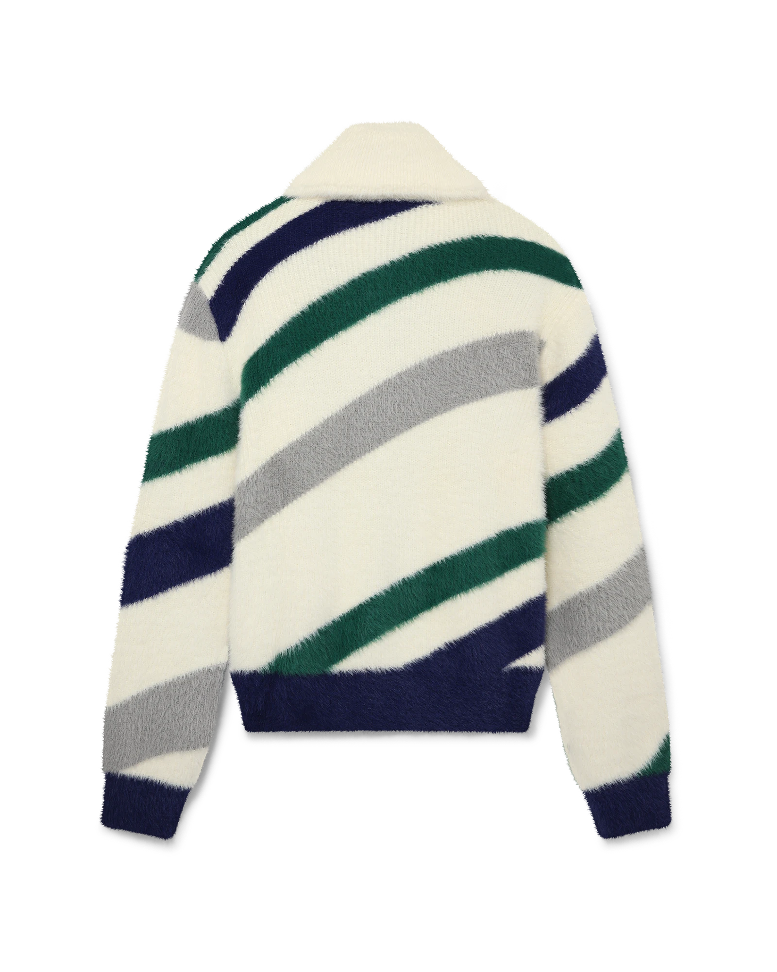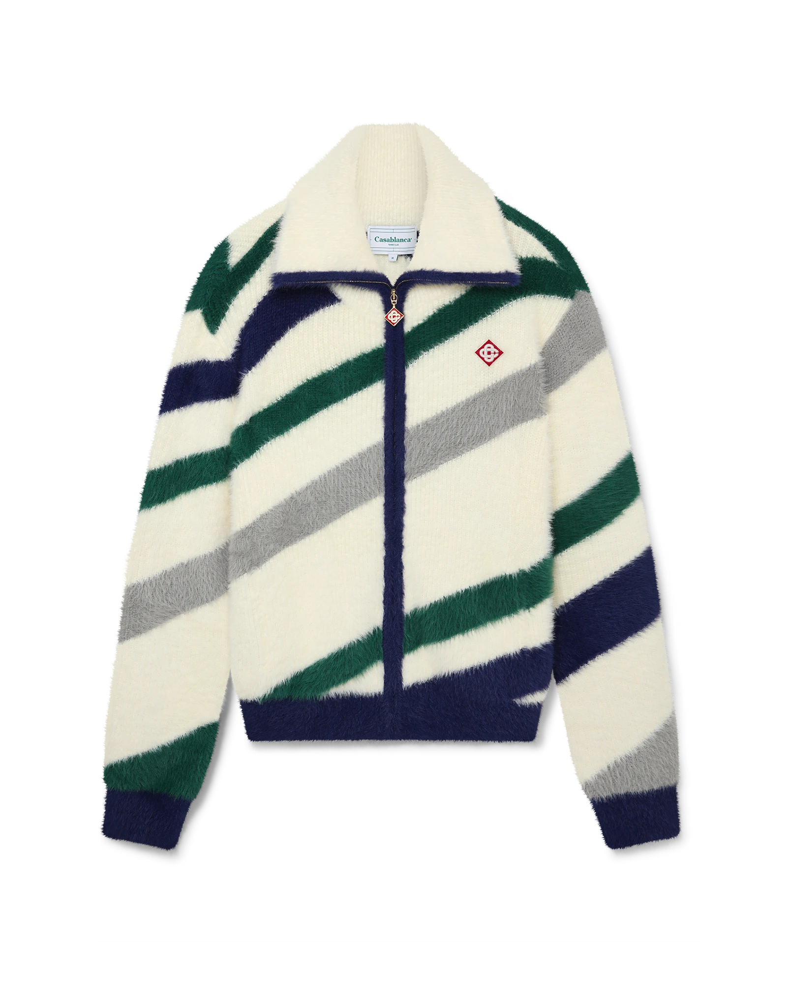 The diagonal stripe fluffy zip-up cardigan is a long-sleeve design crafted from a cotton blend fabric featuring the house’s signature diamond logo. Completed with a zip closure. gold-plated hardware. rib funnel collar. cuffs. and hem.