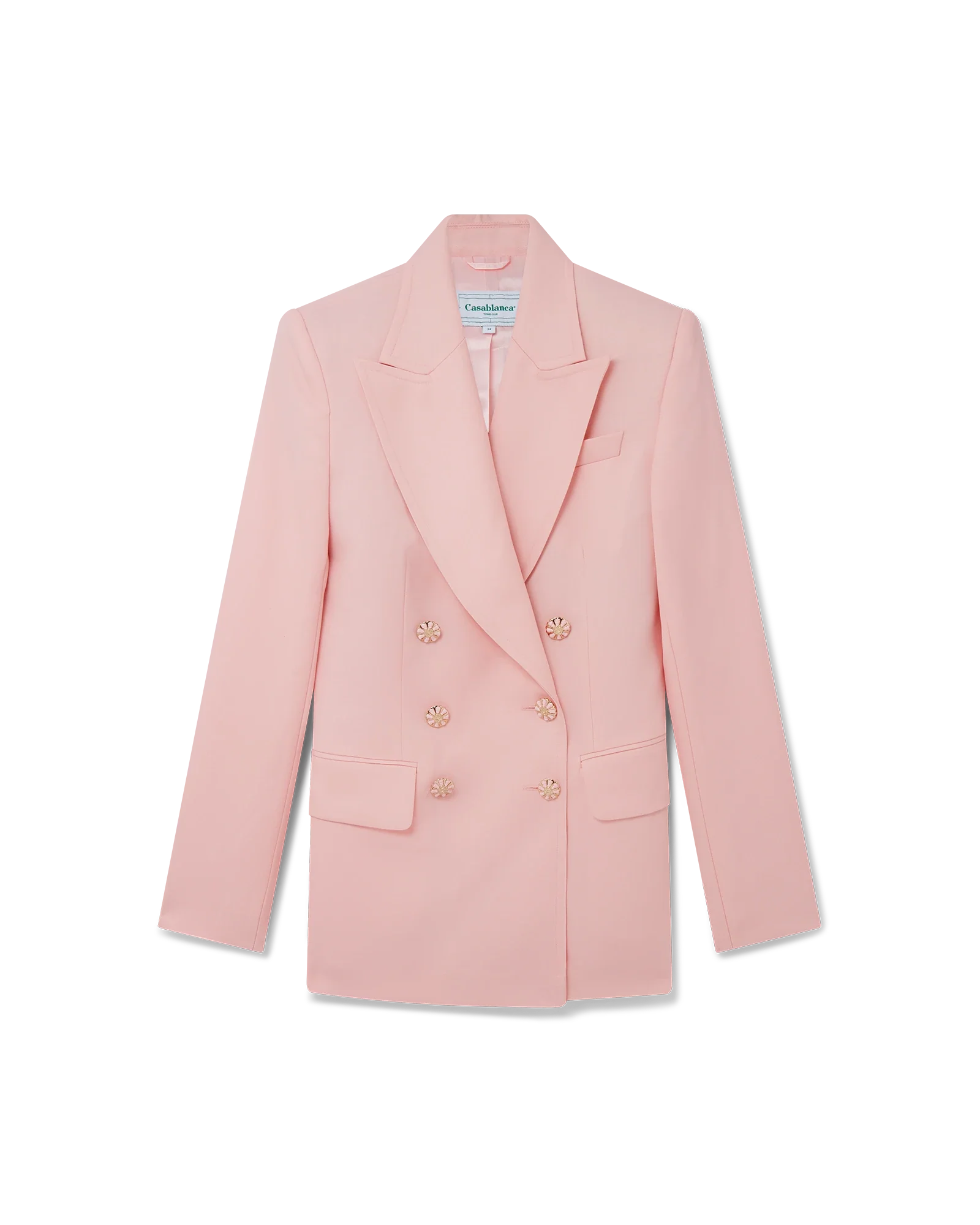 The pink Double Breasted Jacket is a classic tailored jacket rendered in a signature Casablanca pink hue in gabardine wool. The soft pink style is fastened with buttons and is intended to be worn closed and with coordinating trousers.