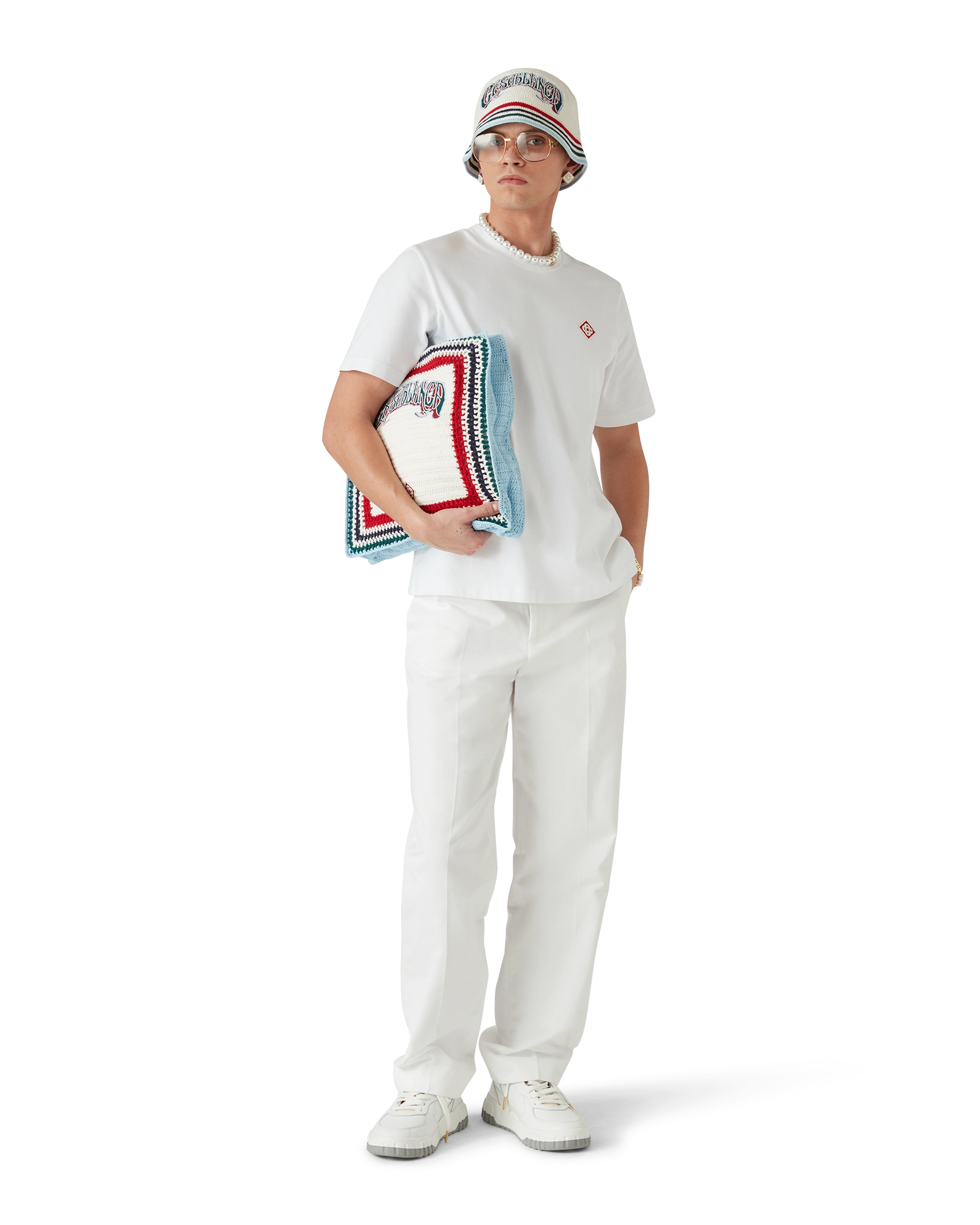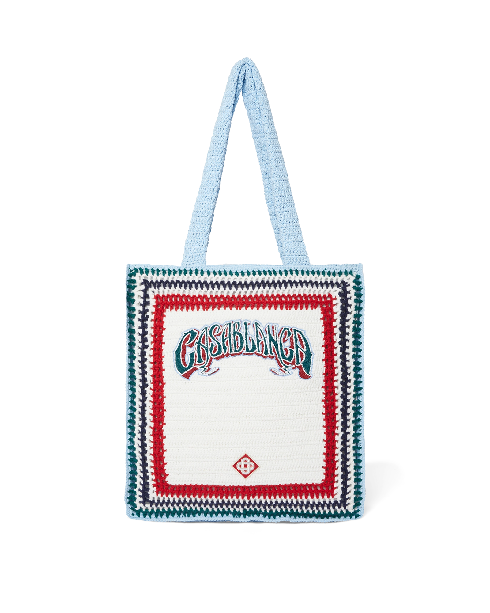 The Gothic crochet bag is a knitted style crafted from crochet cotton fabric and features a slouchy silhouette. Completed with embroidered hand-drawn typography of the Casablanca logo. inspired by the gothic typeface used in tattoos. and straps that allow the tote style to be worn over the shoulder or in the hand.