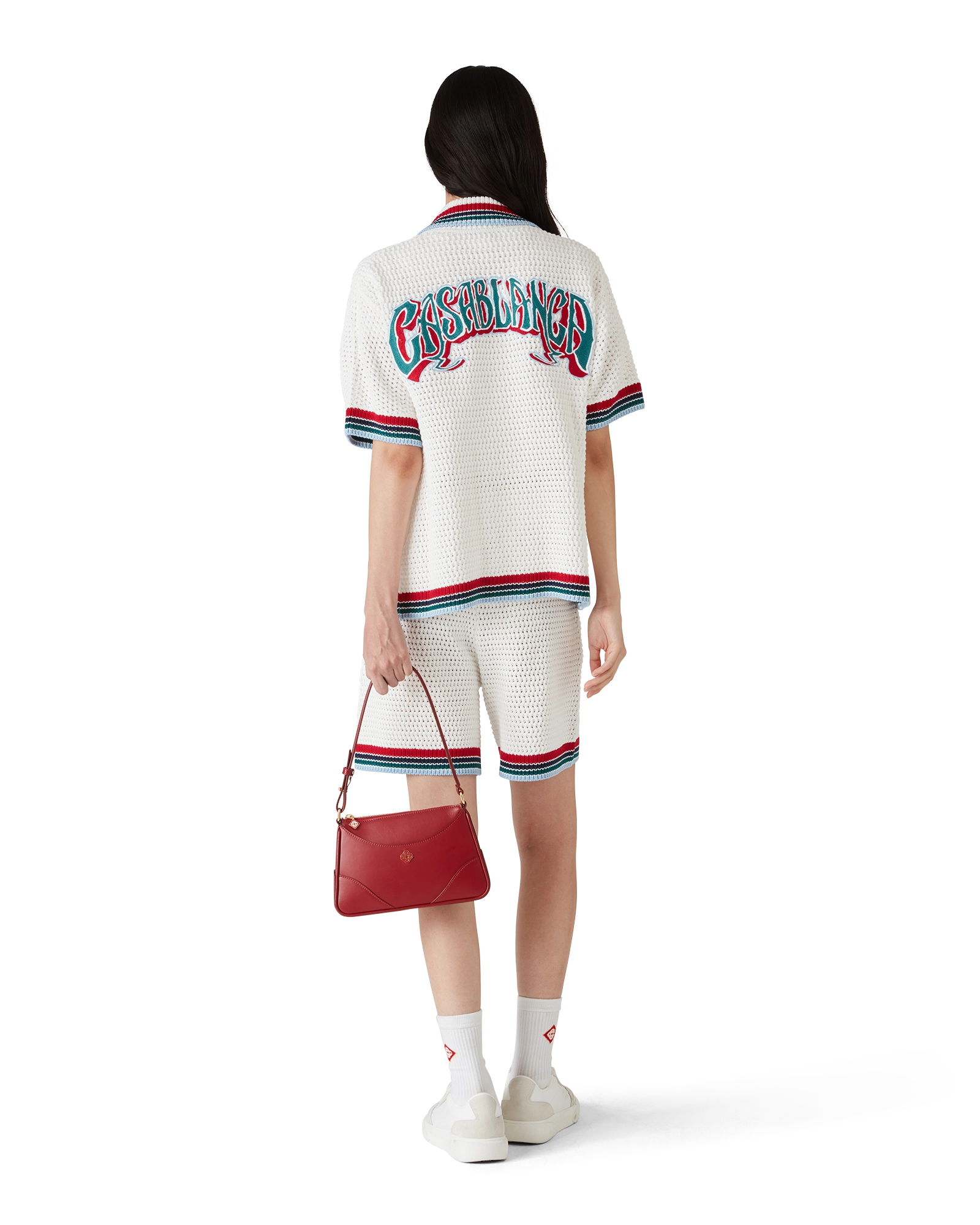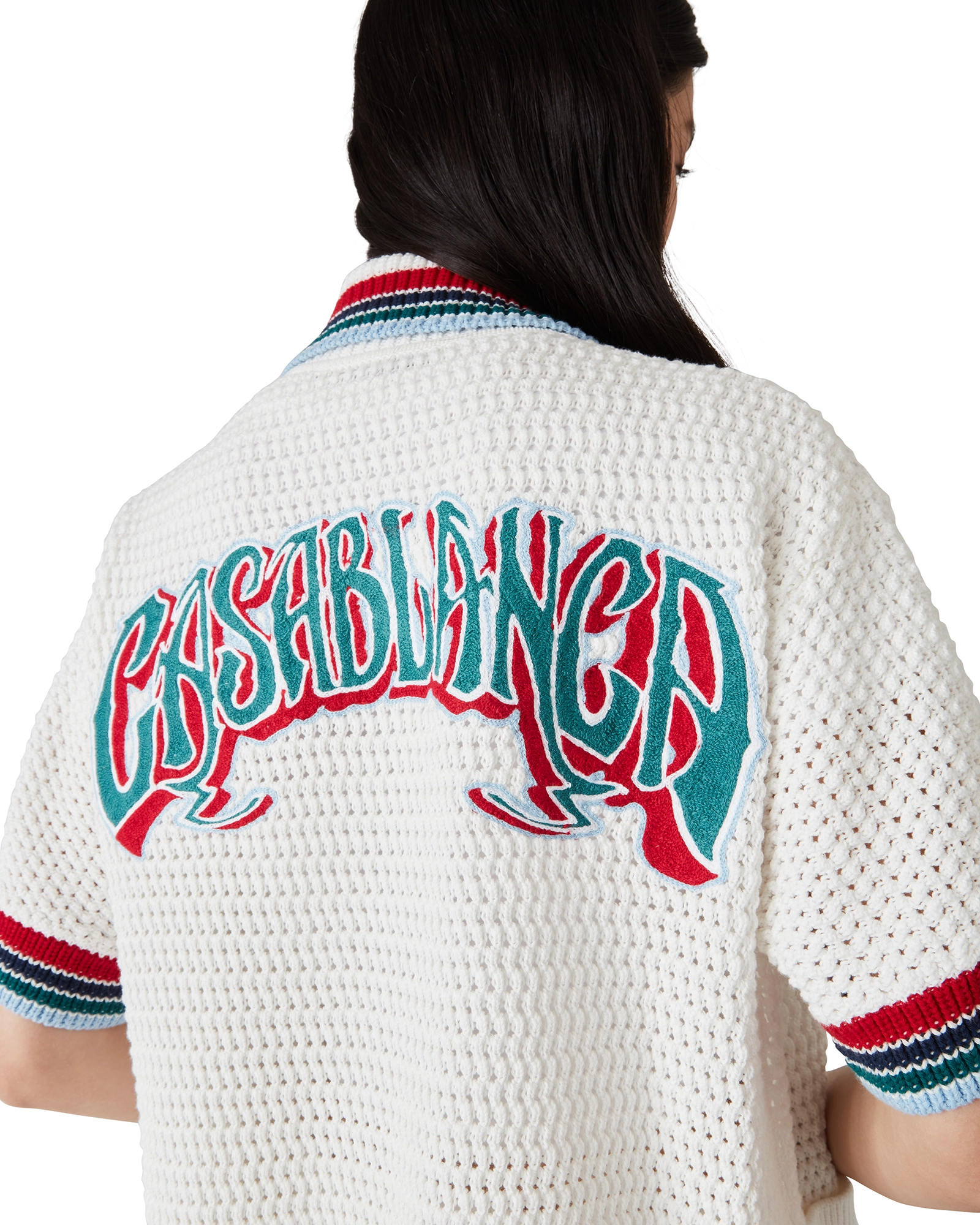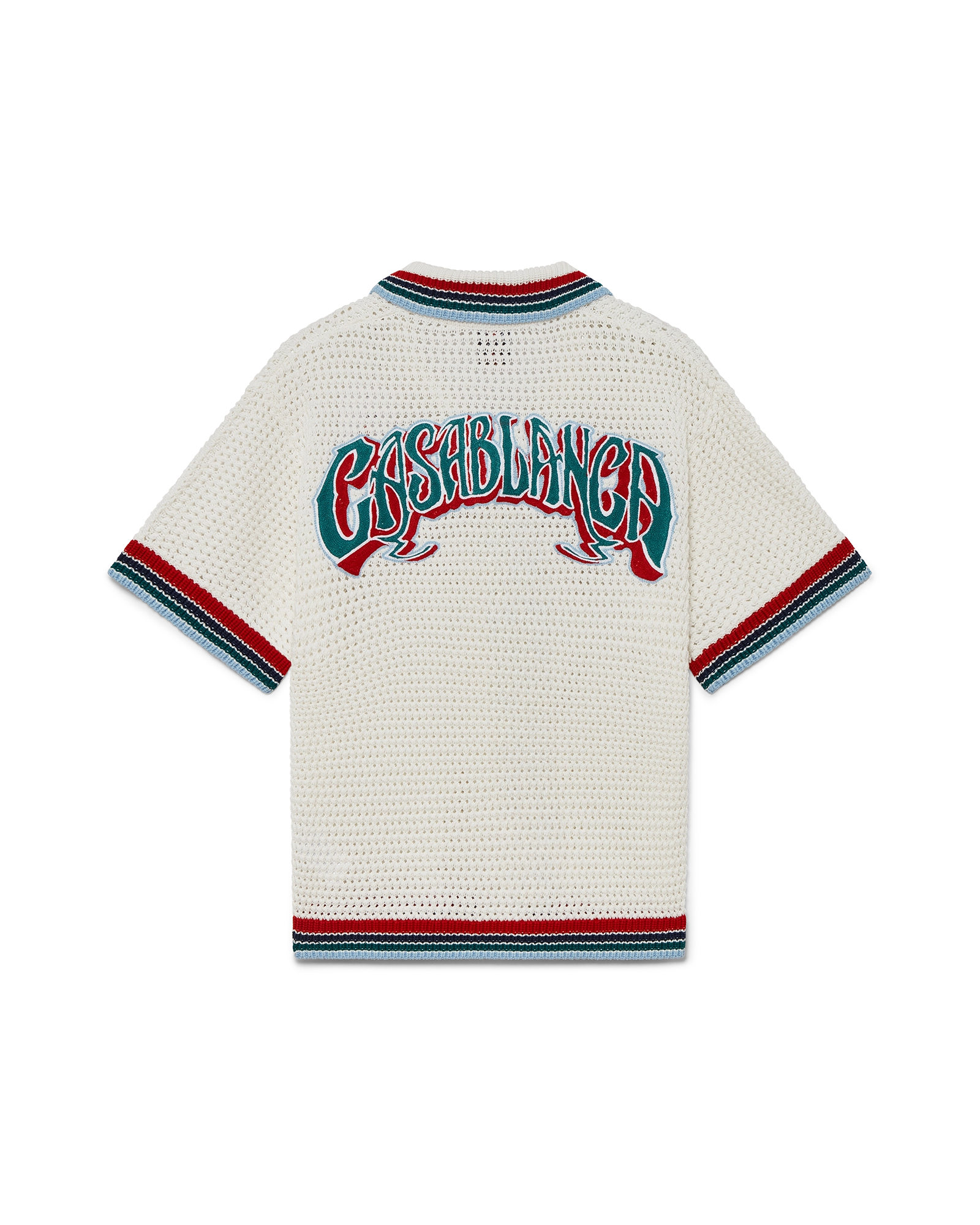 The gothic crochet shirt is a short-sleeve knitted design crafted from crochet cotton fabric and features the house’s signature diamond logo. Completed with signature gold rim pearl buttons. front patch pockets. and striped edge detail on the collar. cuffs and hem.