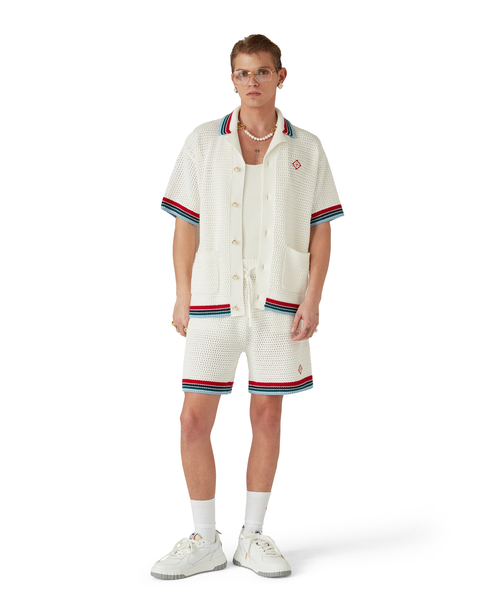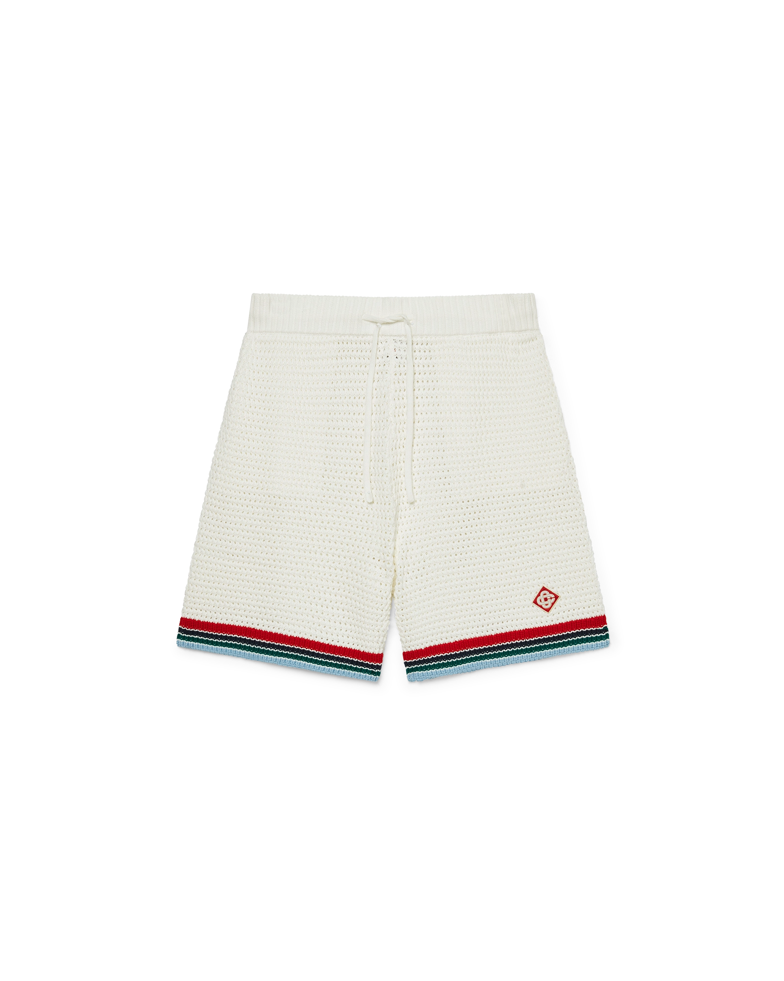 The Gothic crochet shorts are a soft textured design crafted from knitted cotton fabric. featuring the house’s signature diamond logo. Finished with a ribbed elasticated waistband with drawstring fastening. side pockets. and contrast stripe detail on the legs.