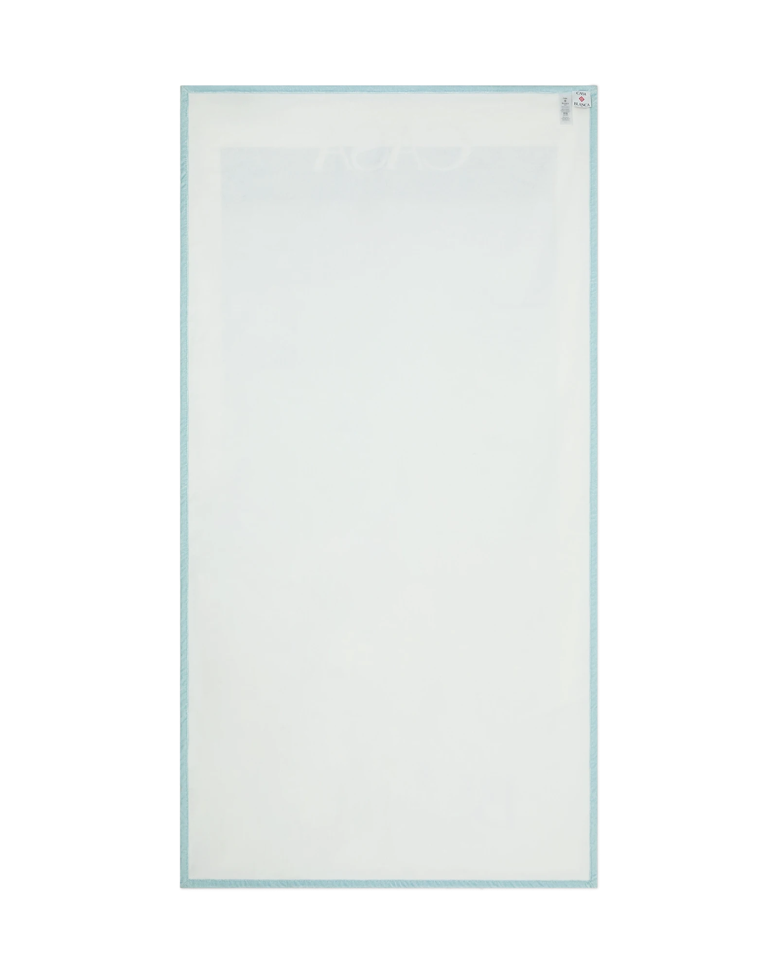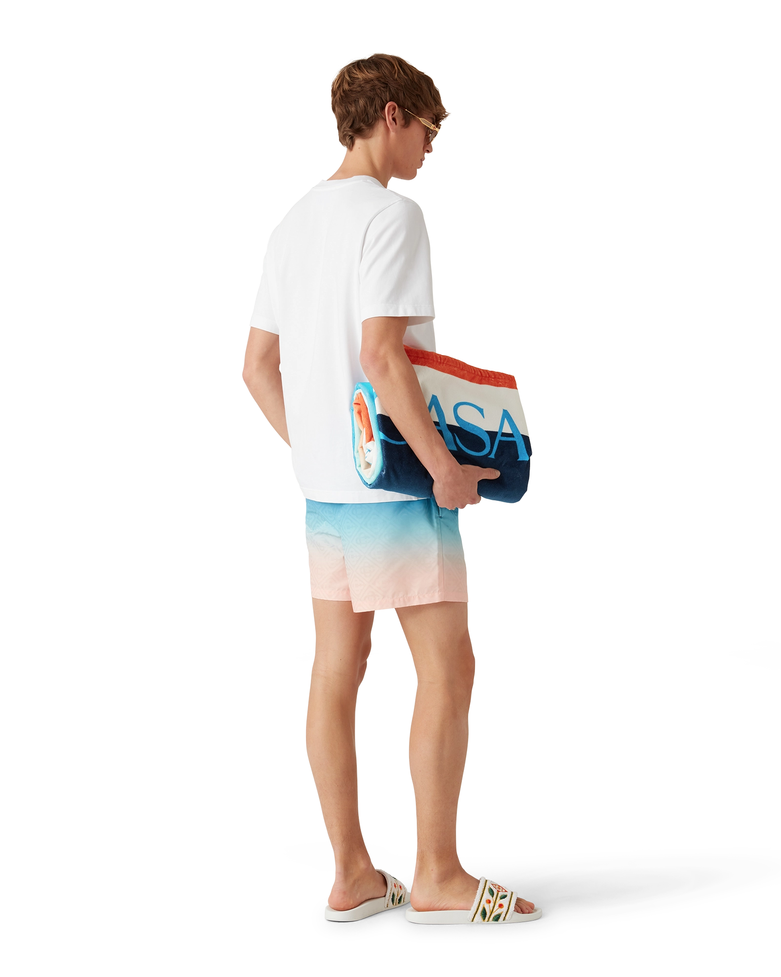 The gradient beach towel is a printed design crafted from a cotton towelling fabric. Completed with the house’s stacked logo and a light blue border.