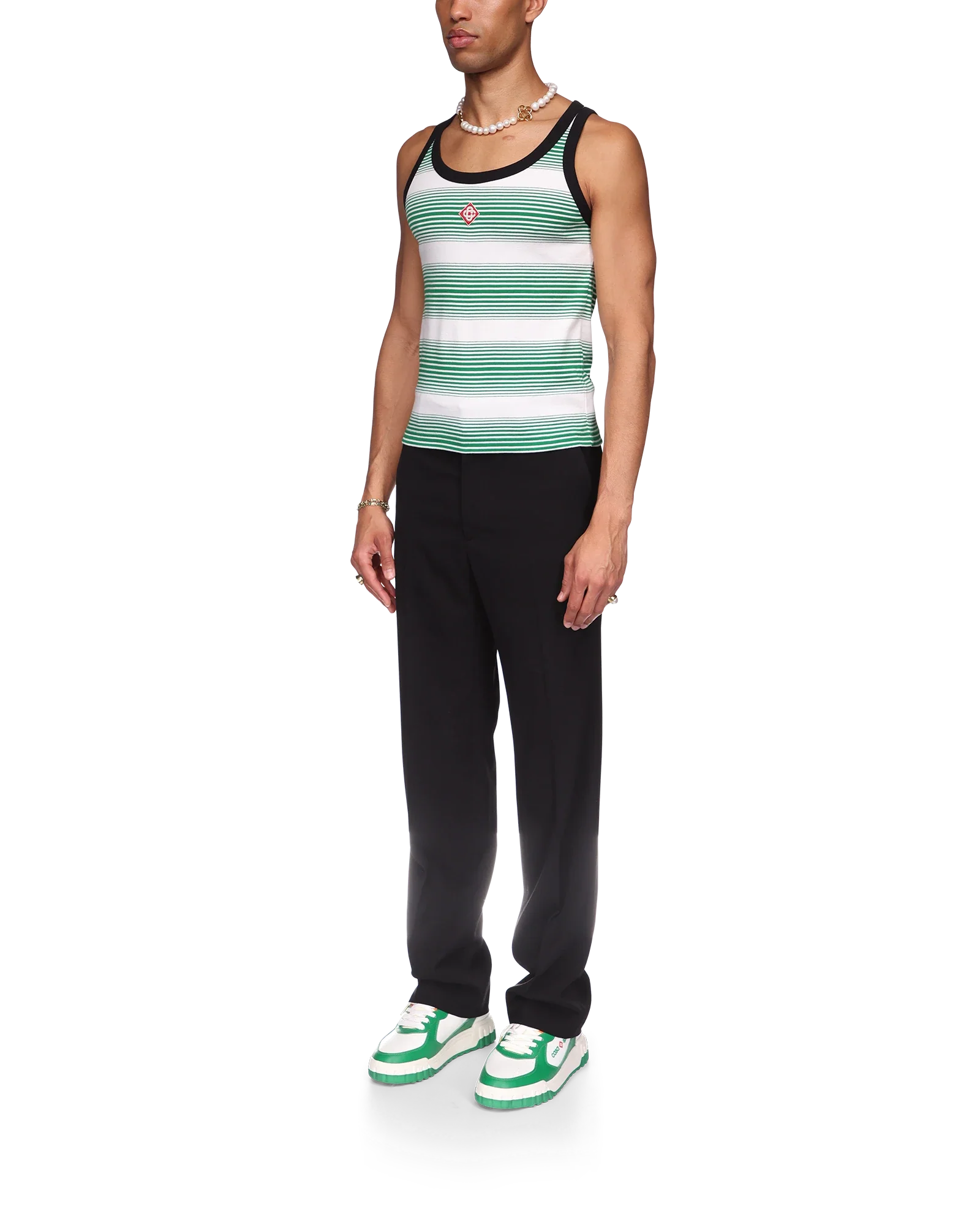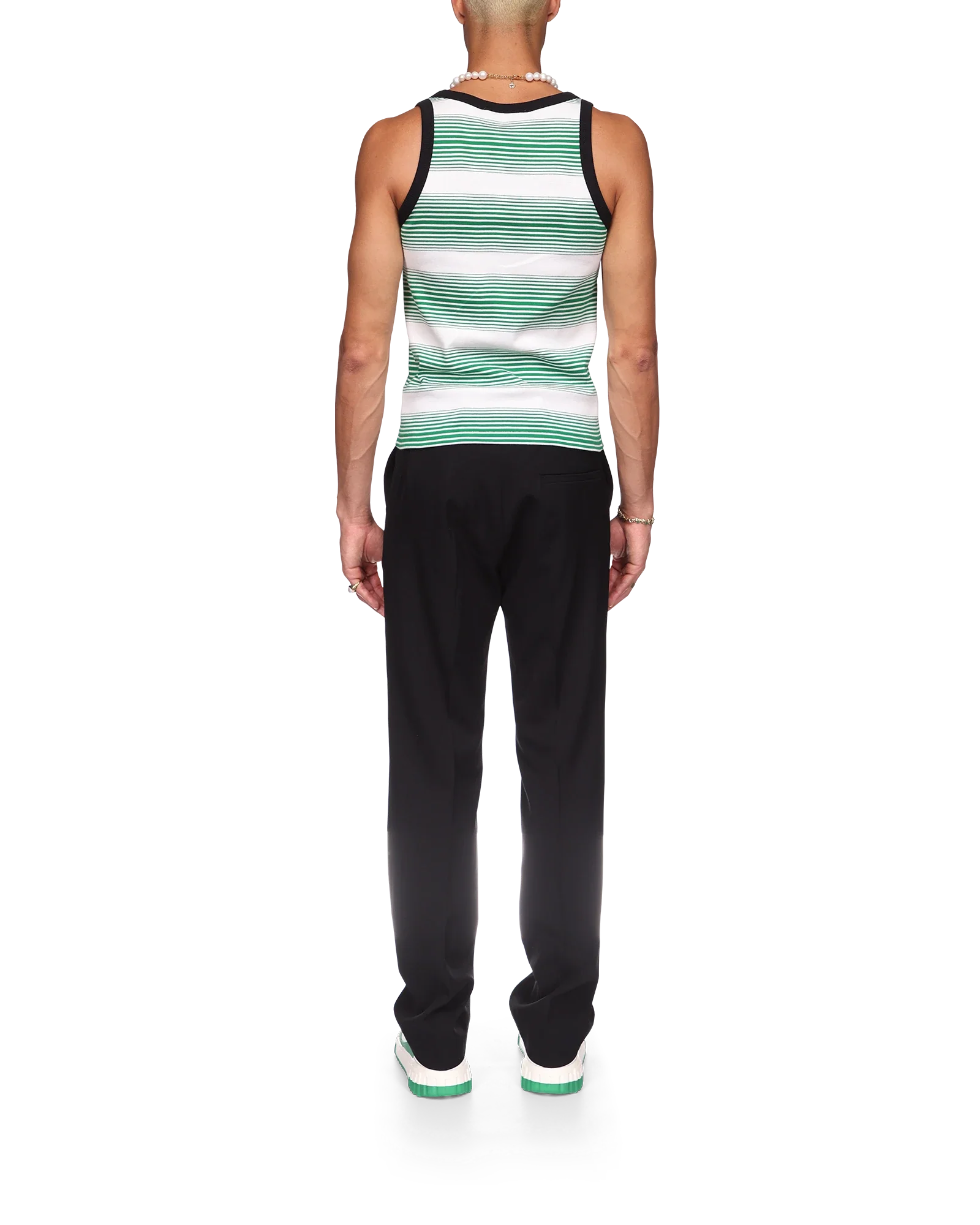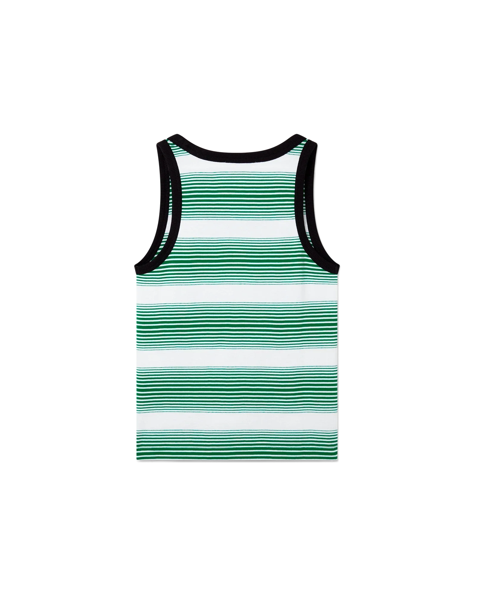 The gradient stripe ringer tank top is a classic design crafted from a yarn-dyed organic cotton fabric and inspired by the colours of the Nigerian flag. Finished with a scoop neck. a contrast rib collar and armholes.