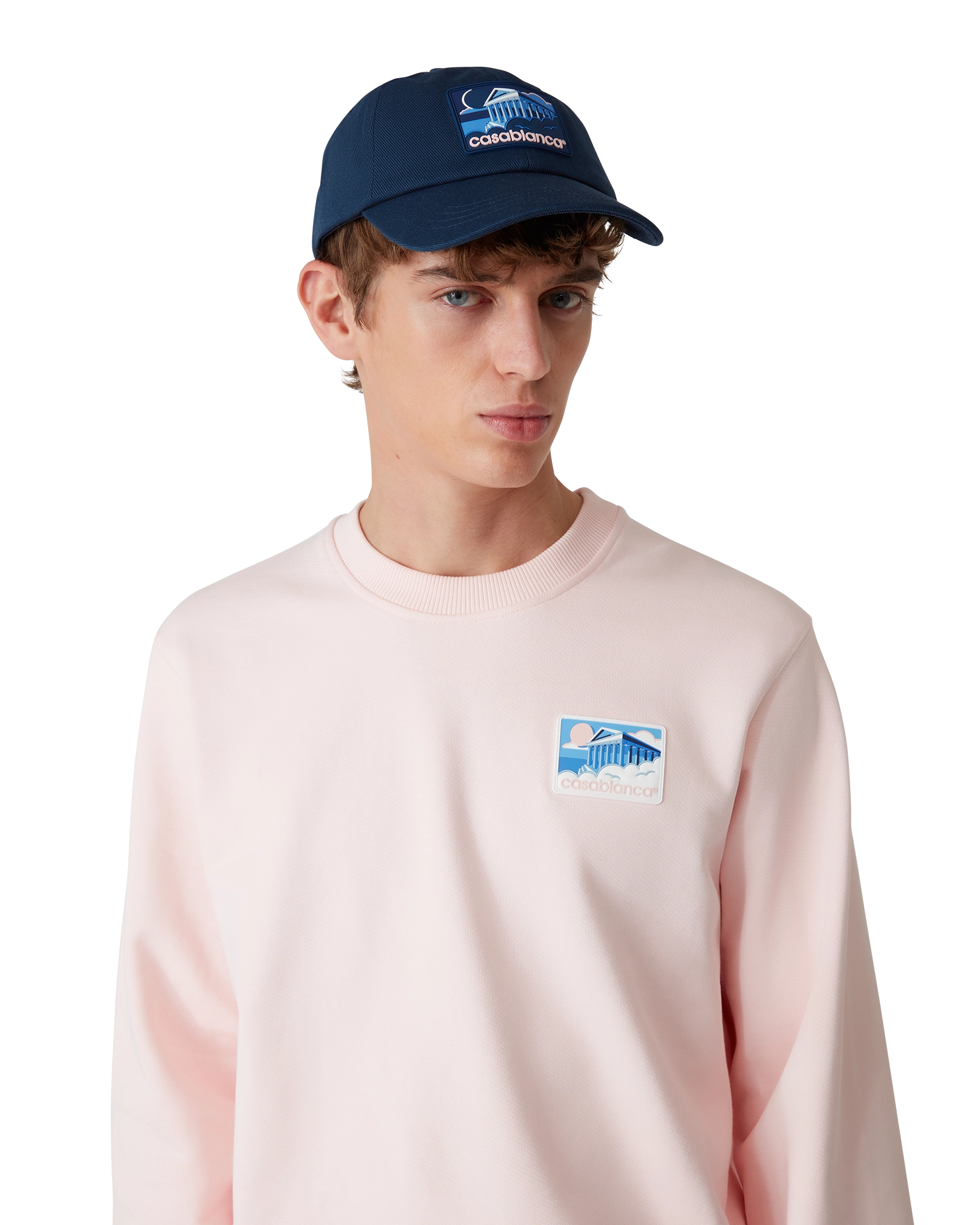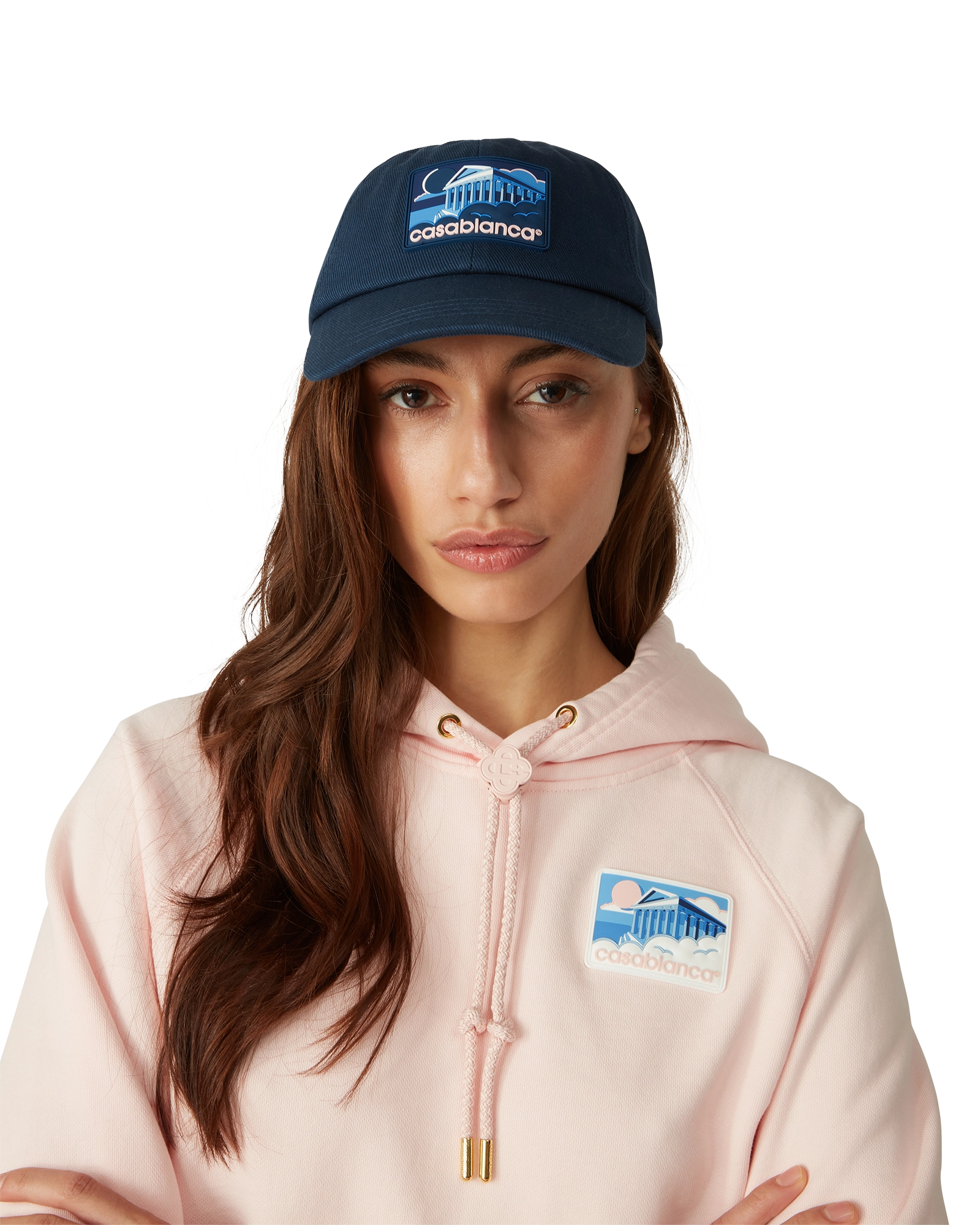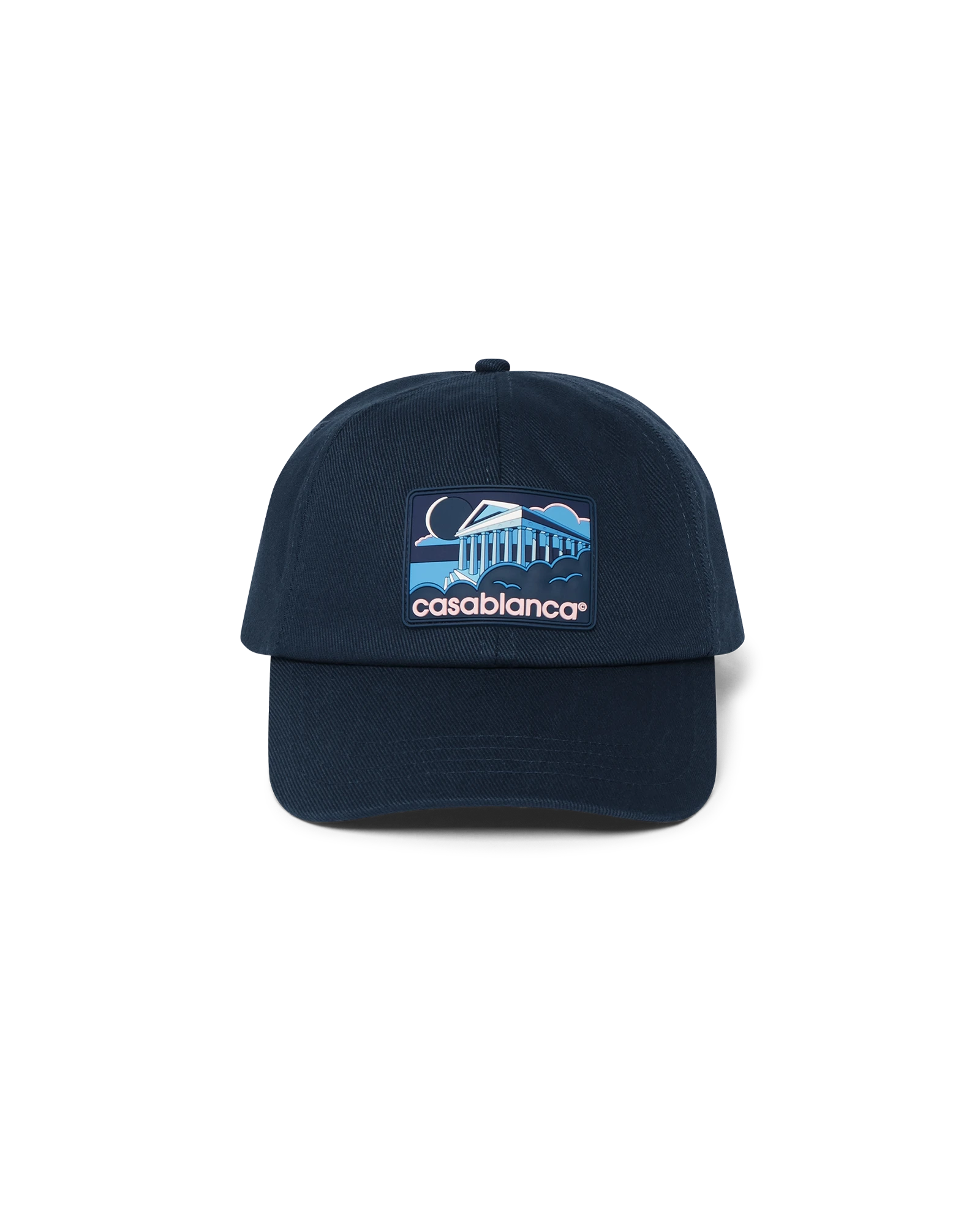 The Greek temple cap is a classic baseball style crafted from cotton fabric and features a silicon patch featuring seasonal artwork. Completed with a peak and gold-plated adjustable buckle.