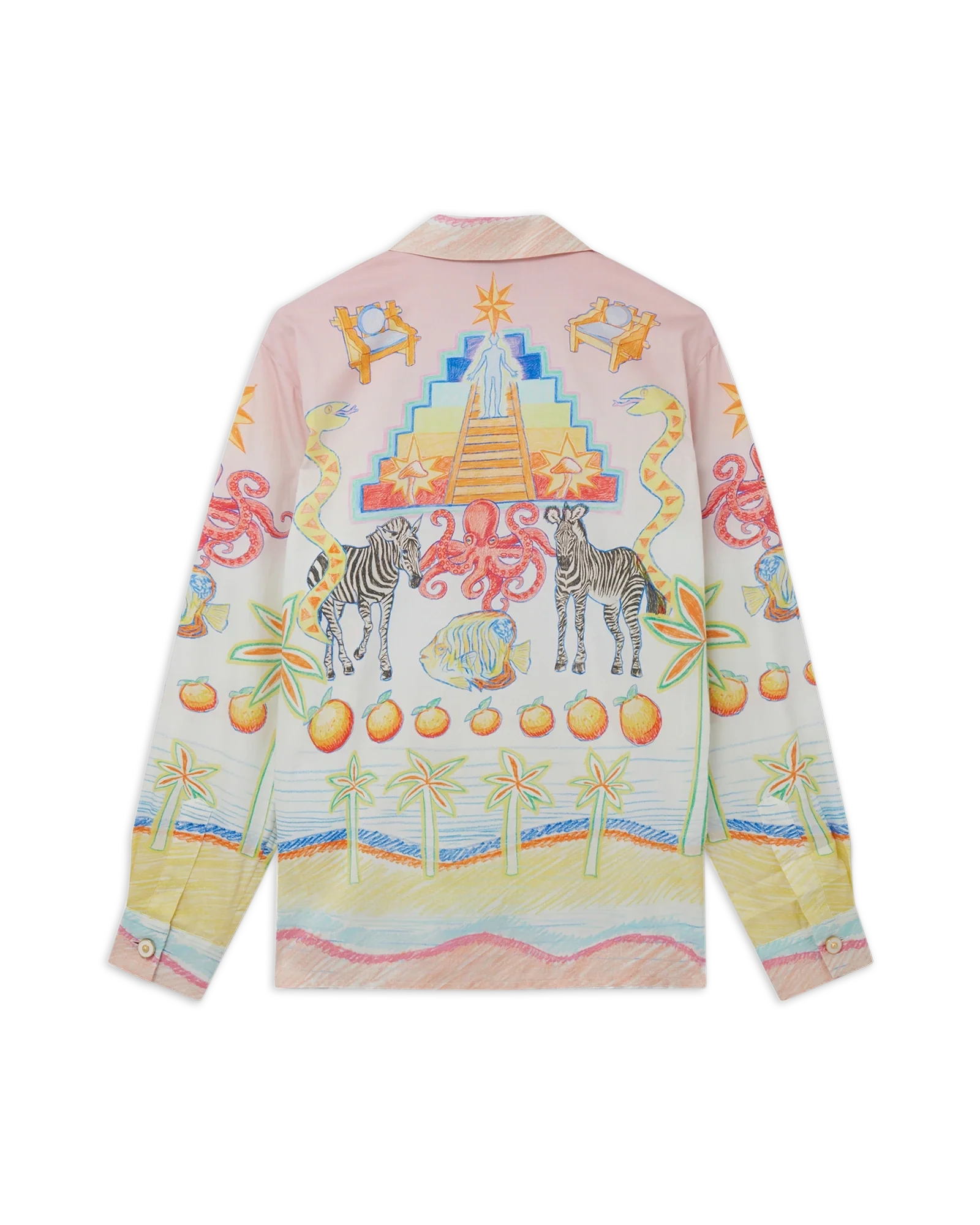 The L’Arbre De Vie cuban collar linen shirt is a printed long-sleeve style featuring an effervescent take on an evocative landscape scene inspired by Mexican artist Pedro Linares. fantasy creatures depicted in kaleidoscopic colours are a form of spirit animals. Finished with an intended open collar. Casablanca Paris branded label. front button closure and signature gold rim pearl buttons. designed for a relaxed fit.